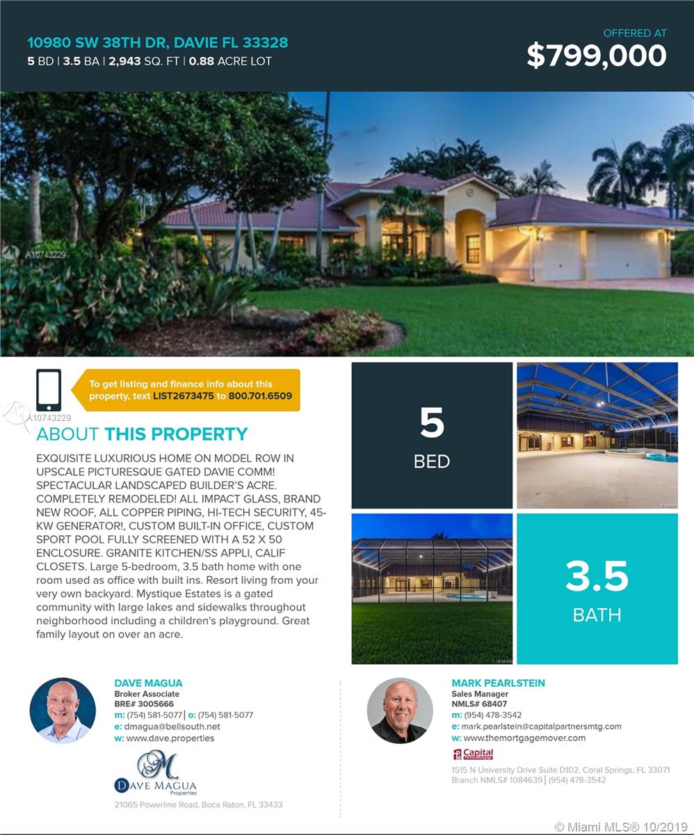 EXQUISITE LUXURIOUS HOME ON MODEL ROW IN UPSCALE PICTURESQUE GATED DAVIE COMM! SPECTACULAR LANDSCAPED BUILDER’S ACRE. COMPLETELY REMODELED! ALL IMPACT GLASS, BRAND NEW ROOF, ALL COPPER PIPING, HI-TECH SECURITY, 45-KW GENERATOR!, CUSTOM BUILT-IN OFFICE, CUSTOM SPORT POOL FULLY SCREENED WITH A 52 X 50 ENCLOSURE. GRANITE KITCHEN/SS APPLI, CALIF CLOSETS. Large 5-bedroom, 3.5 bath home with one room used as office with built ins. Resort living from your very own backyard. Mystique Estates is a gated community with large lakes and sidewalks throughout neighborhood including a children's playground. Great family layout on over an acre.