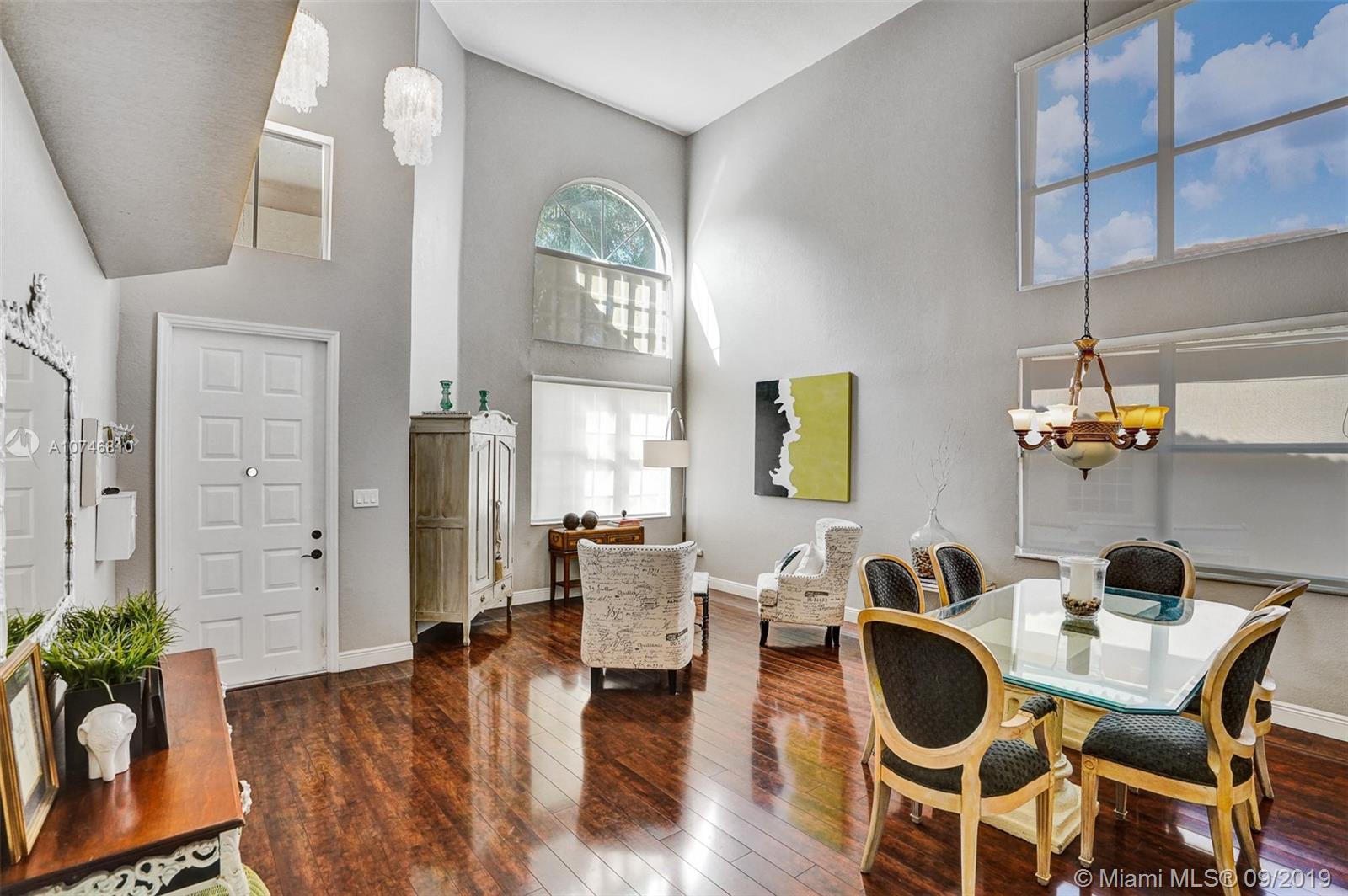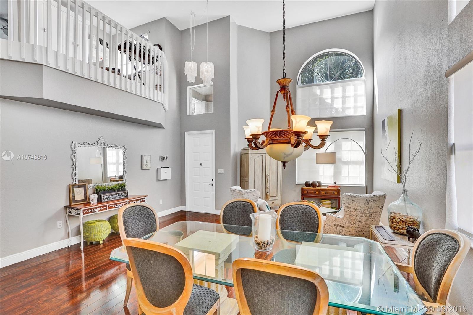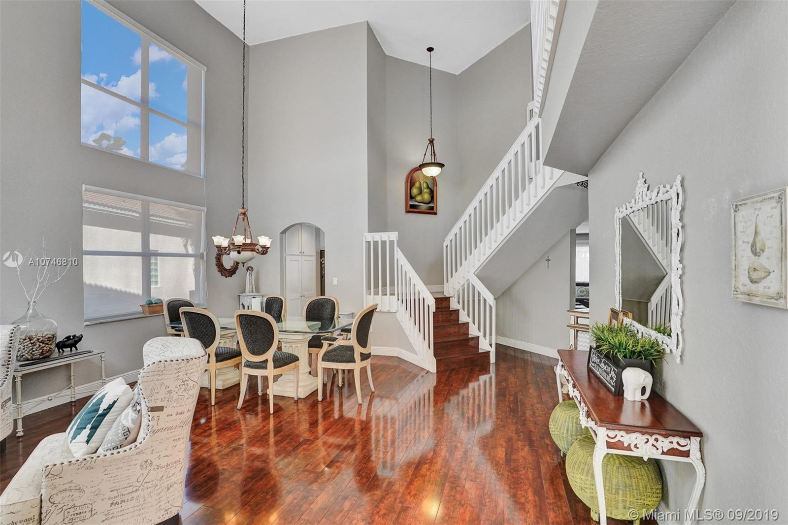 Unique & spacious floor-plan featuring high ceilings, bright interior & all laminate wood floors downstairs. Updated kitchen with high-quality cabinetry, pull-out shelves, stainless appliances & stone counters with seating for 5. Custom work space adjacent to kitchen & family room, downstairs bedroom & fully updated bath. 2nd floor boasts a large & open den/office space . Updated master bath, 3rd & 4th Bedrooms share a Jack & Jill bath. Relax in your private & fenced back yard oasis with solar heated pool and greenery, how about your own Mango tree? Storm protection throughout. Enjoy a care-free lifestyle with lawn care, sprinkler system, HD cable service, internet and ADT alarm monitoring service included. Emerald Estates is guard gated & ideally located, next to parks, shopping & schools