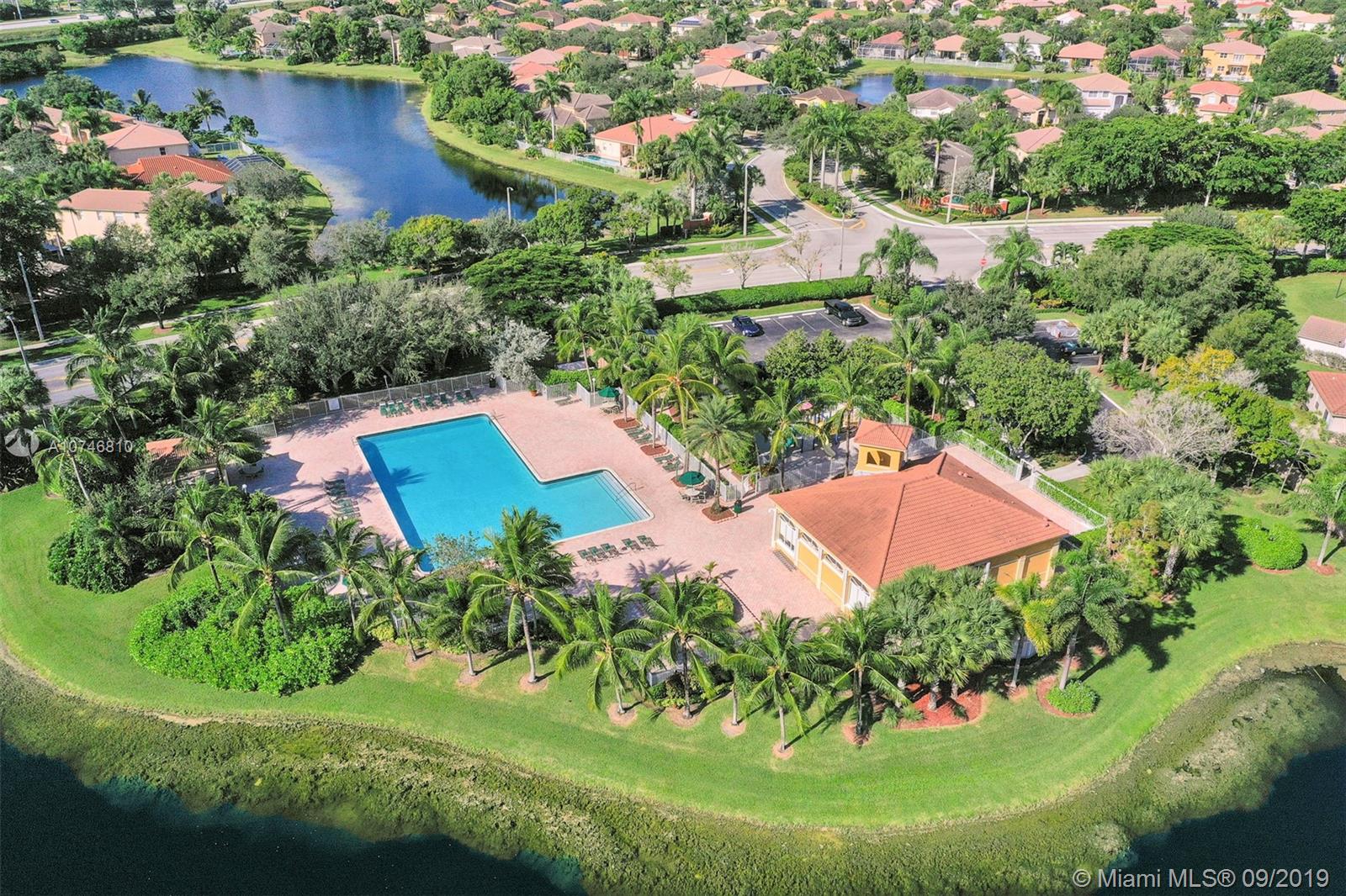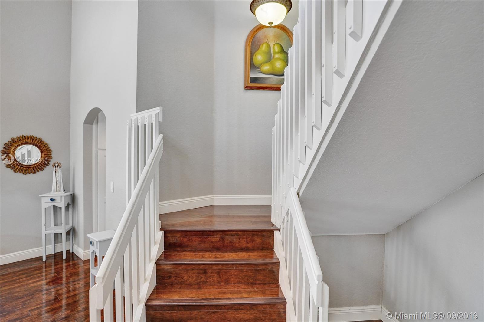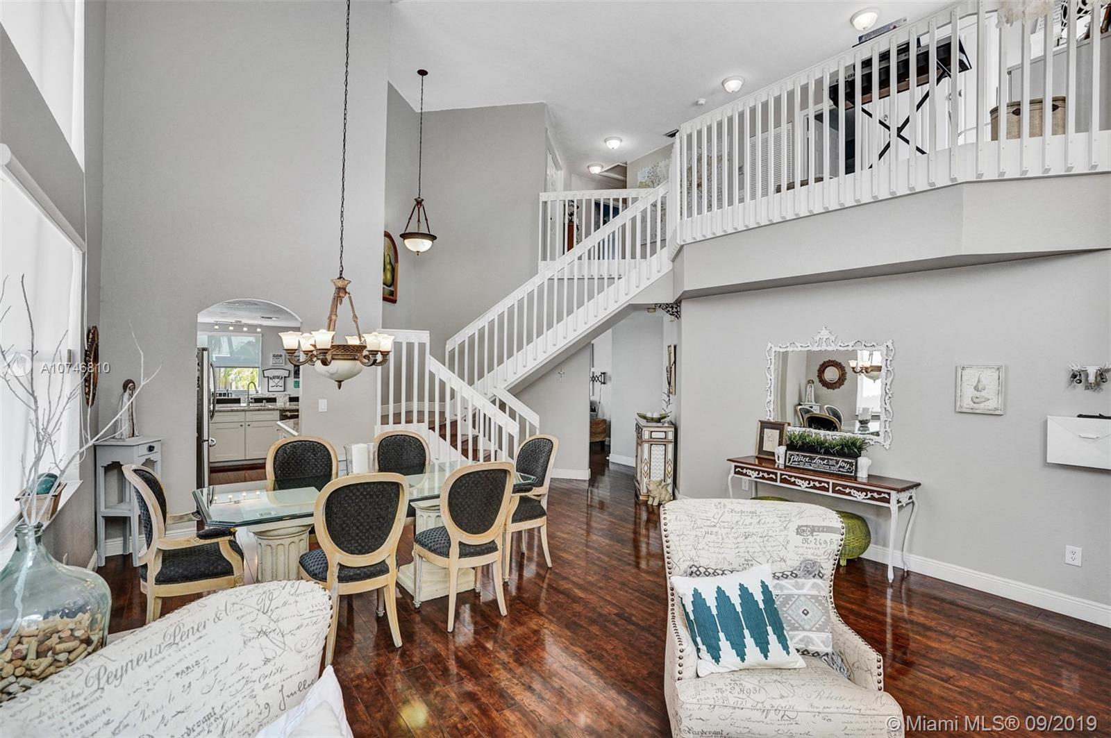 Unique & spacious floor-plan featuring high ceilings, bright interior & all laminate wood floors downstairs. Updated kitchen with high-quality cabinetry, pull-out shelves, stainless appliances & stone counters with seating for 5. Custom work space adjacent to kitchen & family room, downstairs bedroom & fully updated bath. 2nd floor boasts a large & open den/office space . Updated master bath, 3rd & 4th Bedrooms share a Jack & Jill bath. Relax in your private & fenced back yard oasis with solar heated pool and greenery, how about your own Mango tree? Storm protection throughout. Enjoy a care-free lifestyle with lawn care, sprinkler system, HD cable service, internet and ADT alarm monitoring service included. Emerald Estates is guard gated & ideally located, next to parks, shopping & schools