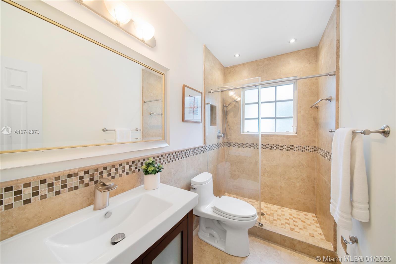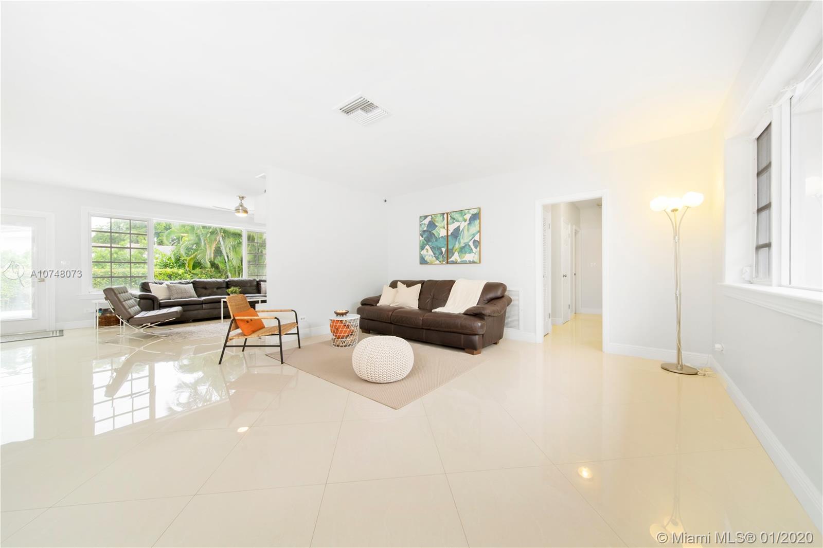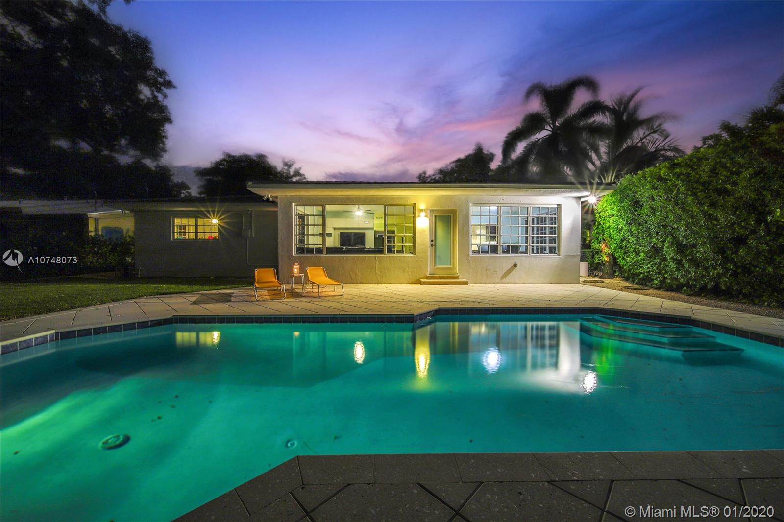 Welcome to East Shores Mid-Century Oasis, a most unique modern ranch home just steps from the bay in one of Miami Shores’ most desirable locations. This may be one of the largest two bedroom homes around, with great flow and wide open living-dining, bespoke office space and a Jenn-Air stainless steel gourmet kitchen perfect for entertaining- all overlooking manicured gardens and custom salt-water pool with entertainment patios. The oversized master suite has large double closets and a bright bathroom with separate tub and shower. All with mid-mod character galore: sleek architectural lines, modern brick details and an inviting entry courtyard, plus updates you’ll appreciate: new roof, AC, water heater, and sprinkler system. Come feel the breeze in your own private MiSho retreat!