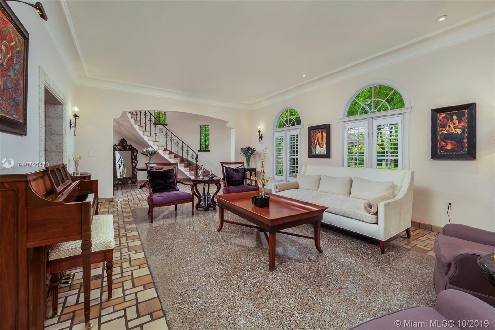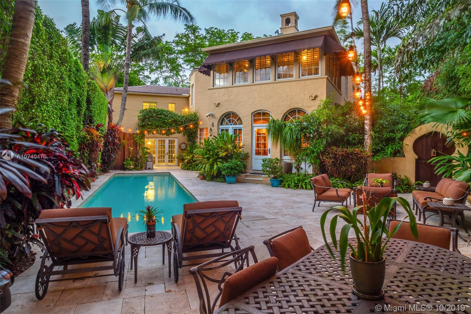 The grandeur of this historic gem spreads throughout the 4,326 sf of living space. An impressive rotunda entry showcases a winding marble staircase. Detailed wood scroll and mill work add elegance to the 4 bedroom and 6 bathroom layout. Adding to the splendor are Moroccan sconces, high beamed ceilings, arched windows, and a carved stone fireplace. The lavish master bedroom and bathroom with custom tile are a delight, and the upgraded kitchen has modern features that complement the unique design. Relax in the sunroom or entertain guests in the spacious formal living and dining space. A game room with pool table leads outside to a lush private garden that surrounds an inviting stone patio and pool. Located in the heart a Coral Gables, downtown City Beautiful is a short walk away.