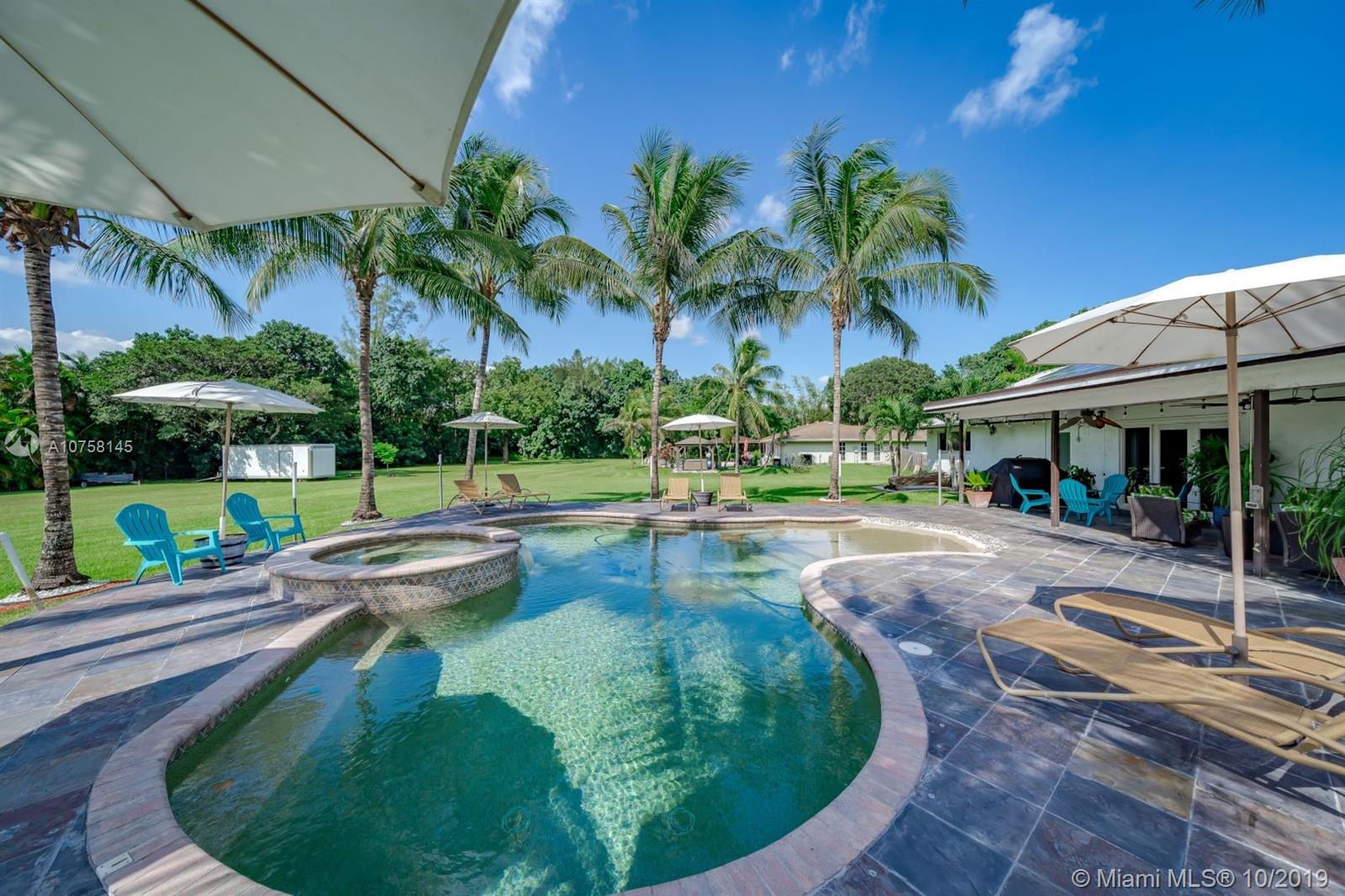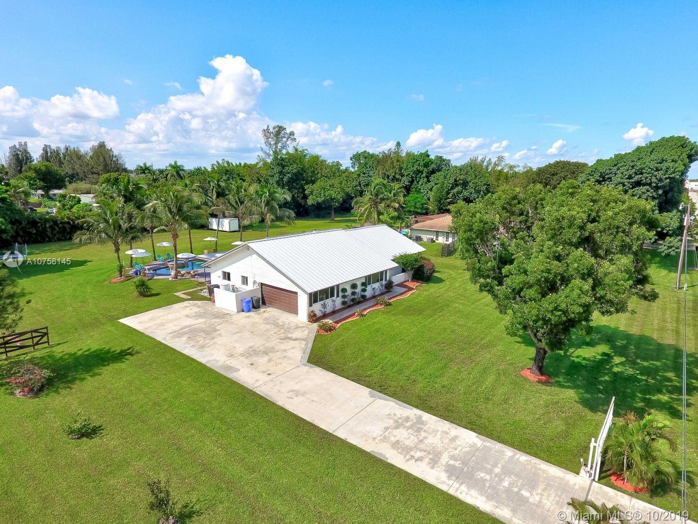 Amazing 1.19 acre 3 bedroom 2 bath home in Southwest Ranches! Completely upgraded, entertain friends and family with custom designed heated pool with salt chlorinator, new 80 year plus Metal roof, new completely renovated master bathroom, home theatre room, impact windows and doors for hurricane protection, Travertine marble floors. If you like working out, this home features a complete commercial grade gym with all the equipment (not included but negotiable). Tons of storage space including storage in attic with subflooring, and 12x24 container/shed. All furniture is negotiable. Don't pay for water, this home includes deep well water pump with water softener, also a shallow well for possible irrigation system. Save electricity with 44 solar panels, and much more, come see it now!