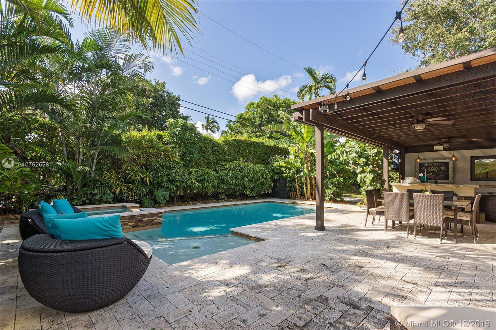 BEAUTIFUL 4 BEDROOM + DEN WITH 3 FULL BATHS IN THE HEART OF MIAMI SHORES. SPACIOUS DINING AND LIVING AREAS OPEN TO PRIVATE FENCED YARD WITH RESORT STYLE POOL, JACUZZI, OUTDOOR KITCHEN AND PERGOLA - PERFECT FOR YEAR ROUND ENTERTAINING. LARGE KITCHEN WITH EATING BAR, MARBLE COUNTERTOPS AND GOURMET APPLIANCES. SPLIT BEDROOM LAYOUT WITH ORIGINAL MASTER-ENSUITE BATH AS WELL AS GARAGE CONVERSION THAT INCLUDES NEW MASTER BEDROOM, BATH AND DEN/OFFICE. UPDATED ELECTRICAL, PLUMBING, A/C, SEPTIC, ALARM AND BUILT IN AUDIO SYSTEM. TREE-LINED STREET, WALKING DISTANCE TO SHOPS, PARK AND MORE.