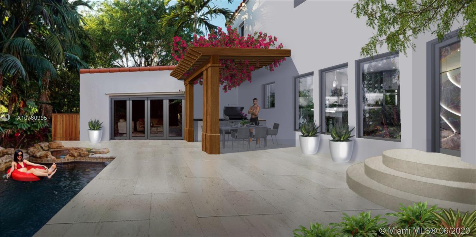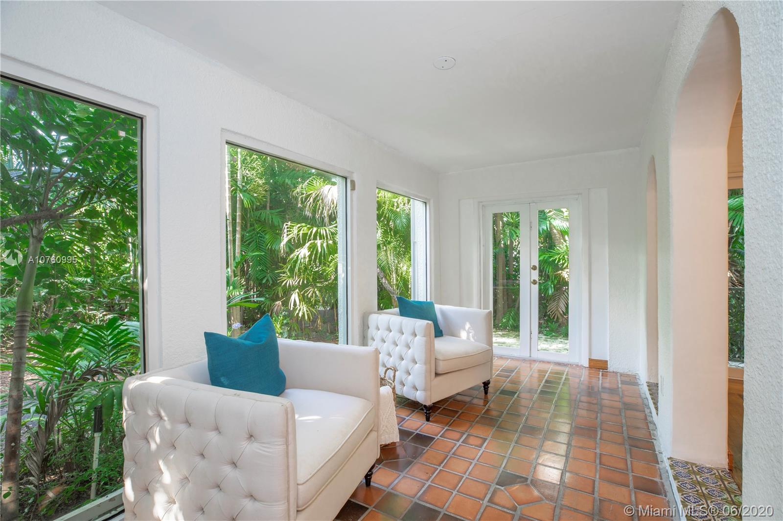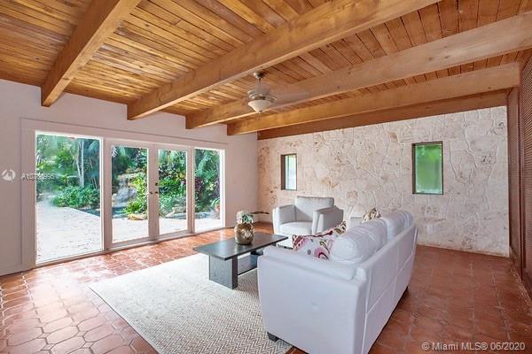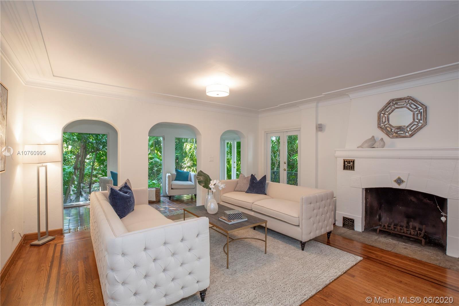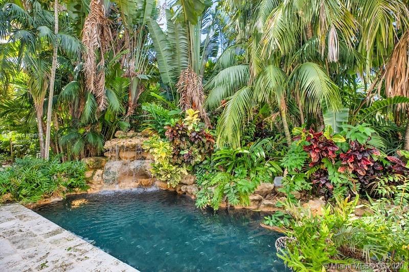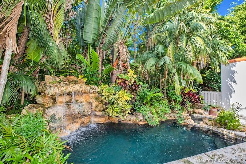 Centrally located retreat is larger than you think! This charming and gated 1930's Gables home boasts 5 bedrooms, 4.5 bath + home office. Escape the hustle and bustle and enjoy this tropical, peaceful Miami oasis. High ceilings, wood floors, cozy fireplace and lots of surprise alcoves like a wine bar off the living room make this home an unexpected rare find! Wide open living space leads to peaceful sunroom with floor to ceiling windows overlooking lushly landscaped yard. The heated pool and spa feature a cascading tropical-style waterfall that is a beautiful focal point. Bring your toothbrush and move in or consider some minor renovations to open up the floor plan even more - see renderings included with photos. Owner will include plans with purchase. Spacious guest house.