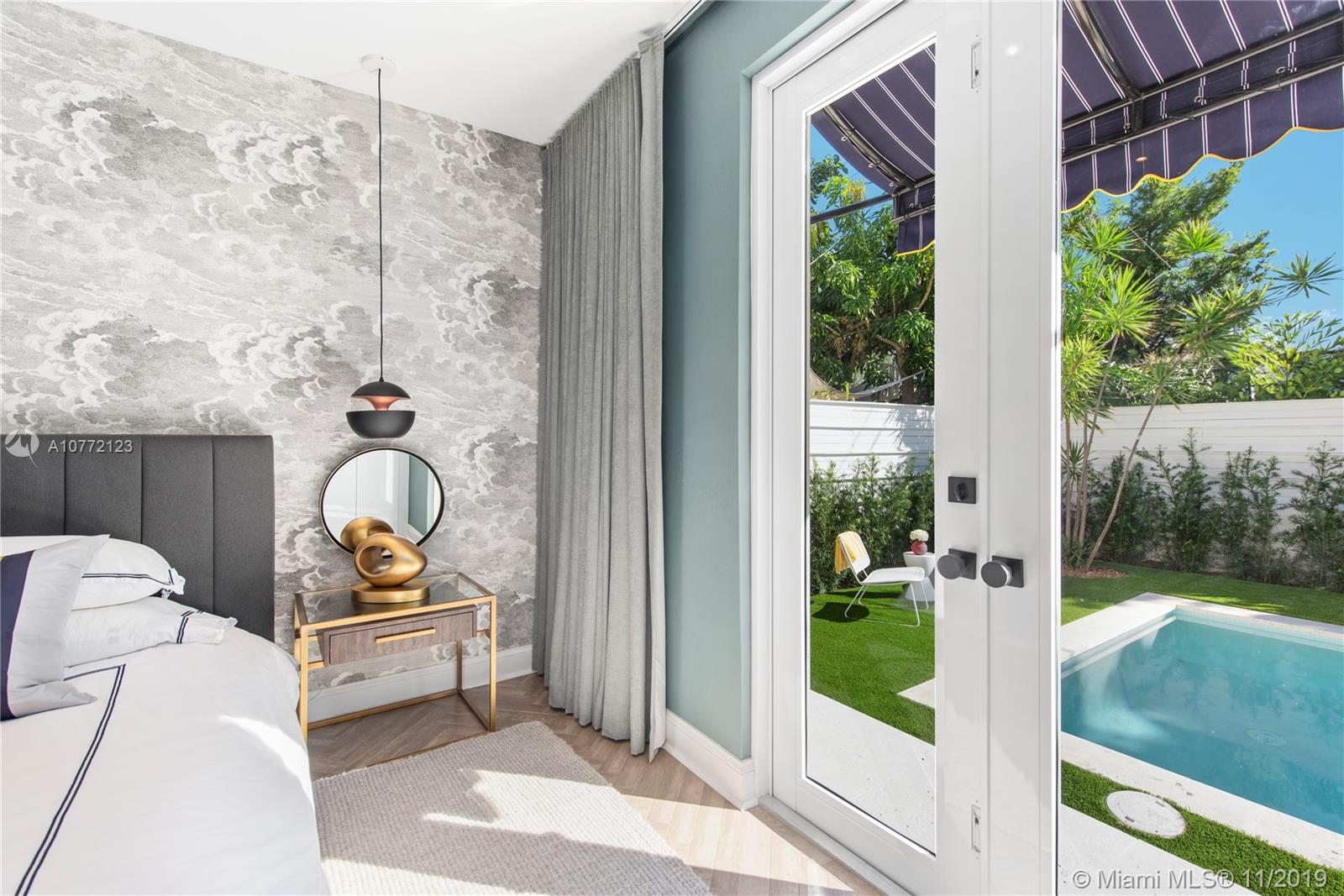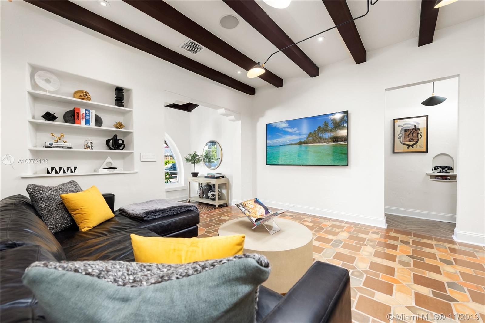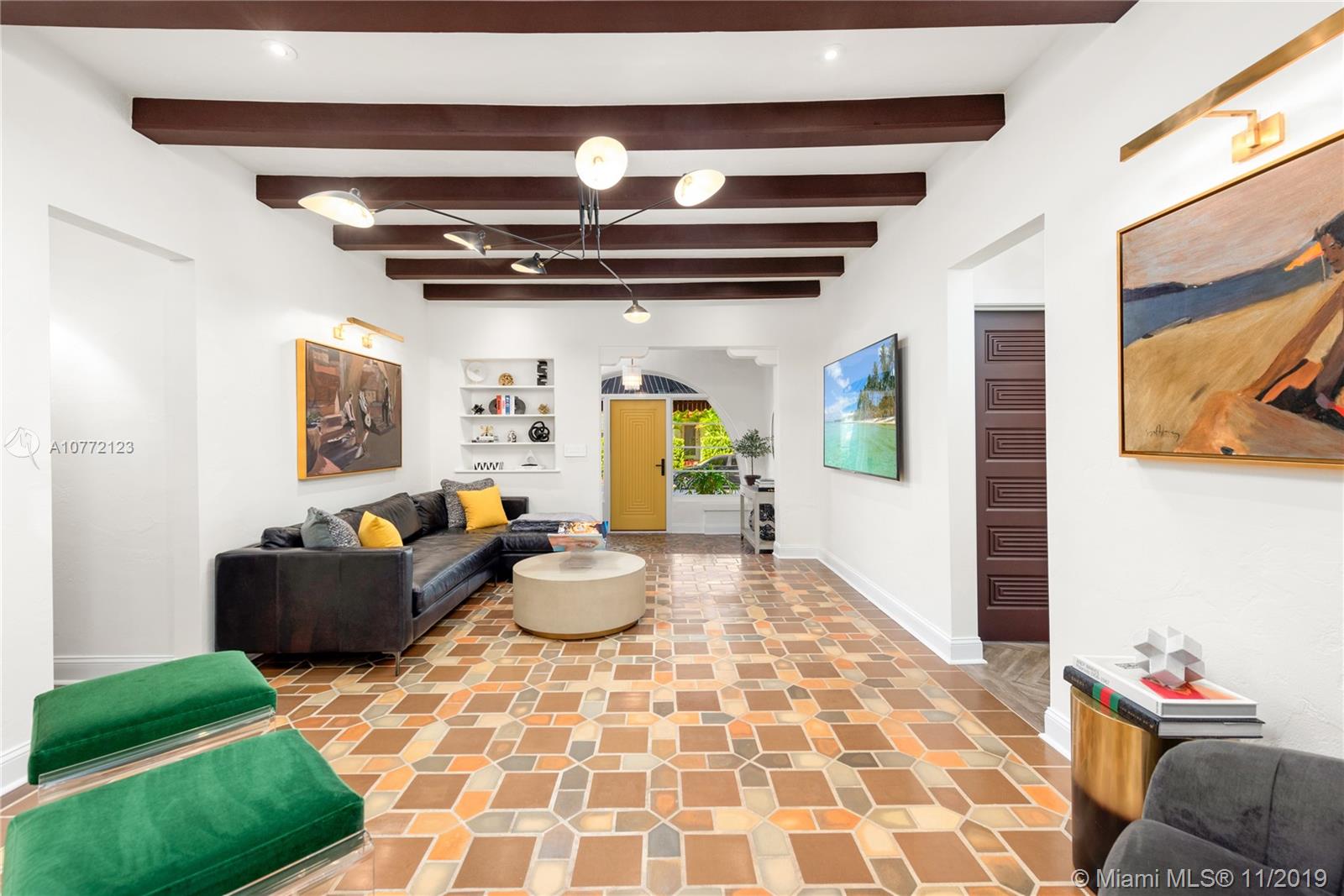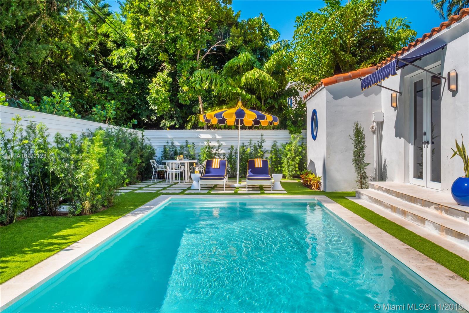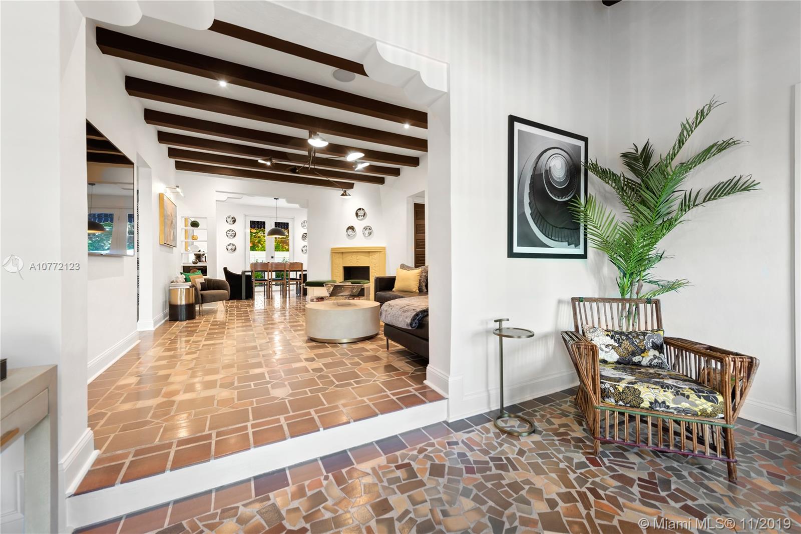 Med-Deco architecture in Miami Beach, Recently Featured in Elle Decor, 3 bed 2.5 bath home on the coveted Española Way, a quiet closed street, short walk to South Beach's hottest spots. Designed by Award-winning designer Alex Alonso. Extensive total renovation of all the interior and exterior spaces. The original tile floors, beamed ceiling, and Art Deco fireplace have been lovingly restored. It boasts a Bertazonni Italian Kitchen, Phillippe Starck and Porcelanosa bathrooms, custom Italian-style cabinetry and wardrobes throughout, wood herringbone floors, and a salinated modern pool that rivals Miami’s best boutique hotels. Meticulously sourced designer and custom furnishings and well curated artwork throughout .This luxurious chic home is being offered completely furnished and turn key.