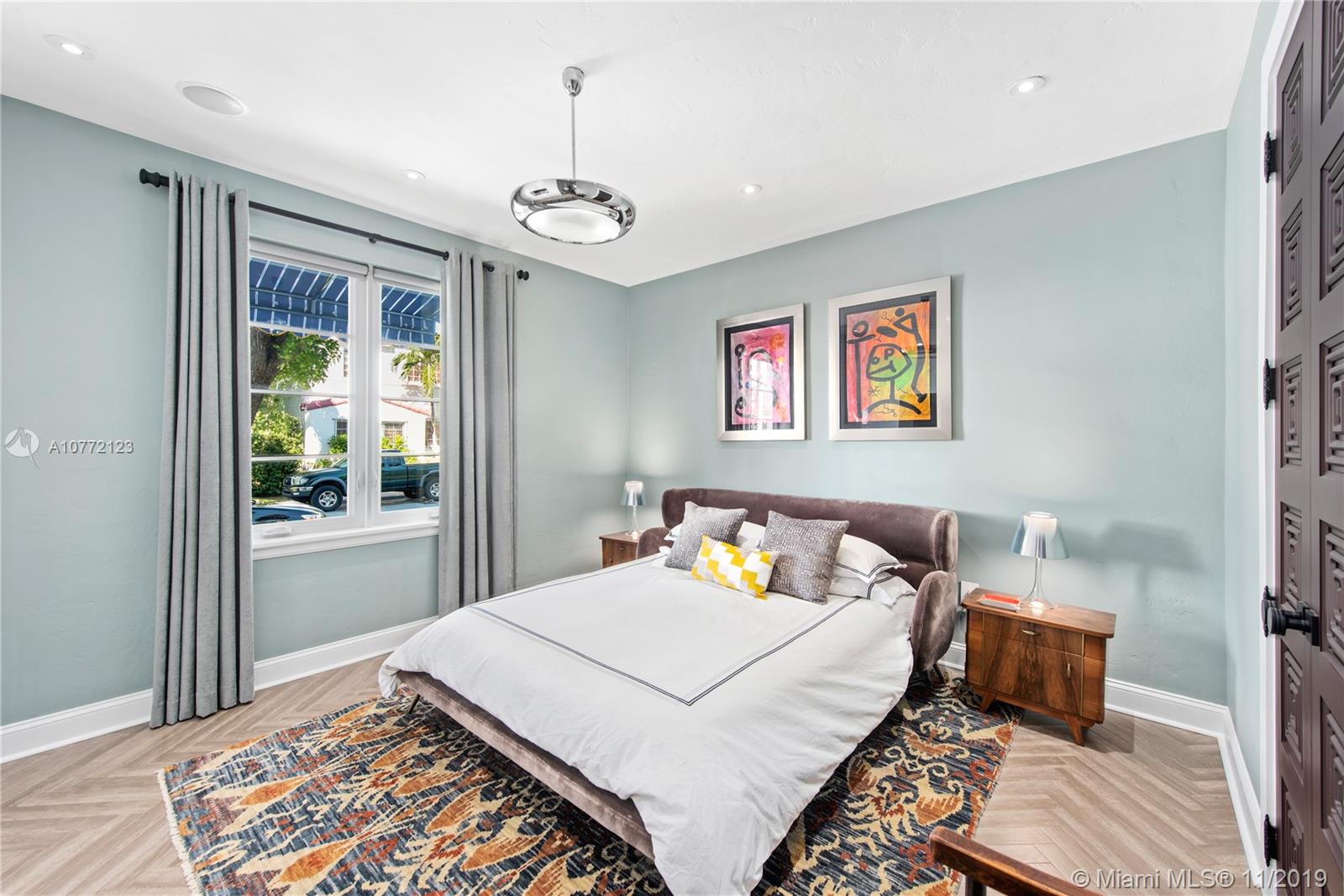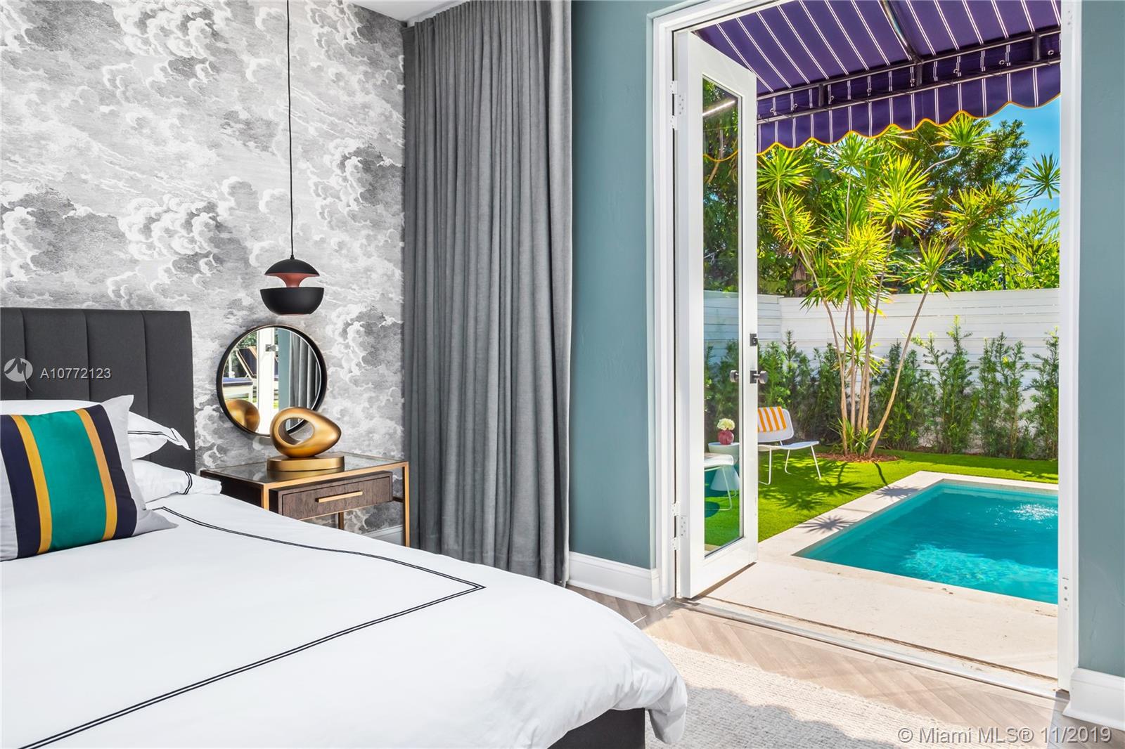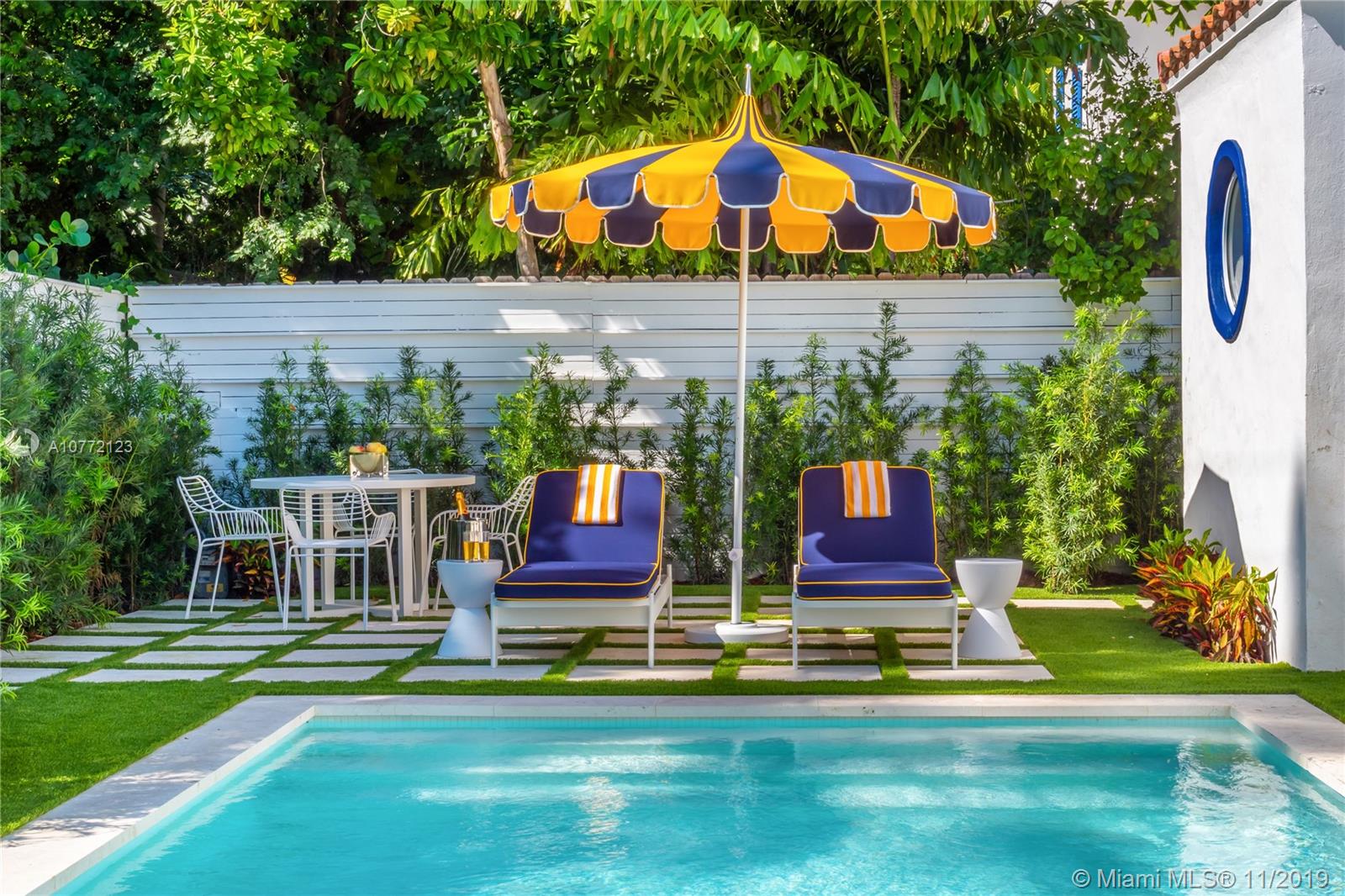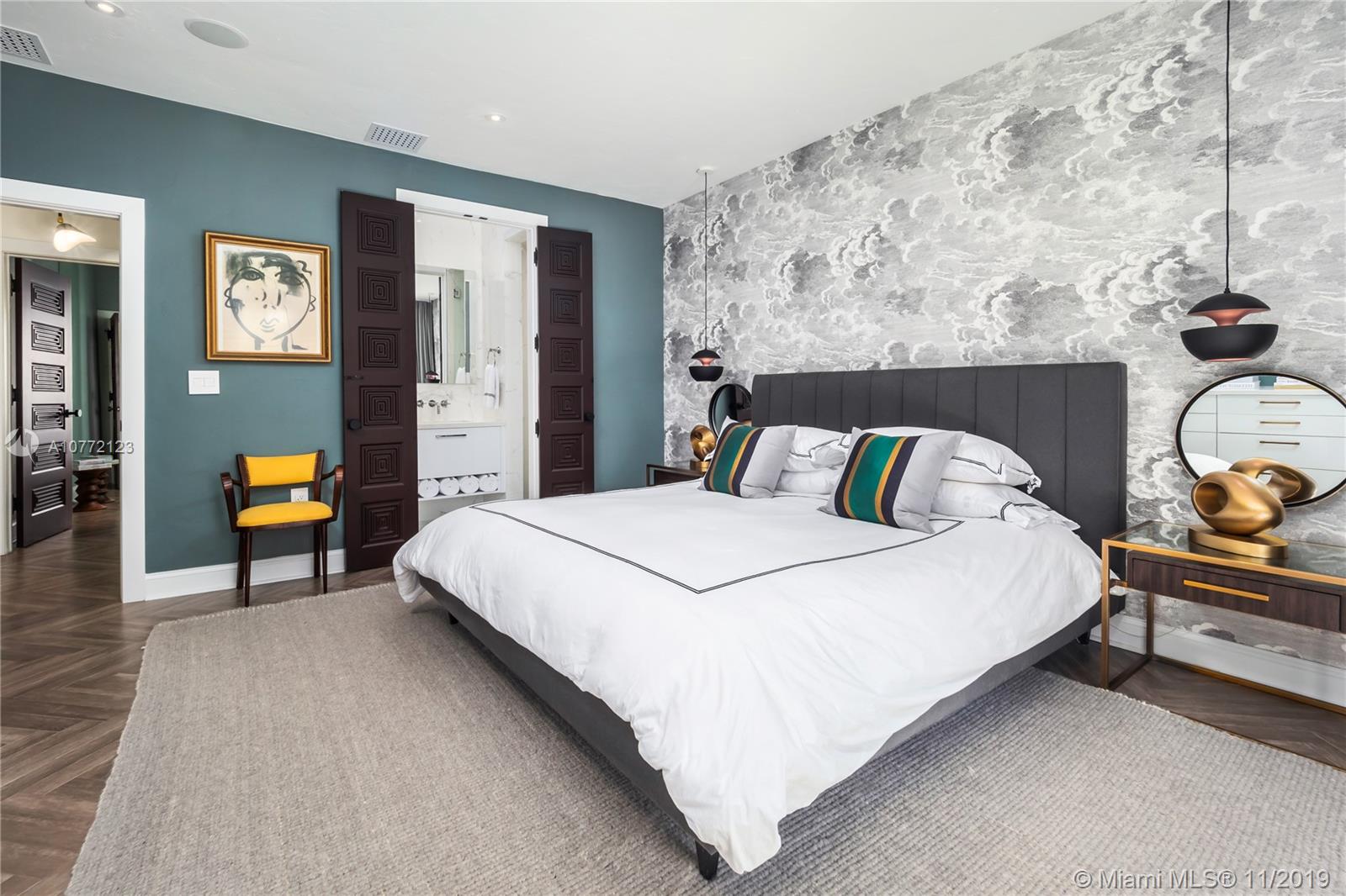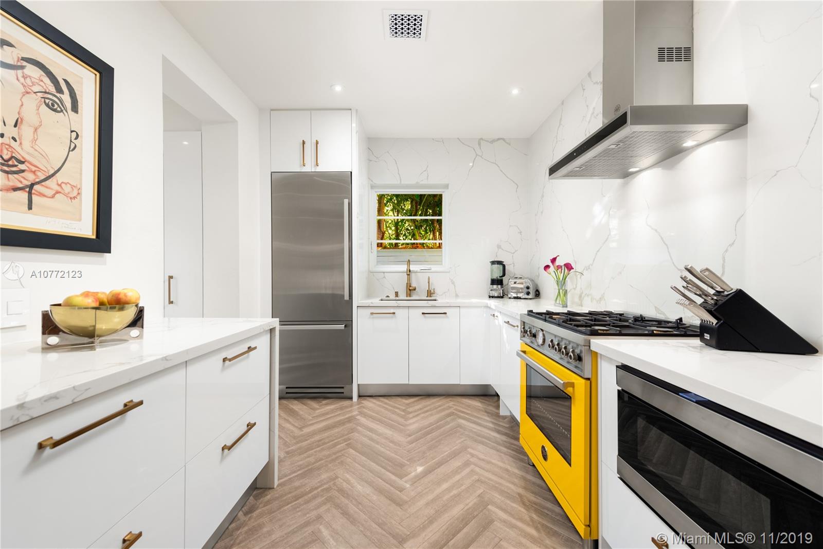 Med-Deco architecture in Miami Beach, Recently Featured in Elle Decor, 3 bed 2.5 bath home on the coveted Española Way, a quiet closed street, short walk to South Beach's hottest spots. Designed by Award-winning designer Alex Alonso. Extensive total renovation of all the interior and exterior spaces. The original tile floors, beamed ceiling, and Art Deco fireplace have been lovingly restored. It boasts a Bertazonni Italian Kitchen, Phillippe Starck and Porcelanosa bathrooms, custom Italian-style cabinetry and wardrobes throughout, wood herringbone floors, and a salinated modern pool that rivals Miami’s best boutique hotels. Meticulously sourced designer and custom furnishings and well curated artwork throughout .This luxurious chic home is being offered completely furnished and turn key.