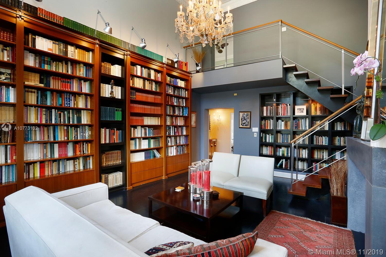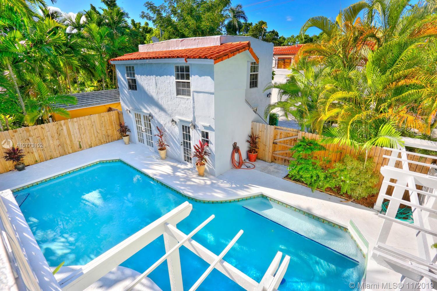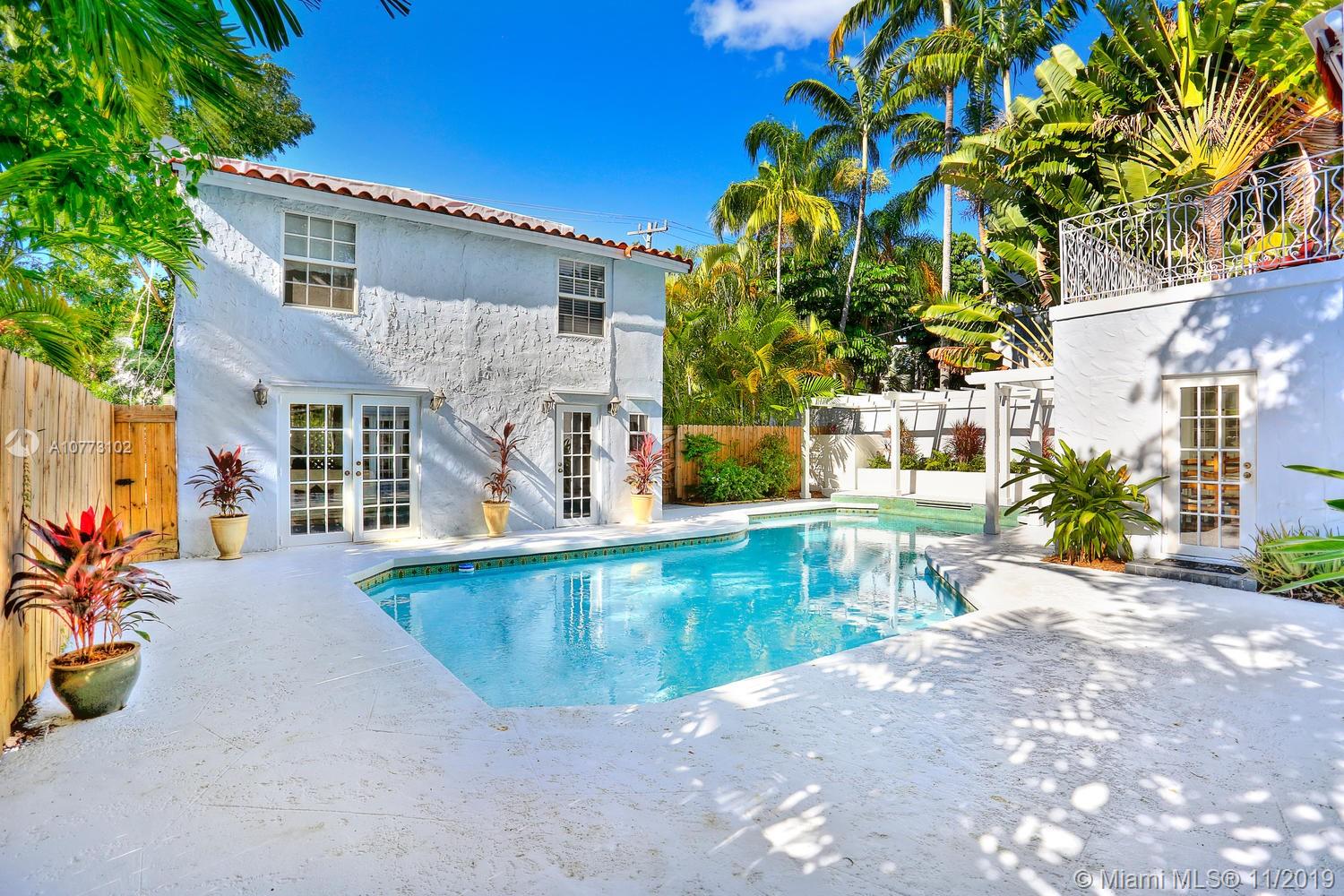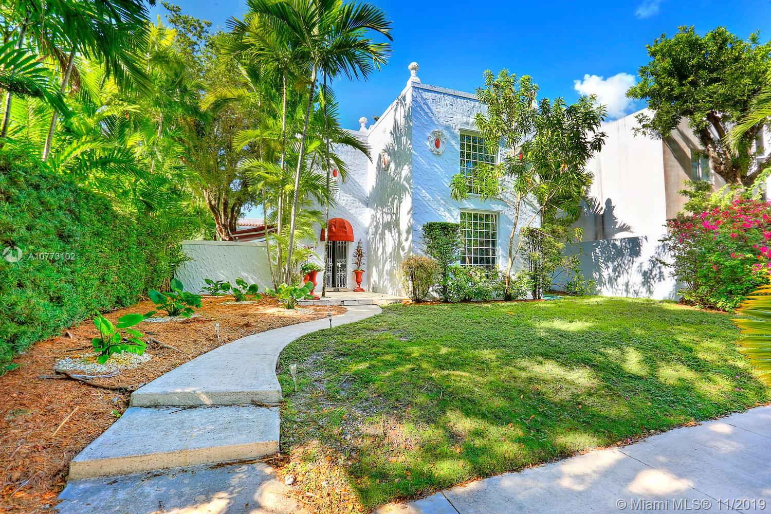 Elegant home in prestigious North Coconut Grove, just a short walk to bay front parks yet located at one of the highest sea-level elevations in South Florida. Stunning living area w/ 22 ft. ceilings, classic architectural details, fireplace, wood flooring & custom built-in mahogany library wall - creating a Manhattan brownstone ambiance. Large, light-filled formal dining room. French-country style kitchen features wood cabinetry, stone countertops, commercial quality gas range & sunny breakfast room. 2nd level (full floor) master suite w/sitting area, his & her baths, two walk-in closets and outdoor deck overlooking the tranquil pool & garden. Charming, 2-story guest house with two 1/1 suites (one up+one down). Walk or bike to the Grove village center’s galleries, boutiques & cafes.