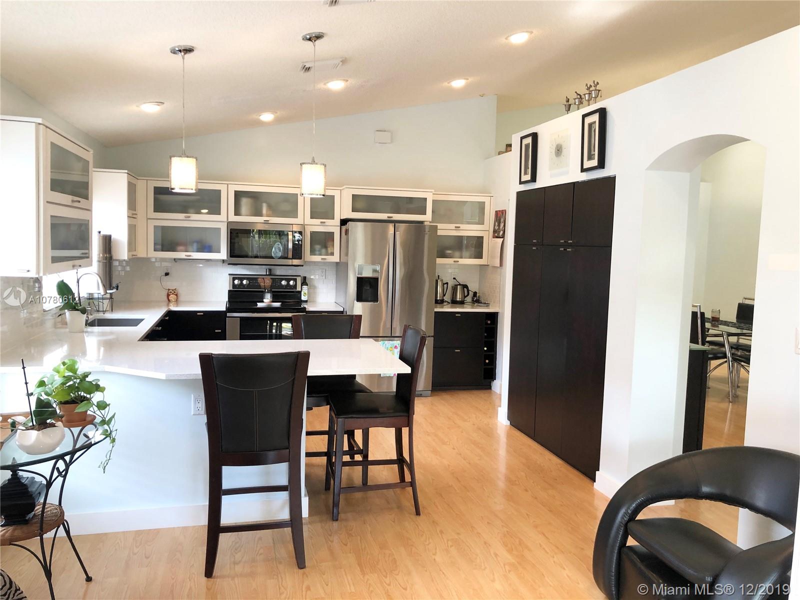 Amazing home in the heart of Pembroke Pines, 3bed 2bath + bonus room that could be use as 4th bedroom. Beautiful updated kitchen with upgraded counter tops, cabinets and appliances. Remodeled master bath, media built ins, cathedral ceilings with 2 skylights adding extra lighting, very open space and your own oasis backyard with outdoor jacuzzi included, beautiful palms for added privacy. Great family community with lovely amenities. Association fee, includes cable, front lawn internet, gate, and 24hr security patrol New AC inside and outside unit. location, location, Location (1854) total living sqft with adjusted 4th bedroom.