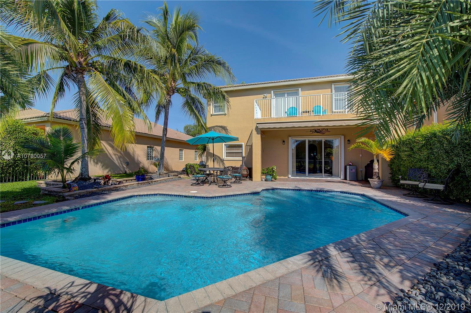 Grab your favorite beverage and enjoy the Sunrise and Sunsets from your master bedroom balcony overlooking wide lake views and your beautifully sparkling blue pool. Nestled in Ruby Cove at Emerald Estates, a gated Weston community, this 4 bedroom, 2 1/2 bath home is ready to move right in! Crown molding and upgraded baseboards throughout living area. Kitchen with granite and stainless appliances, open concept floor plan. Newer carpet, and tile flooring with interior neutral colors. Pool and Patio have a Sunsetter awning for the ultimate in comfort. Full Hurricane accordion shutters. Full service community includes lawn maintenance & cutting, fertilizing, tree/palm trimming, weed prevention, sprinklers, alarm system monitoring, cable TV and internet, as well as a community pool and gym.