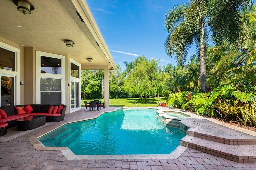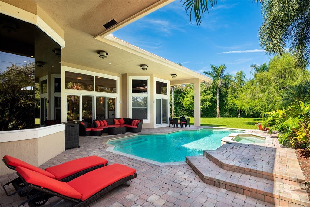 Custom transitional contemporary pool home on a very wide & private builder’s acre lot in the gated, luxe community of Blackhawk Reserve. Open, updated & inviting plan w volume ceilings, formal living & huge dining room, spacious family room w 2019 custom entertainment unit, eat-in kitchen overlooks big covered patio, pool & extensively landscaped grounds. Very large kitchen w island features newer appliances, Hansgrohe faucets, abundant counterspace, stylish cabinets & plenty of light. Huge Master suite & bath w his/hers walk-in closets. Split bedroom layout w 3 bedrooms each w adjacent baths, plus a cabana bath. Separate 5th bedroom/den just needs closet door. Impressive 2019 laundry room, impact widows/doors, newer AC's, oversized side load 3 car garage, smart home automation features.
