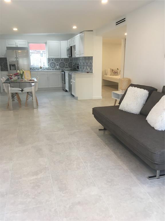 This fully remodeled pueblo style home is finished with designer touches throughout. Beginning at the open front courtyard step into the large open concept living-dining space. Your eyes are drawn to the spacious kitchen with beautiful modern quartz countertops and stainless appliances. Bathrooms are designed with clean lines and current color combinations. Recessed lighting throughout makes the space light and bright. The concrete patio area in the back feels like a private space to enjoy relaxing or entertaining outdoors. Located in the heart of it all! Close to the turnpike, I95, the beach, stadium, Hard Rock & more! Other features include a newer roof, new AC, Impact windows & doors and a 162 sq ft concrete storage room and fenced yard. Move in ready!
