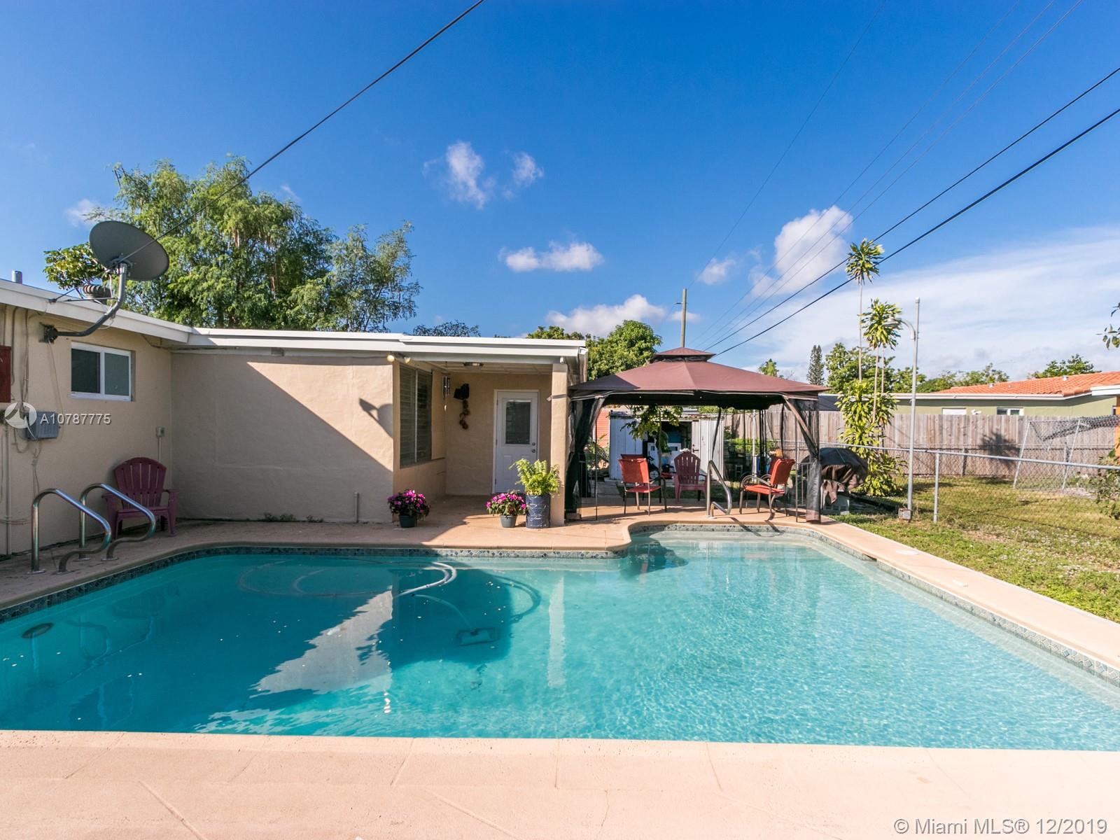 Come experience this beautiful home with 3 bedrooms, 2 updated bathrooms with a bonus room that can be used as storage or an office. Most windows are hurricane impact. Updated kitchen with Gas stove. New windows. Wood floors in the bedrooms and ceramic tile in the other areas. Laundry room with full size washer and dryer. Large pool outside with enough space to entertain. This home is perfect for a new family. Don't miss out on this one!
