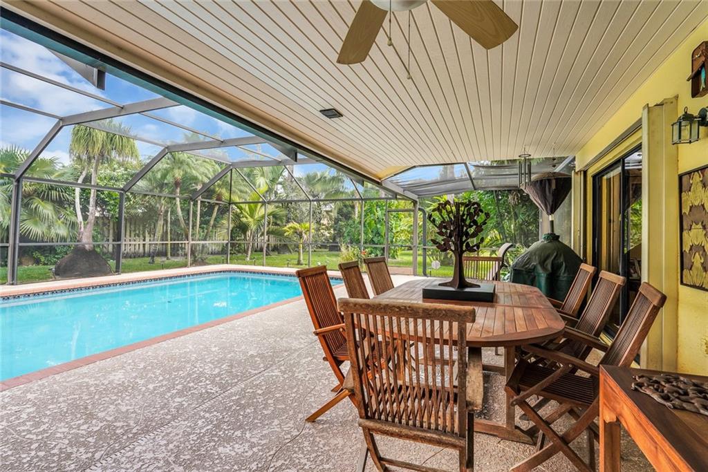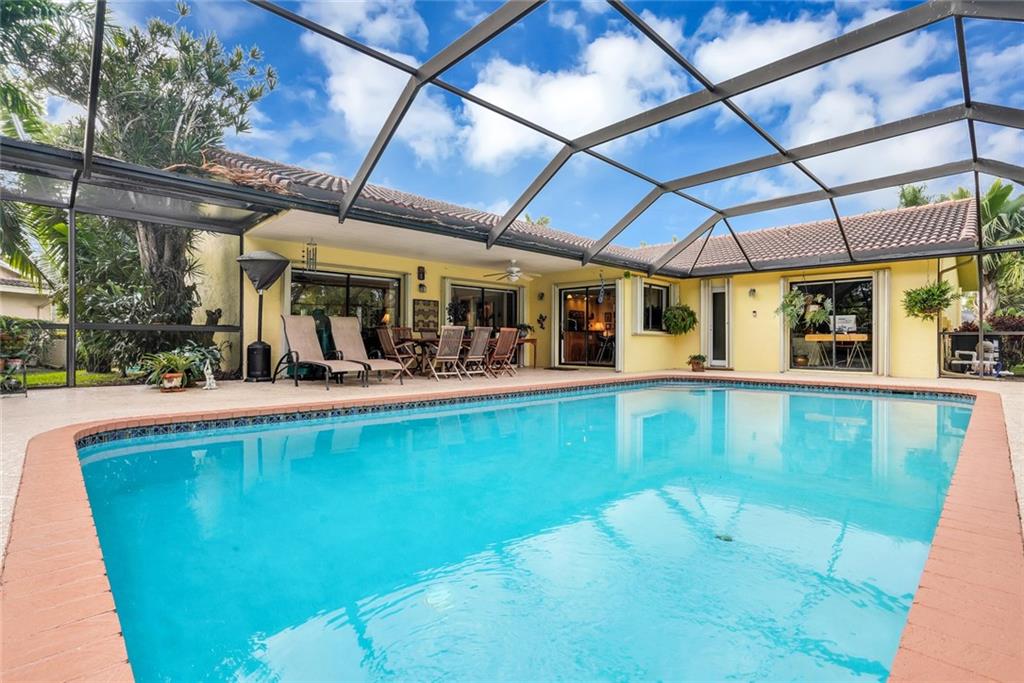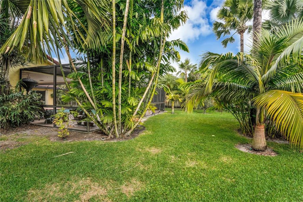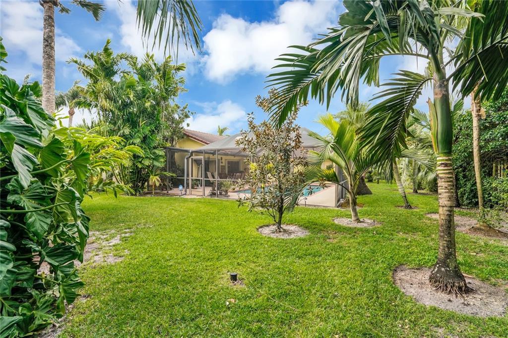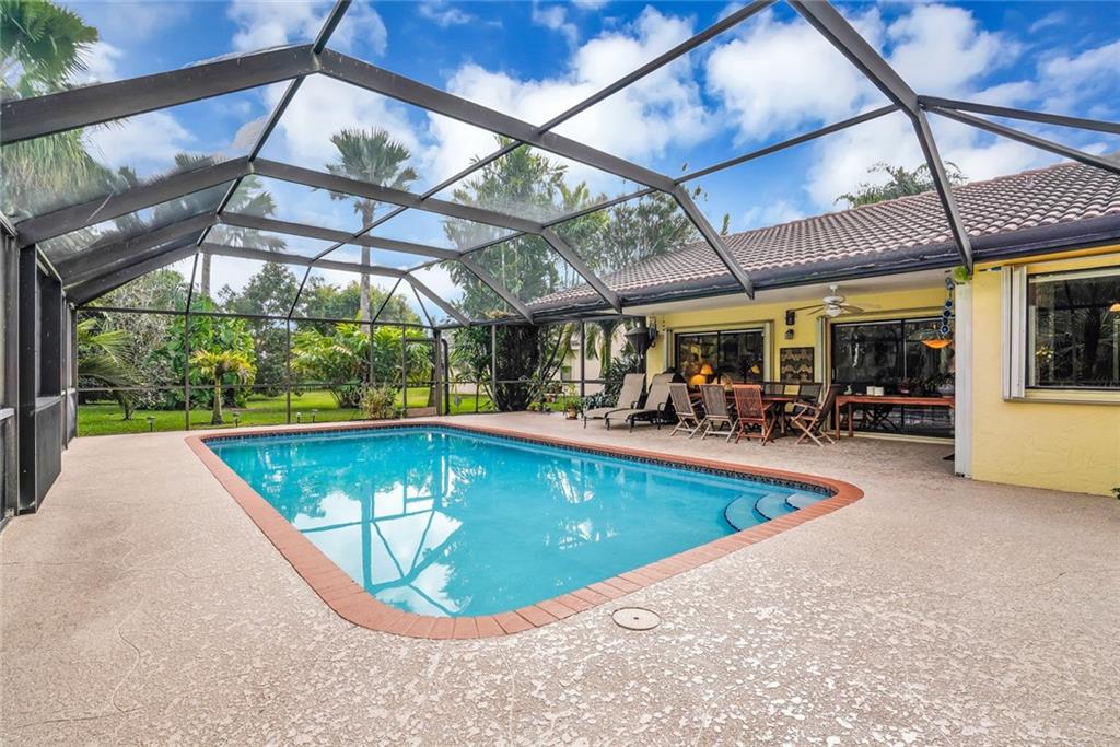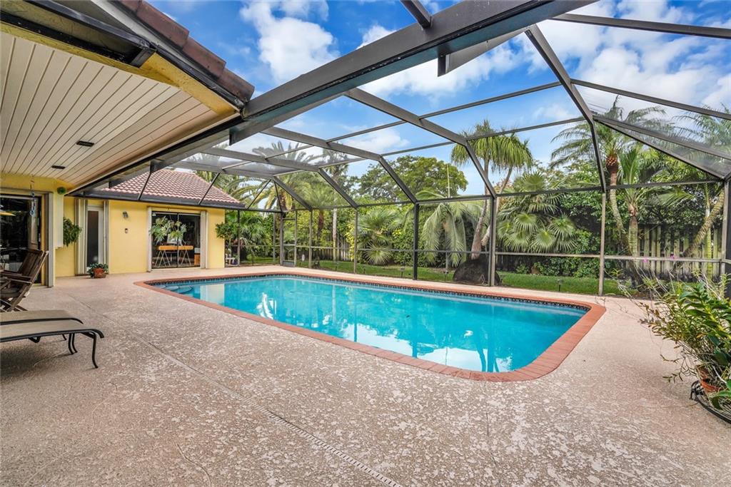 Fully updated home on an extra wide tropical lot in the back of a cul-de-sac for privacy & security. Lots of exotic trees and plants make for a true gardener's dream and tropical paradise. Featuring a split bedroom plan for privacy with generous sized bedrooms. Master bedroom features his & hers walk-in closets. Master bath features a double vanity and updated bathroom w/ frameless glass shower door. Kitchen features high end appliances including a GE Monogram fridge, modern real-wood cabinets, and granite counter tops. Tile & wood flooring throughout the house - NO CARPET! No HOA! NO POPCORN CEILINGS! 2nd bathroom has also been updated and has a cabana door leading out to the screened-in pool w/ updated deck & large covered area.