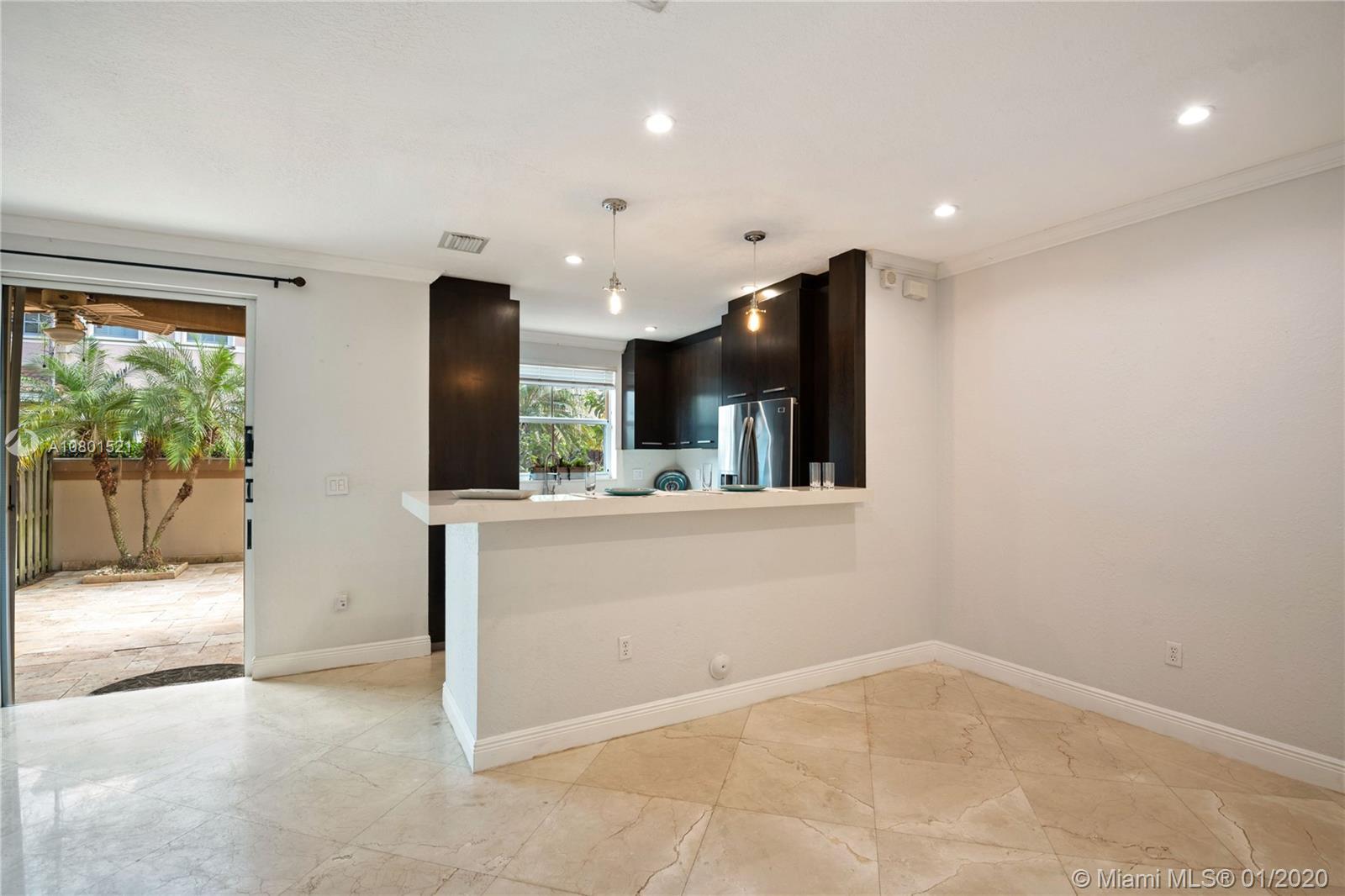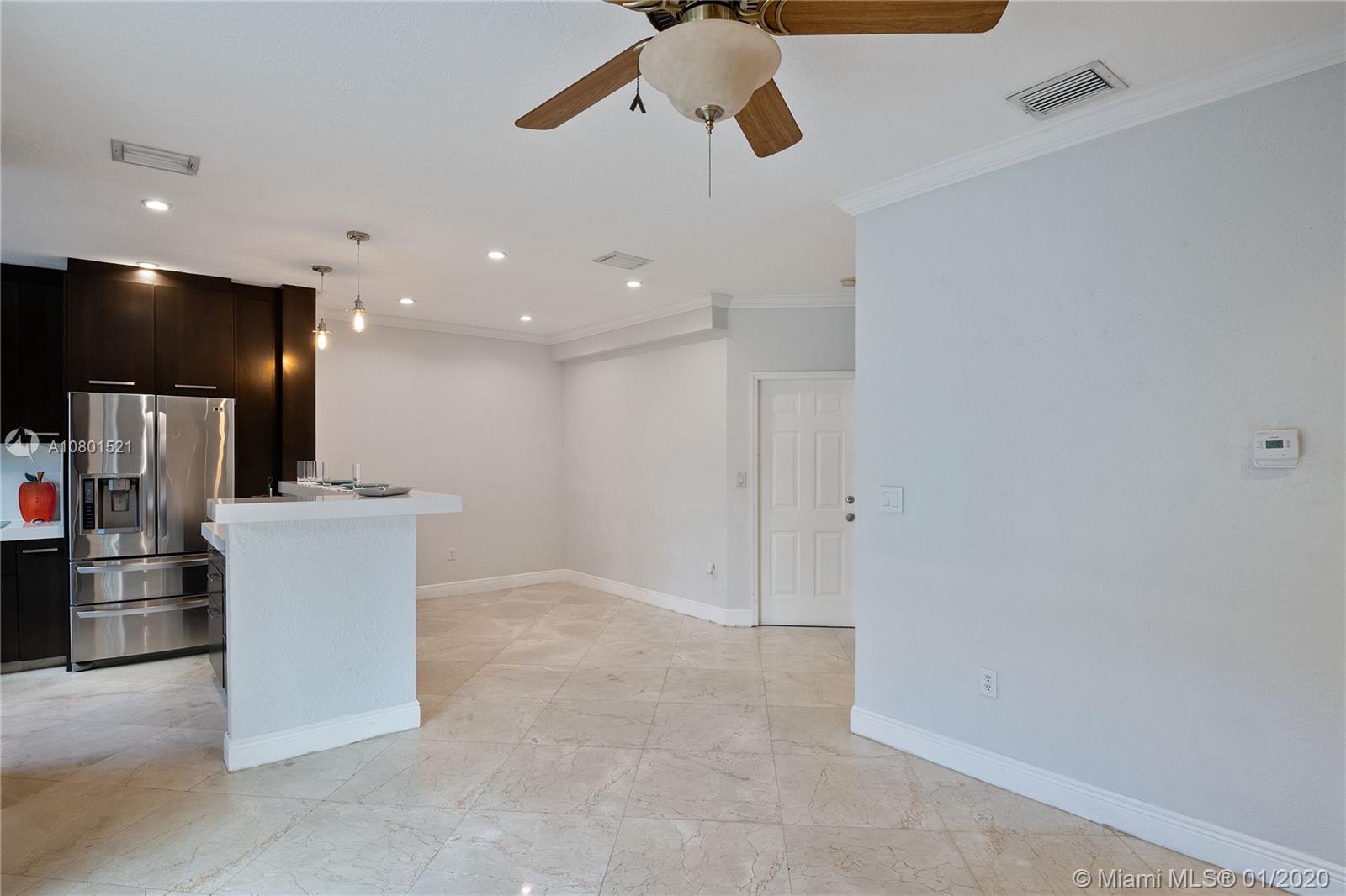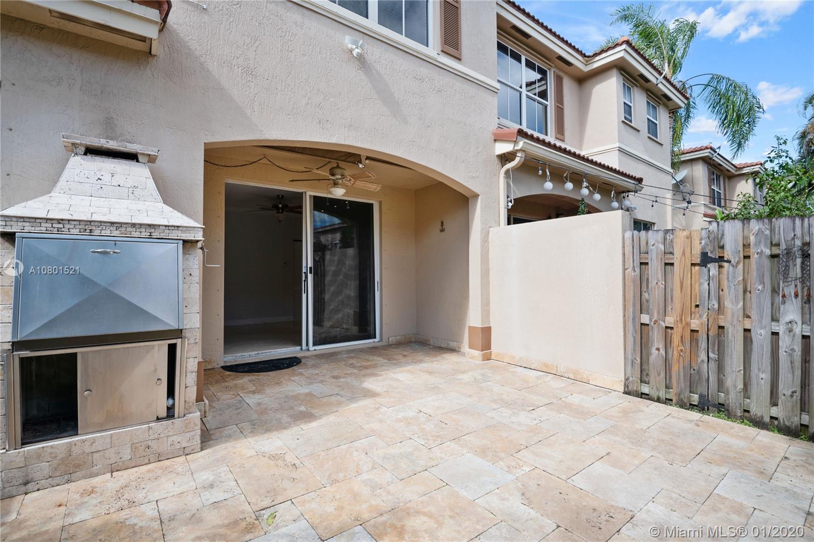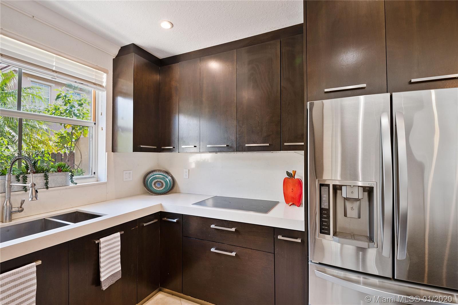 Substantially remodeled town-home featuring 2 master bedrooms with huge walk-in closets and 2.5 bathrooms. This spacious floor plan offers volume ceiling in formal living room; 24" porcelain tiles on diagonal moves you throughout. Travertine paver tiles on patio with covered area and argentines style BBQ. Faux stone accent wall and custom recessed lighting on family room. Beautiful kitchen with quartz counter tops, 42" cabinets, Miele electric cook-top, LG refrigerator, kitchen Aid combination wall oven and microwave. Laminated wood floor stairs. Master has a tastefully upgraded bathroom white dual sink vanity with marble top, frameless glass shower door and custom tile work. Crown molding all over. One car garage and 2 parking spaces. Community with private pool and child playground area.
