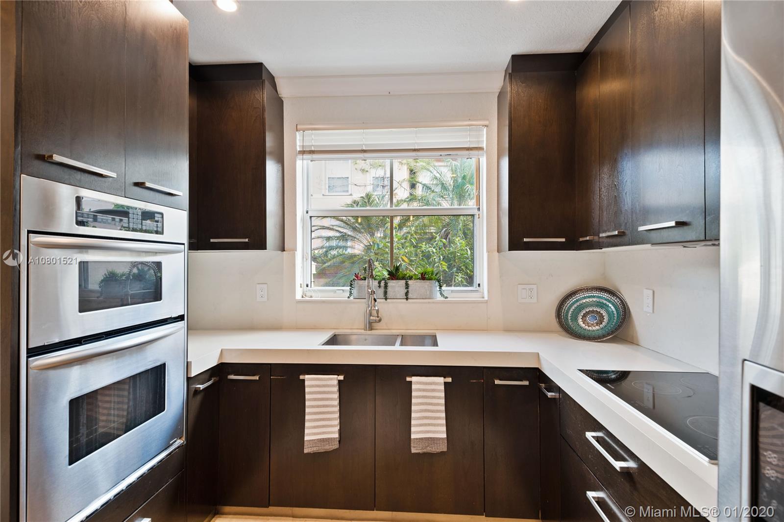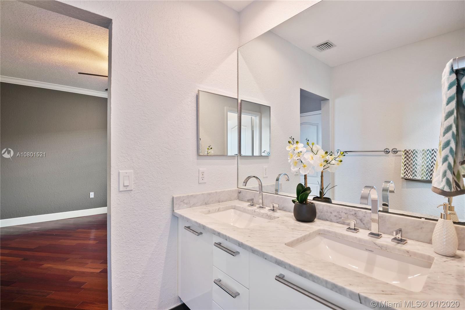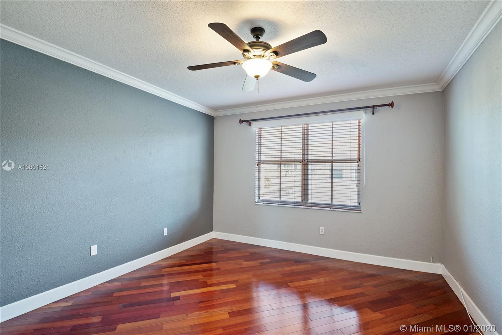 Substantially remodeled town-home featuring 2 master bedrooms with huge walk-in closets and 2.5 bathrooms. This spacious floor plan offers volume ceiling in formal living room; 24" porcelain tiles on diagonal moves you throughout. Travertine paver tiles on patio with covered area and argentines style BBQ. Faux stone accent wall and custom recessed lighting on family room. Beautiful kitchen with quartz counter tops, 42" cabinets, Miele electric cook-top, LG refrigerator, kitchen Aid combination wall oven and microwave. Laminated wood floor stairs. Master has a tastefully upgraded bathroom white dual sink vanity with marble top, frameless glass shower door and custom tile work. Crown molding all over. One car garage and 2 parking spaces. Community with private pool and child playground area.