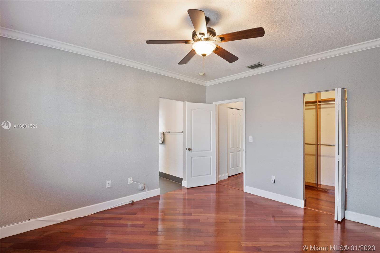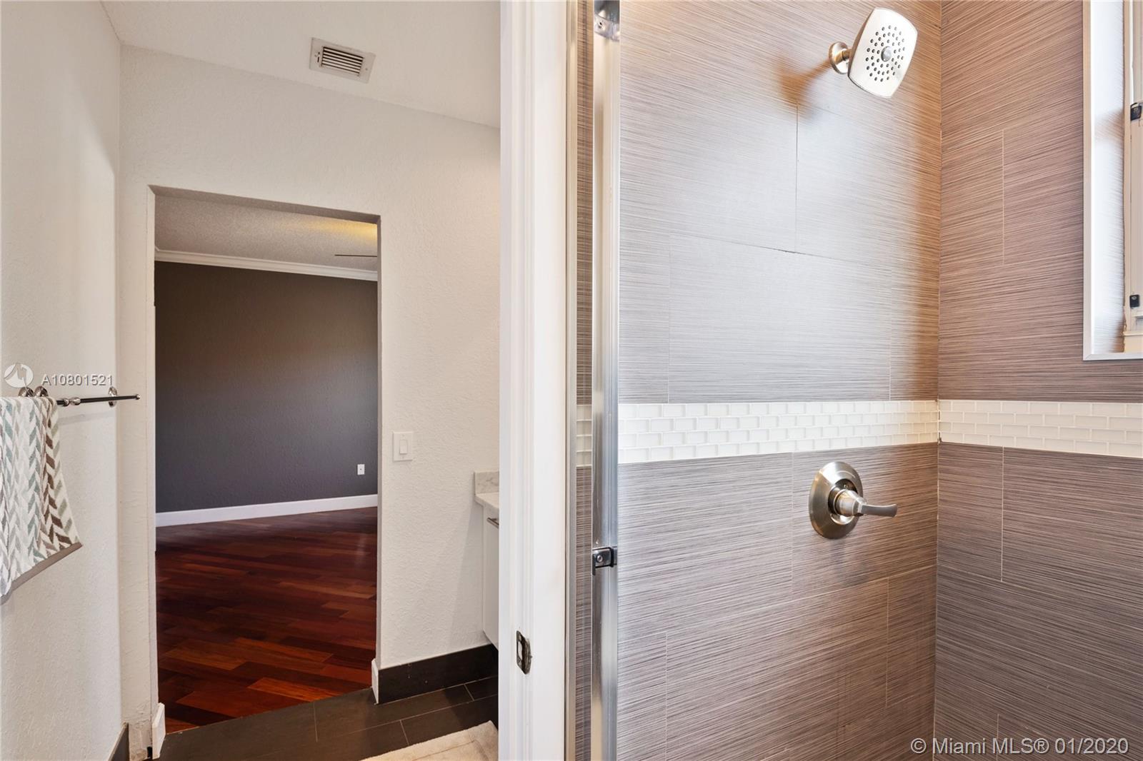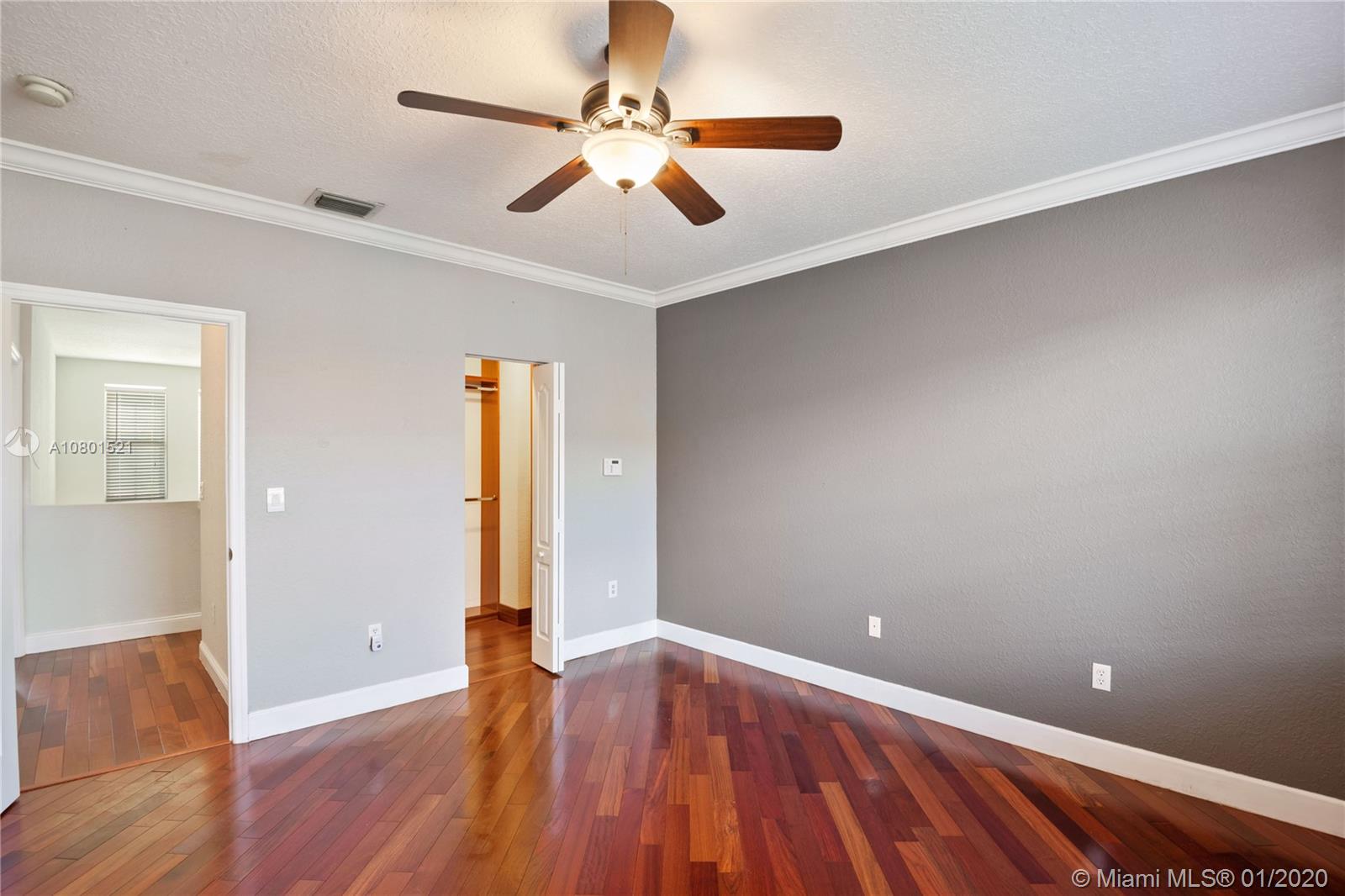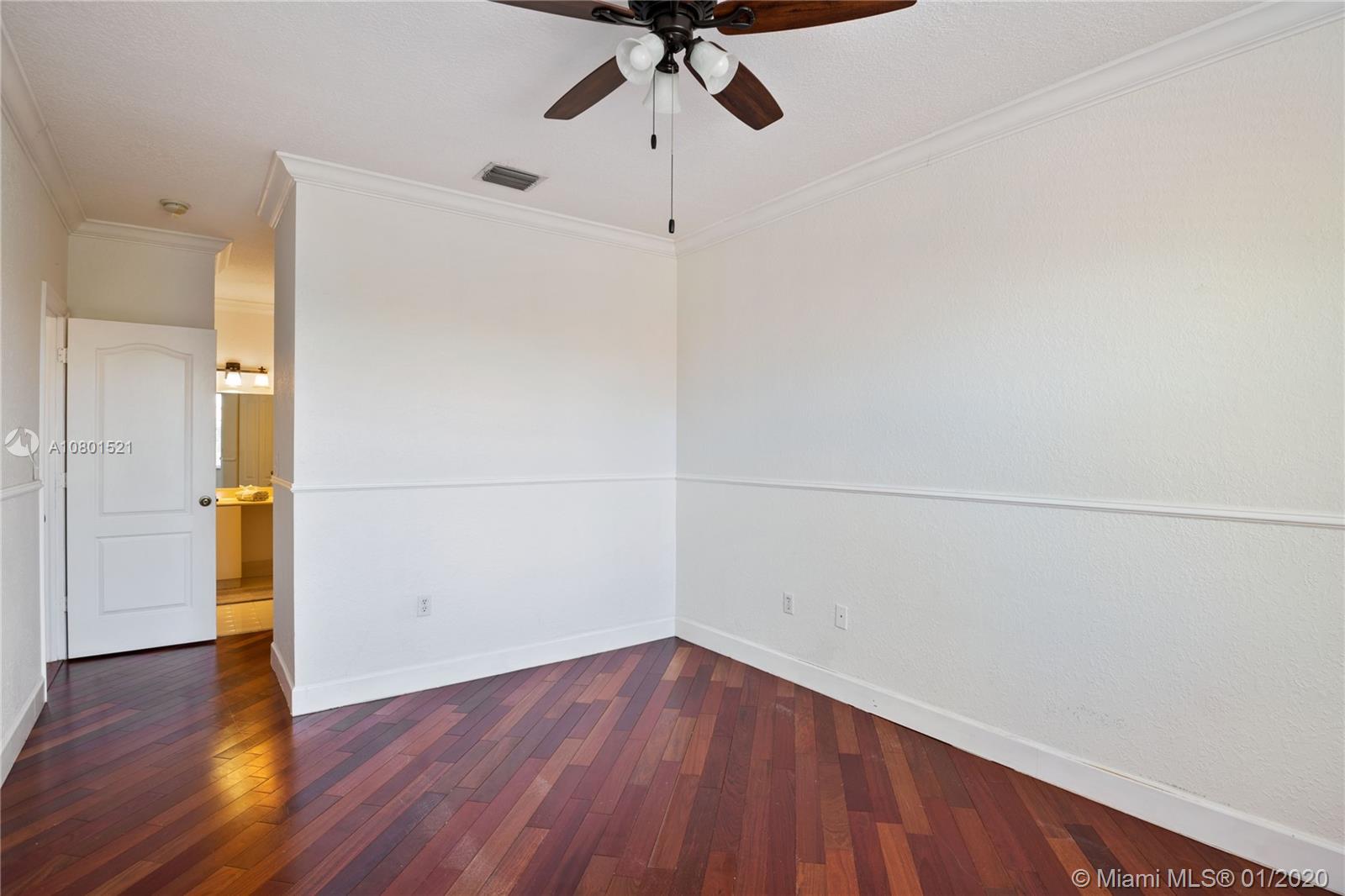 Substantially remodeled town-home featuring 2 master bedrooms with huge walk-in closets and 2.5 bathrooms. This spacious floor plan offers volume ceiling in formal living room; 24" porcelain tiles on diagonal moves you throughout. Travertine paver tiles on patio with covered area and argentines style BBQ. Faux stone accent wall and custom recessed lighting on family room. Beautiful kitchen with quartz counter tops, 42" cabinets, Miele electric cook-top, LG refrigerator, kitchen Aid combination wall oven and microwave. Laminated wood floor stairs. Master has a tastefully upgraded bathroom white dual sink vanity with marble top, frameless glass shower door and custom tile work. Crown molding all over. One car garage and 2 parking spaces. Community with private pool and child playground area.