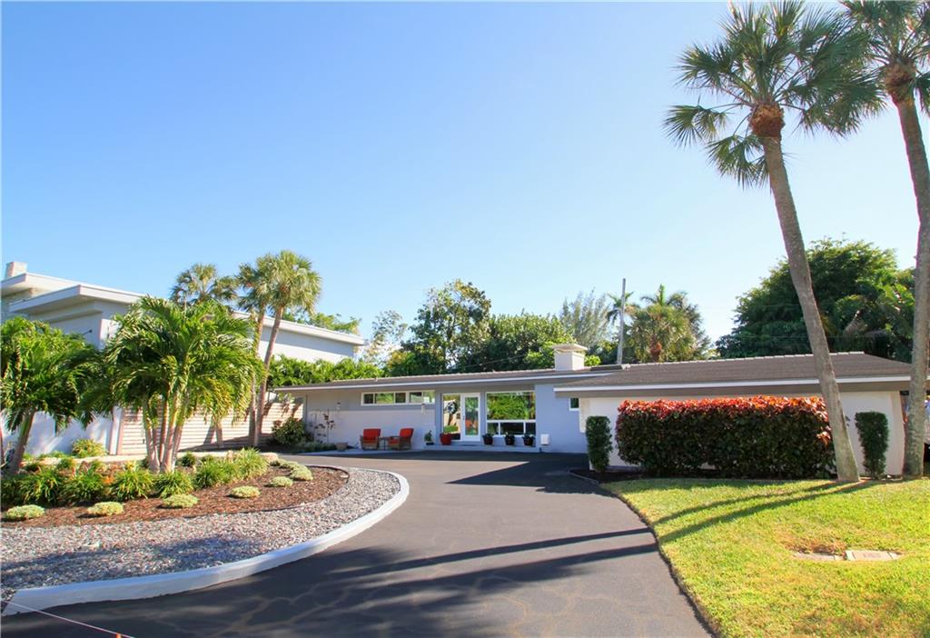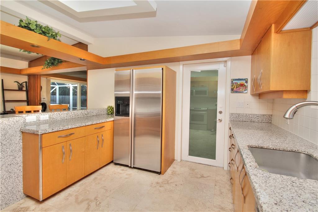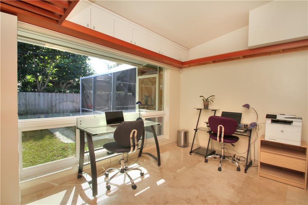 Mid century modern style home with natural light throughout. 3/2 open split floor plan, vaulted ceilings, travertine floors, impact glass throughout with large transom windows at each end of the house, skylight in kitchen. Lots of storage in designer closets and cabinets. Cedar sauna in master bath. Indirect lighting in living, dining and kitchen areas. Coral fireplace in great room. Attached carport storage with 3 large, shelved locking cabinets. 2 car carport, laundry room and separate tool/garden room. Tile roof with hurricane straps 3 years old . Large patio with 24x12 pool w travertine tile deck. Pool enclosed w hurricane resistant support system. Jacuzzi on pool deck. Large circular driveway w new asphalt cap. Landscaped gardens in front & back completely fenced yard w 2 gates.