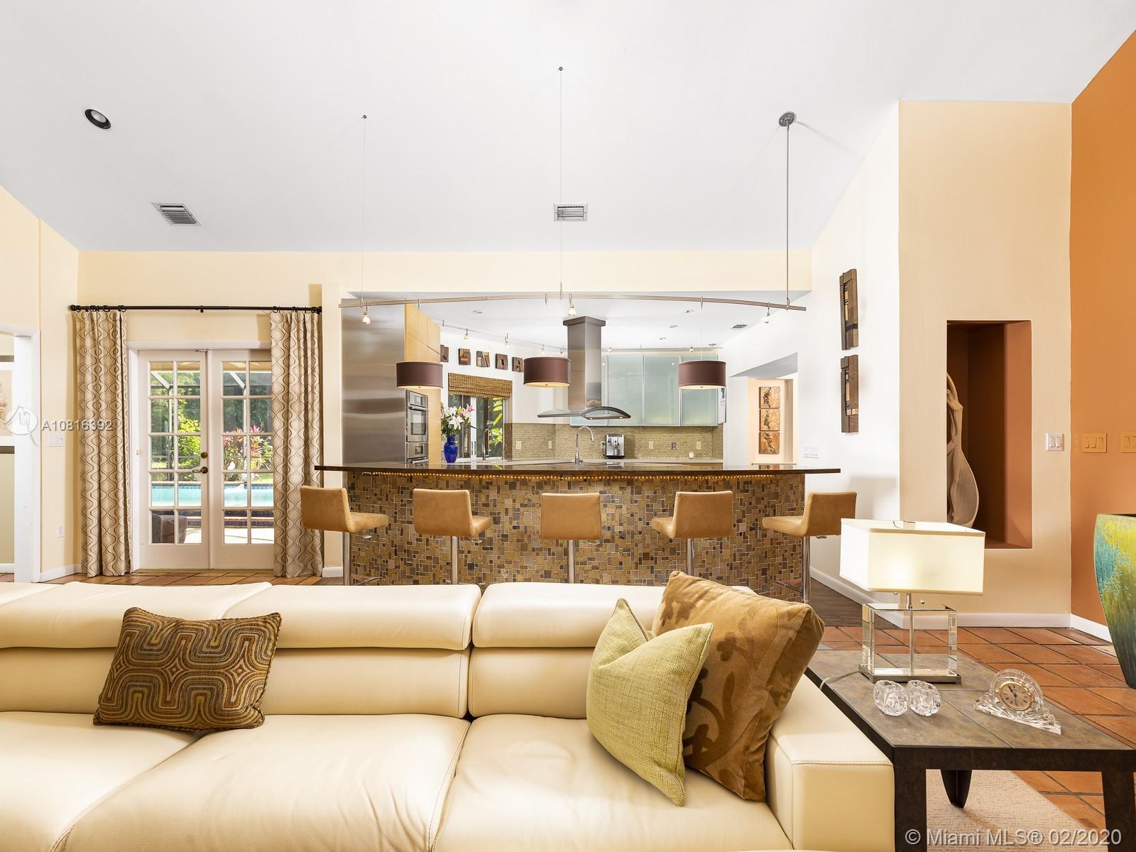 A classic family friendly home situated on the scenic backdrop of Pinecrest. Surrounded by a canopy of lush flora and grand oak trees, this updated, 4 bed and 4 bath property is idyllic for entertaining with a large covered pool and porch featuring ample lounging space, summer kitchen and tranquil koi pond. The heart and soul of the home is its fully-equipped, eat-in gourmet kitchen which incorporates into the great room with vaulted ceiling and wood-burning fireplace, presenting for a warm entrance. A new modern master-suite and spa bath offers the perfect retreat with walk-in glass enclosed shower, floating tub and vanity station. Pinecrest Elementary School is nearby. Extra features: split floor plan, Miele appliances, Sub-Zero refrigerator, full-house generator, partial-impact windows.