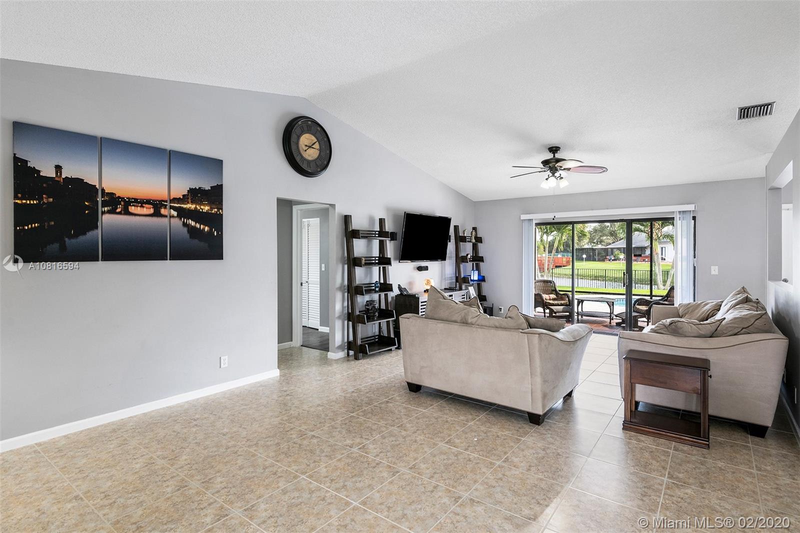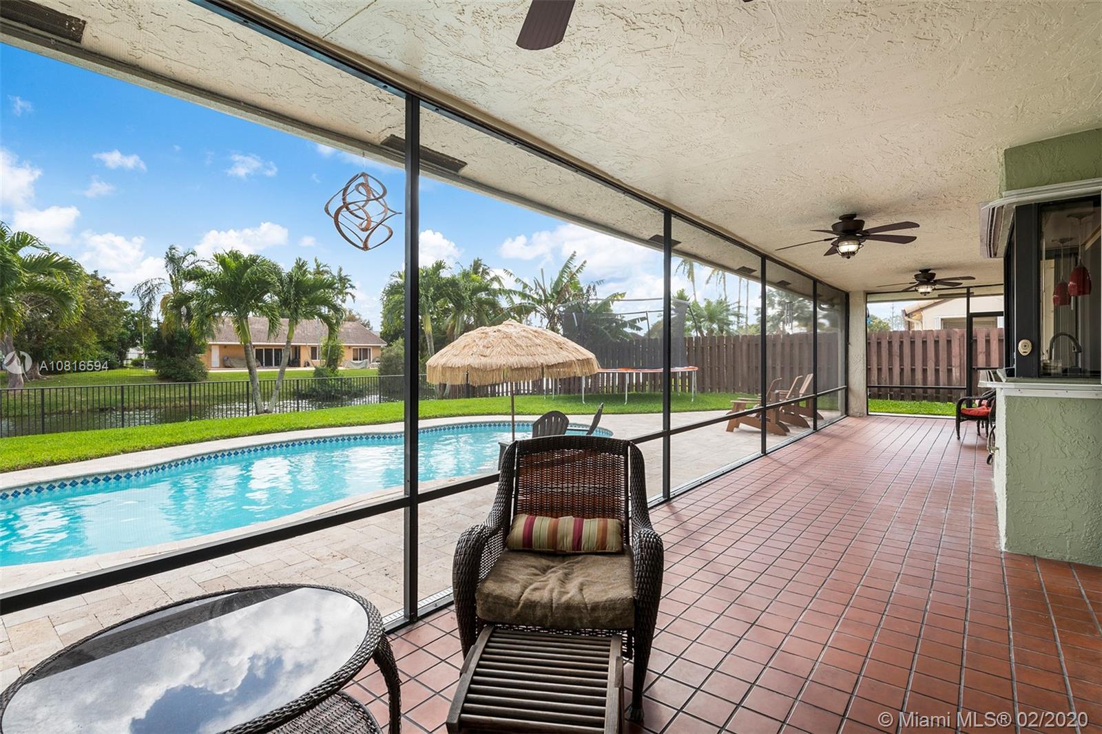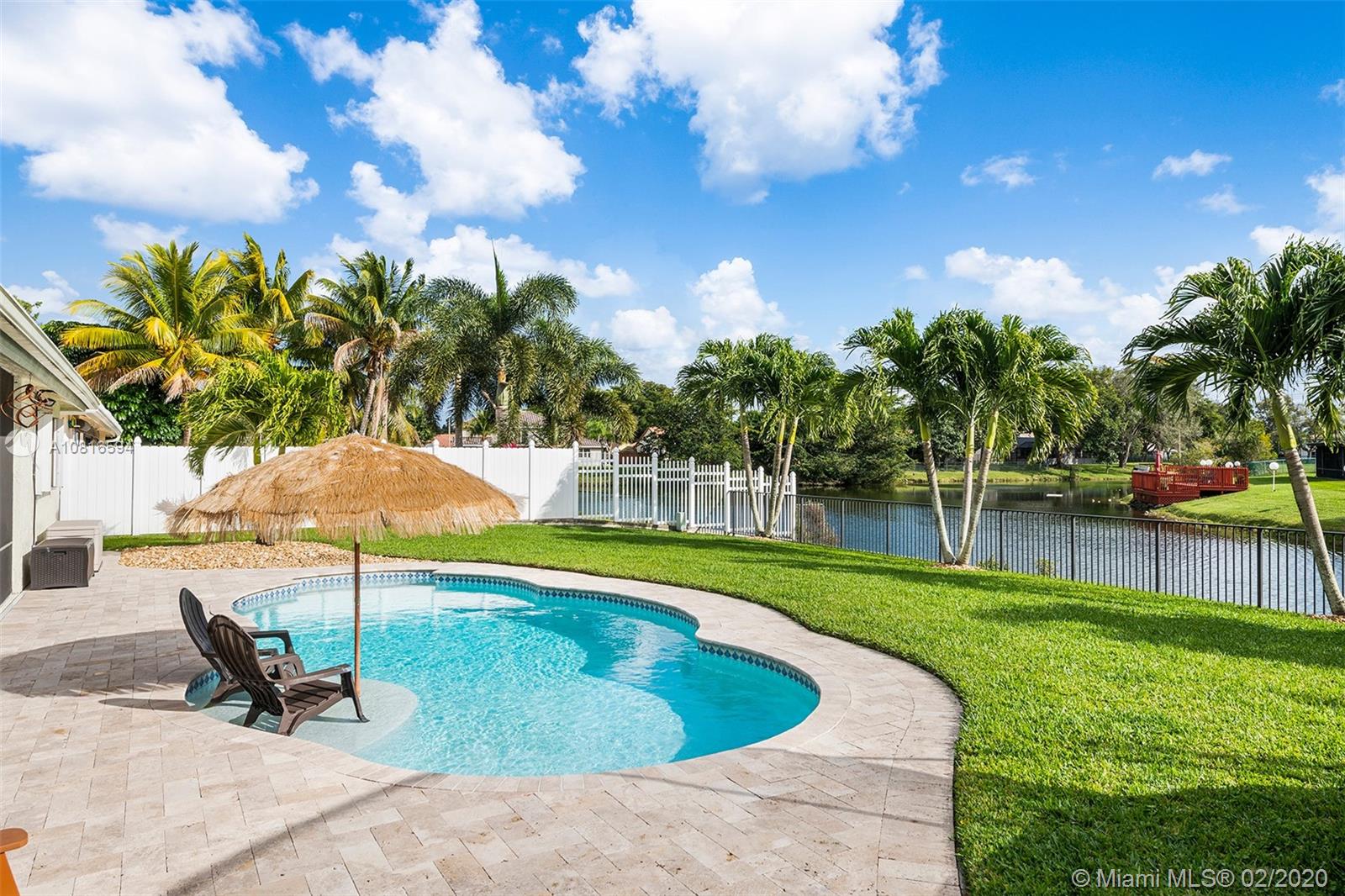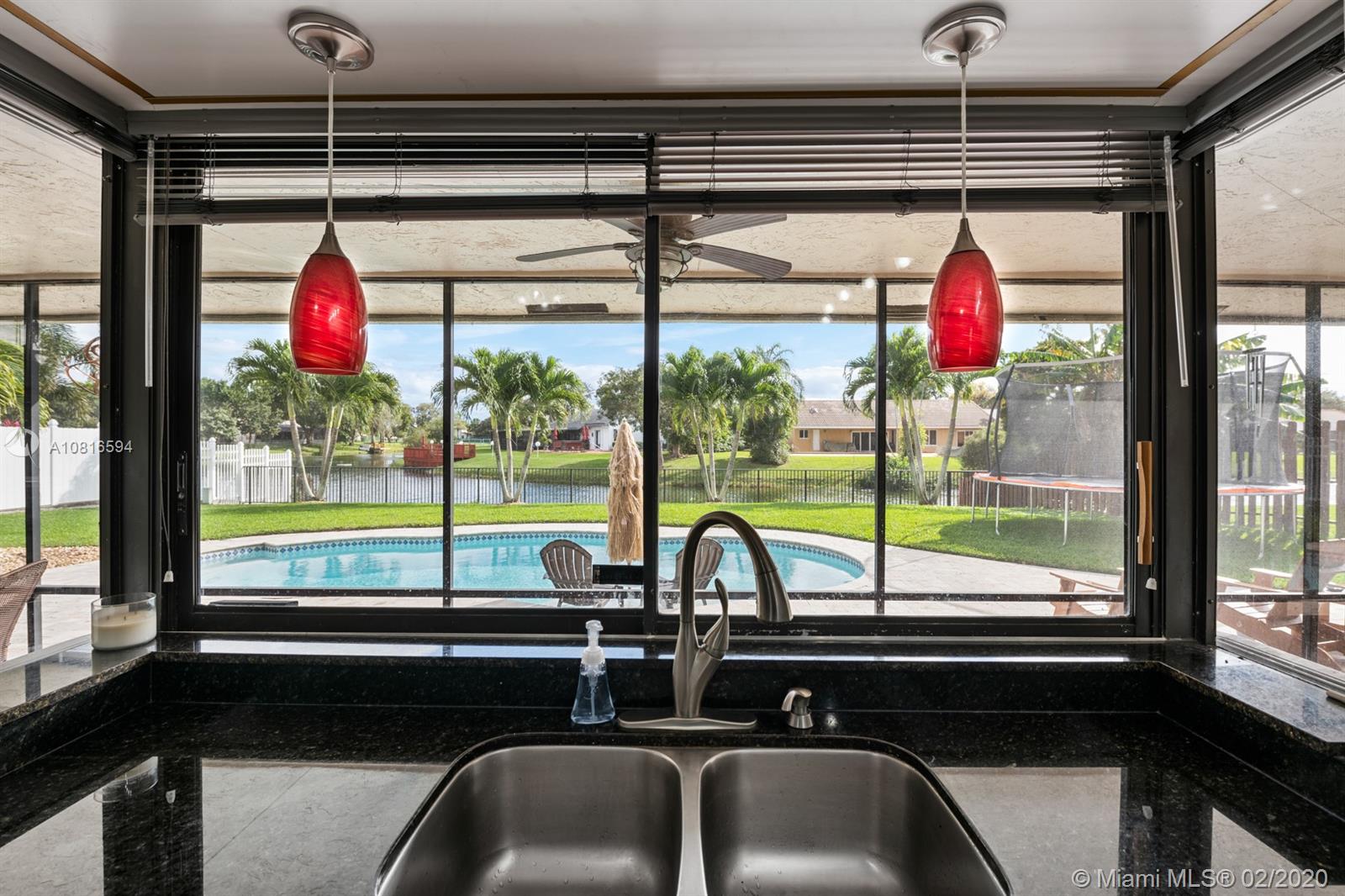 Bring the family home, look no further! Triple split 4 bedroom 3.5 bath pool home in Davie’s quiet & friendly Falcon’s Lea neighborhood. Spacious living areas with vaulted ceilings. Neutral tile in living areas, engineered wood in all the bedrooms. Freshly painted throughout with new interior doors. Granite counters & SS appliances in kitchen with open pass through to screened patio. Lovely open, wide views of the lake with fully fenced tropical yard and salt water pool (2015). Accordion shutters & storm rated garage door. Dual A/C 2015/2008. Updated secondary bathrooms. Large master suite with huge walk-in closet, dual sinks and large walk-in shower. Great location!