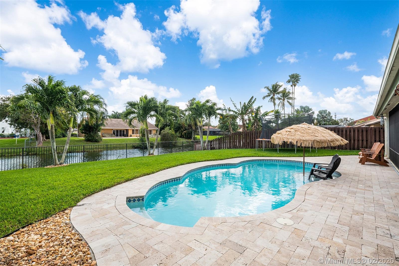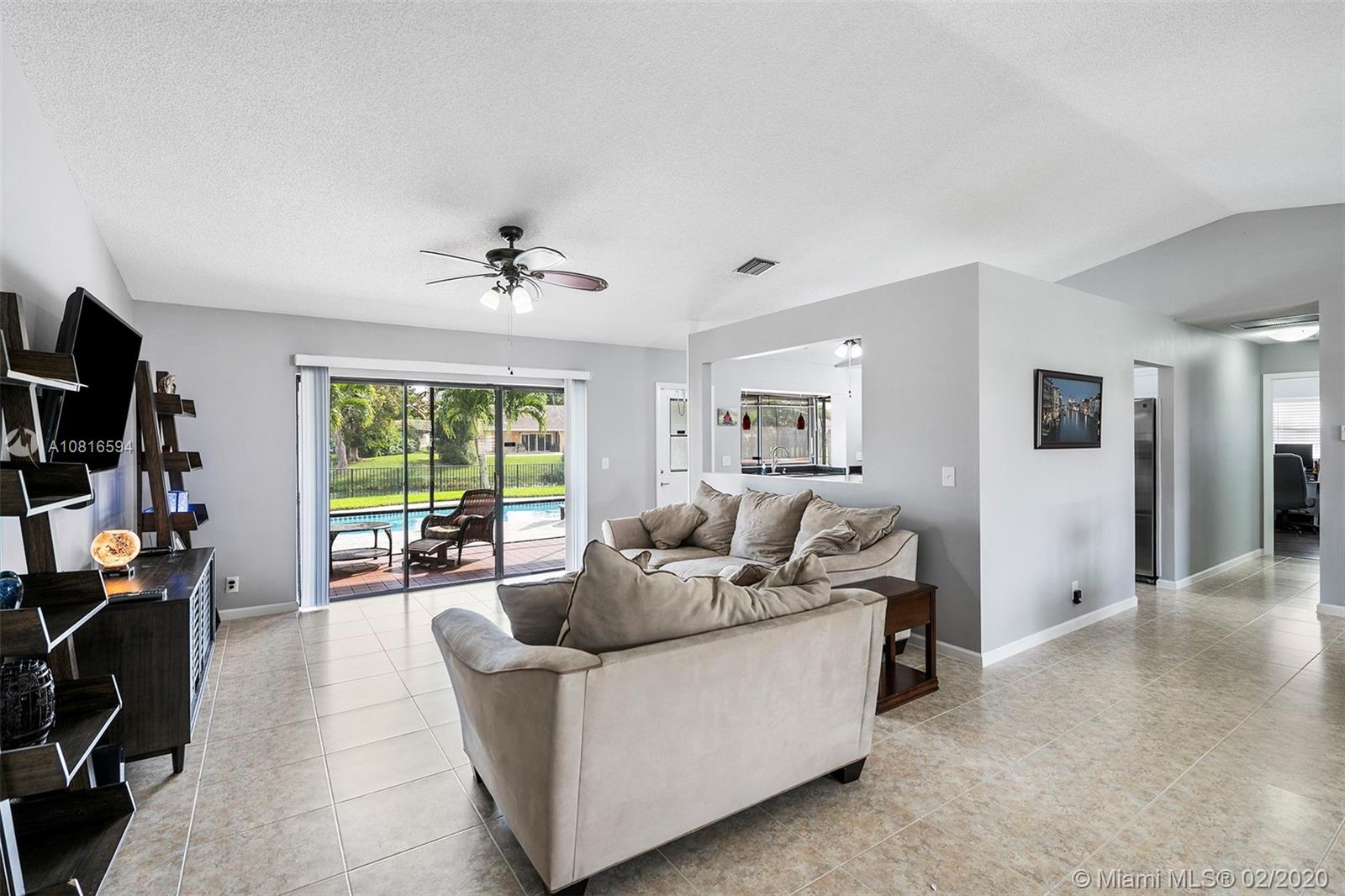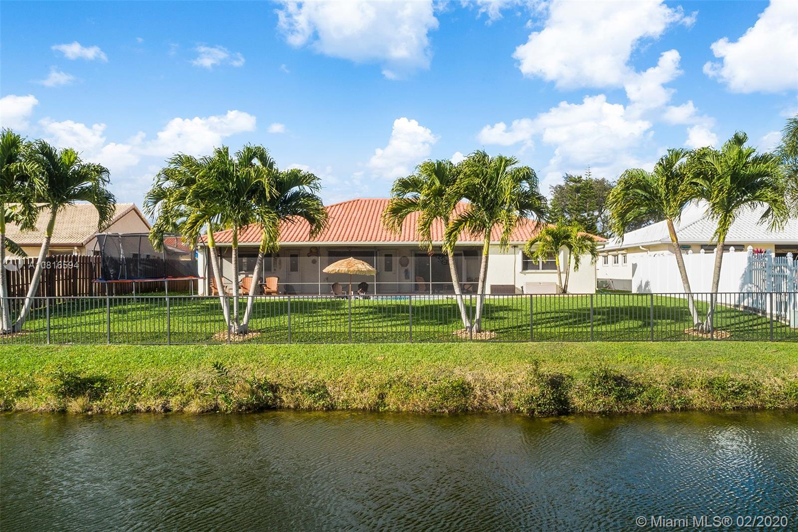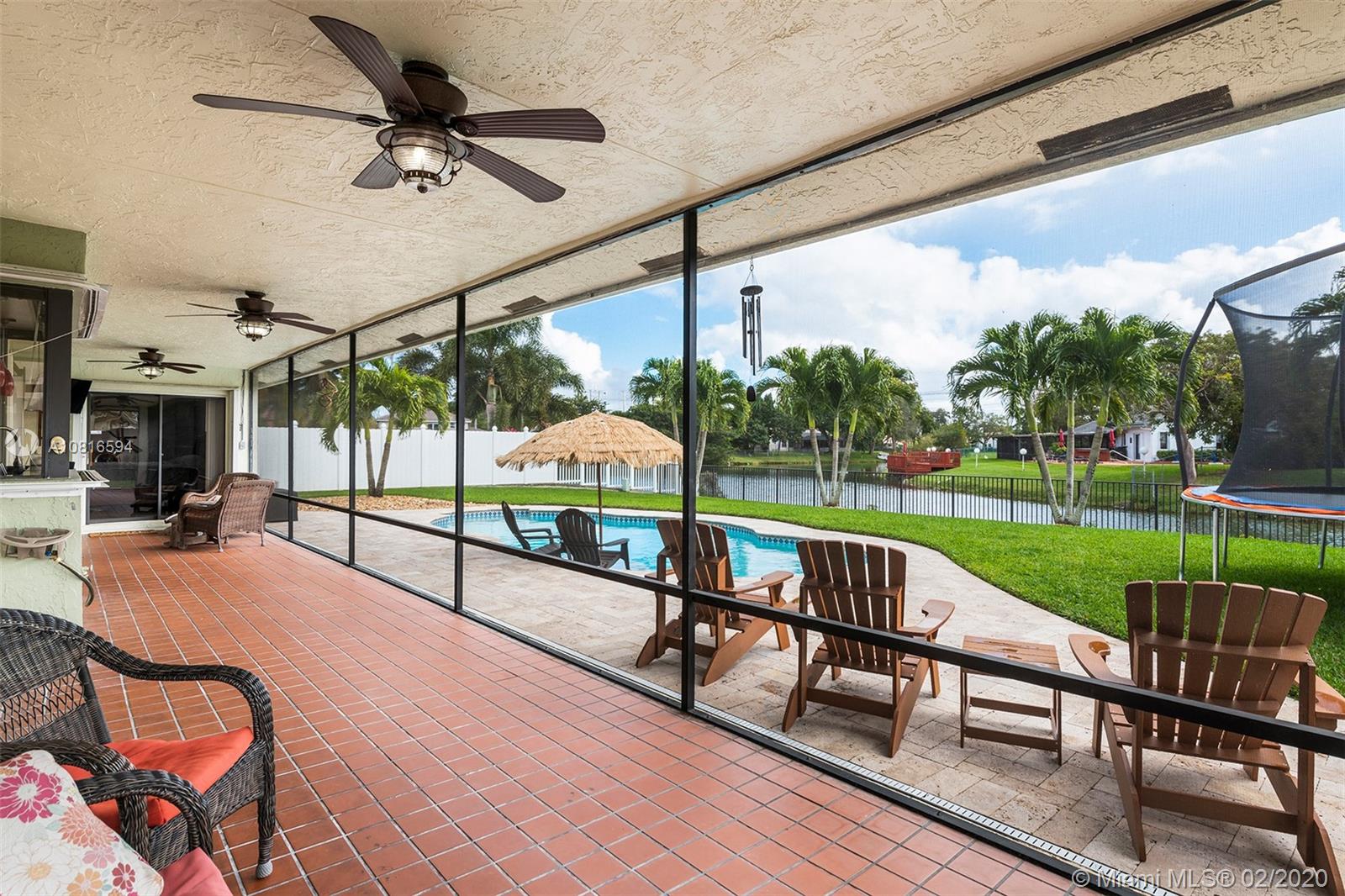 Bring the family home, look no further! Triple split 4 bedroom 3.5 bath pool home in Davie’s quiet & friendly Falcon’s Lea neighborhood. Spacious living areas with vaulted ceilings. Neutral tile in living areas, engineered wood in all the bedrooms. Freshly painted throughout with new interior doors. Granite counters & SS appliances in kitchen with open pass through to screened patio. Lovely open, wide views of the lake with fully fenced tropical yard and salt water pool (2015). Accordion shutters & storm rated garage door. Dual A/C 2015/2008. Updated secondary bathrooms. Large master suite with huge walk-in closet, dual sinks and large walk-in shower. Great location!
