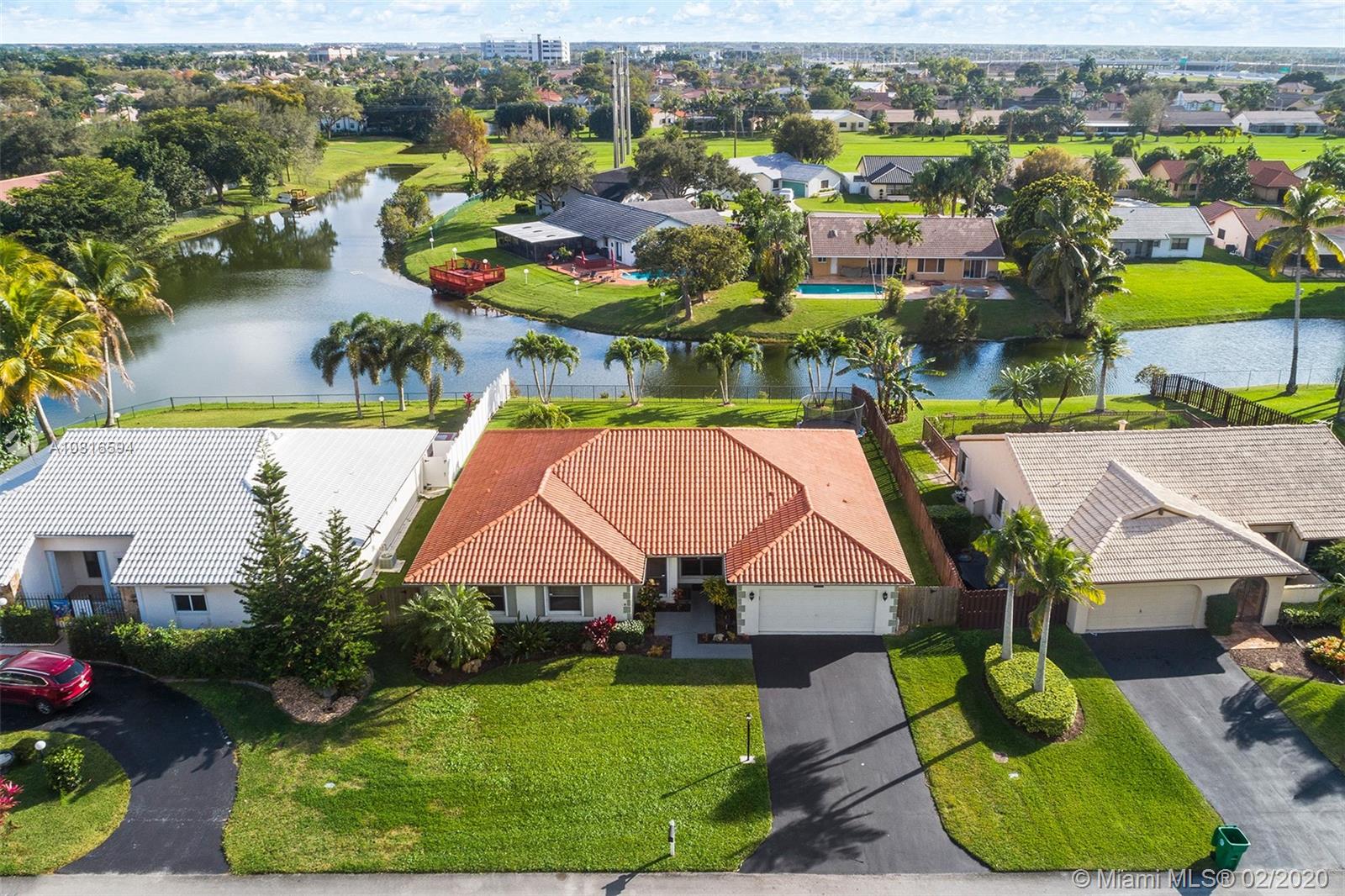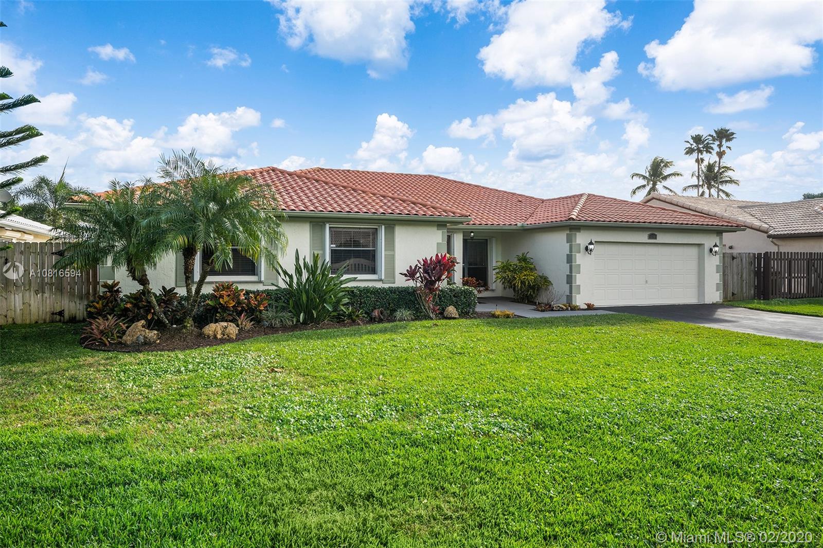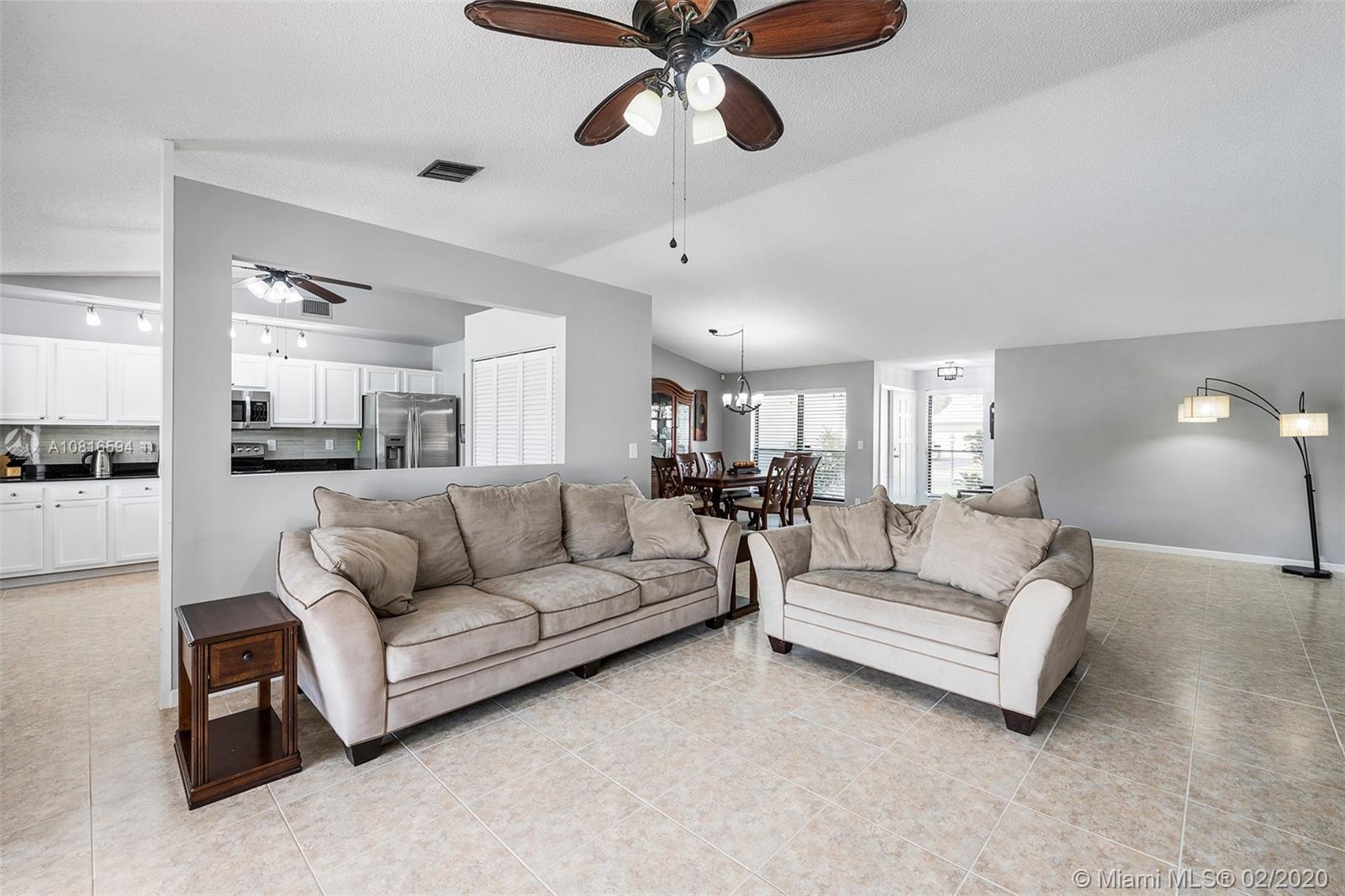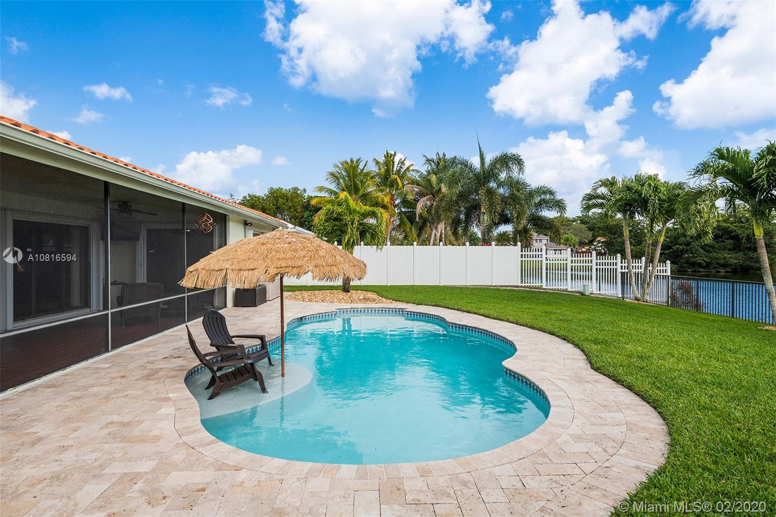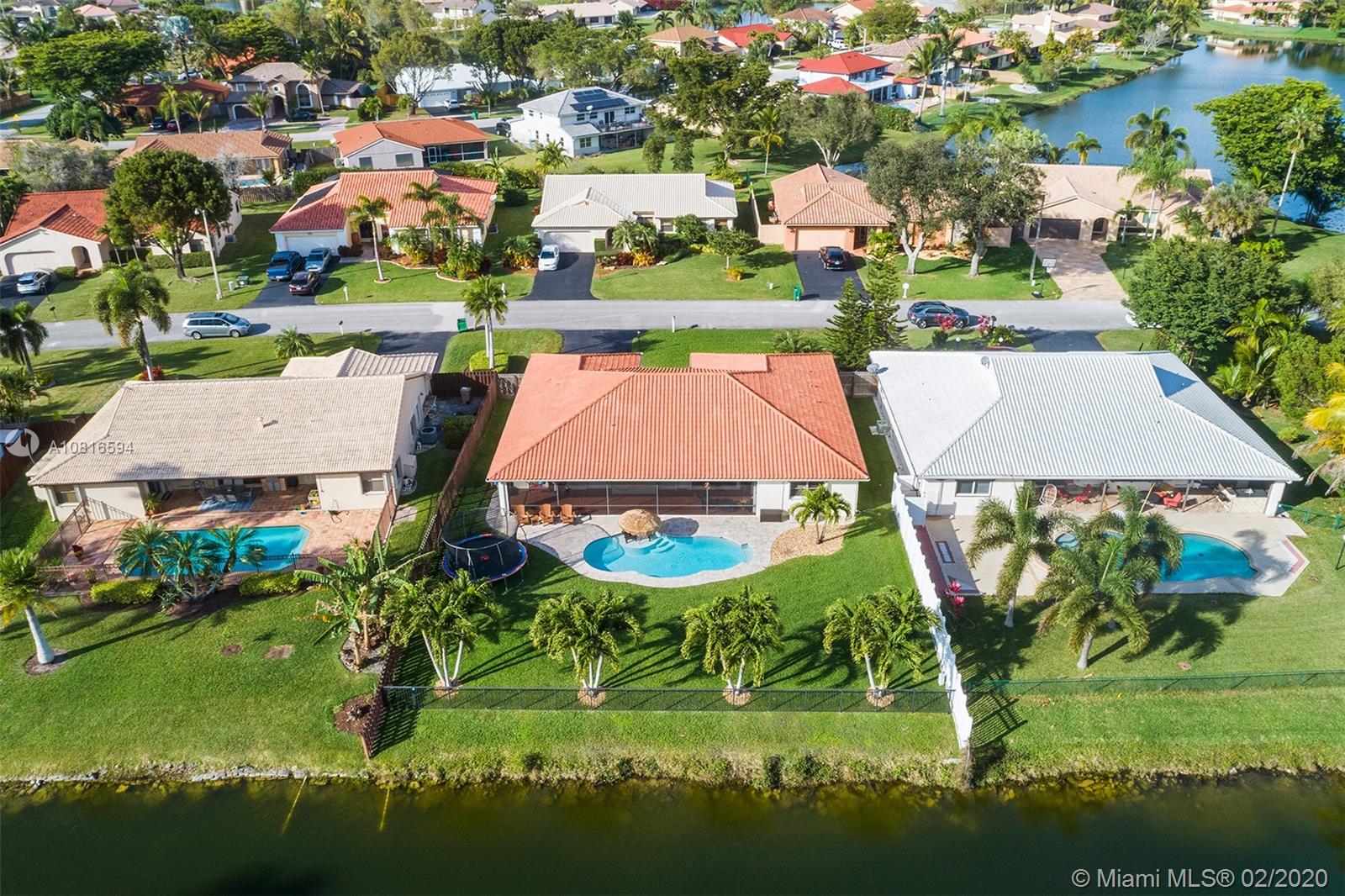 Bring the family home, look no further! Triple split 4 bedroom 3.5 bath pool home in Davie’s quiet & friendly Falcon’s Lea neighborhood. Spacious living areas with vaulted ceilings. Neutral tile in living areas, engineered wood in all the bedrooms. Freshly painted throughout with new interior doors. Granite counters & SS appliances in kitchen with open pass through to screened patio. Lovely open, wide views of the lake with fully fenced tropical yard and salt water pool (2015). Accordion shutters & storm rated garage door. Dual A/C 2015/2008. Updated secondary bathrooms. Large master suite with huge walk-in closet, dual sinks and large walk-in shower. Great location!