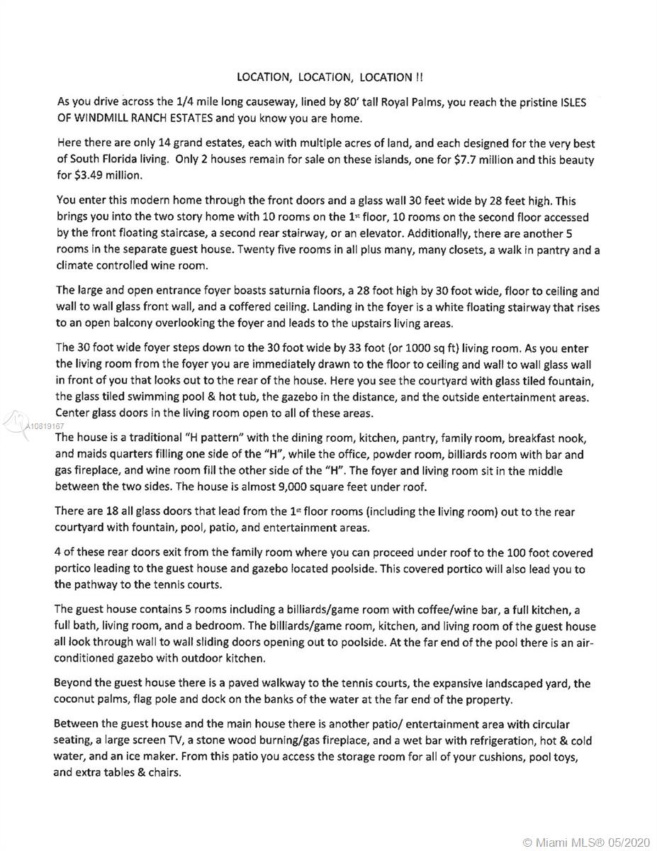 Two story MASTERPIECE located in the exclusive “Isles of Windmill Ranches” section of the prestigious Windmill Ranch Estates! This OPULENT {20+ room} home on a sprawling lot of just under 2 acres has every detail you could imagine! 6 bedrooms, 6 & 1 half baths, library, billiard room, grand foyer entry with 28 ft ceilings, stunning floating staircase, formal living & dining rms, elevator, wine cellar, wet bar, fireplace, balcony, bedrms with ensuite baths, master suite with luxurious bath & enormous closets. Kitchen with Sub Zero & Viking appliances, breakfast area & family rm with gorgeous views of the fountain, pool, resort style patios, gazebo & summer kitchen. All together with a separate 1,200 sq ft guest house with kitchen, bedroom & bath, a tennis court & oversized driveway!