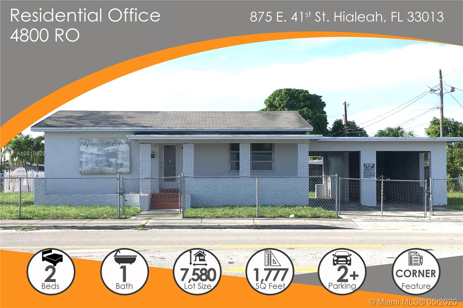 FOR SALE in the East of Hialeah, Residential House that can be converted into a professional office, It has been rezoned 4800 RO (Residential Office) by the City of Hialeah. It can be used as a residential or professional office, meaning an added value to the property. It has a space that can be used as a 3rd bedroom or family room. Needs some int/ext work. Corner lot property with 7580 sqft. A great location in the East of Hialeah, near Lejeune Rd 42nd ave. Perfect for a Family, Medical Office, Accounting, Insurance, Attorney or any other Office Business. It's located in a busy area, facing "East 41 ST Shopping Plaza". Many stores across the street, such as Sedano's Supermarket, and many more. There are more than 20 non-metered parking spaces in front of the property.