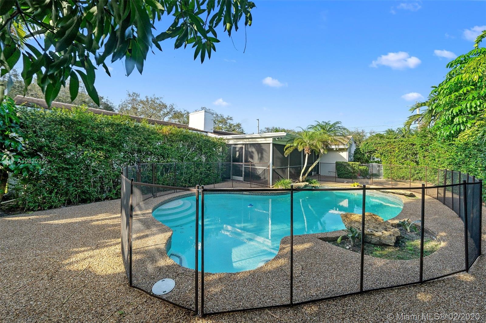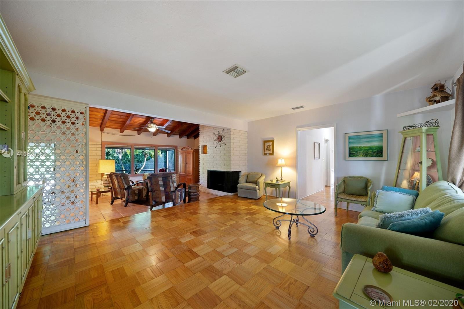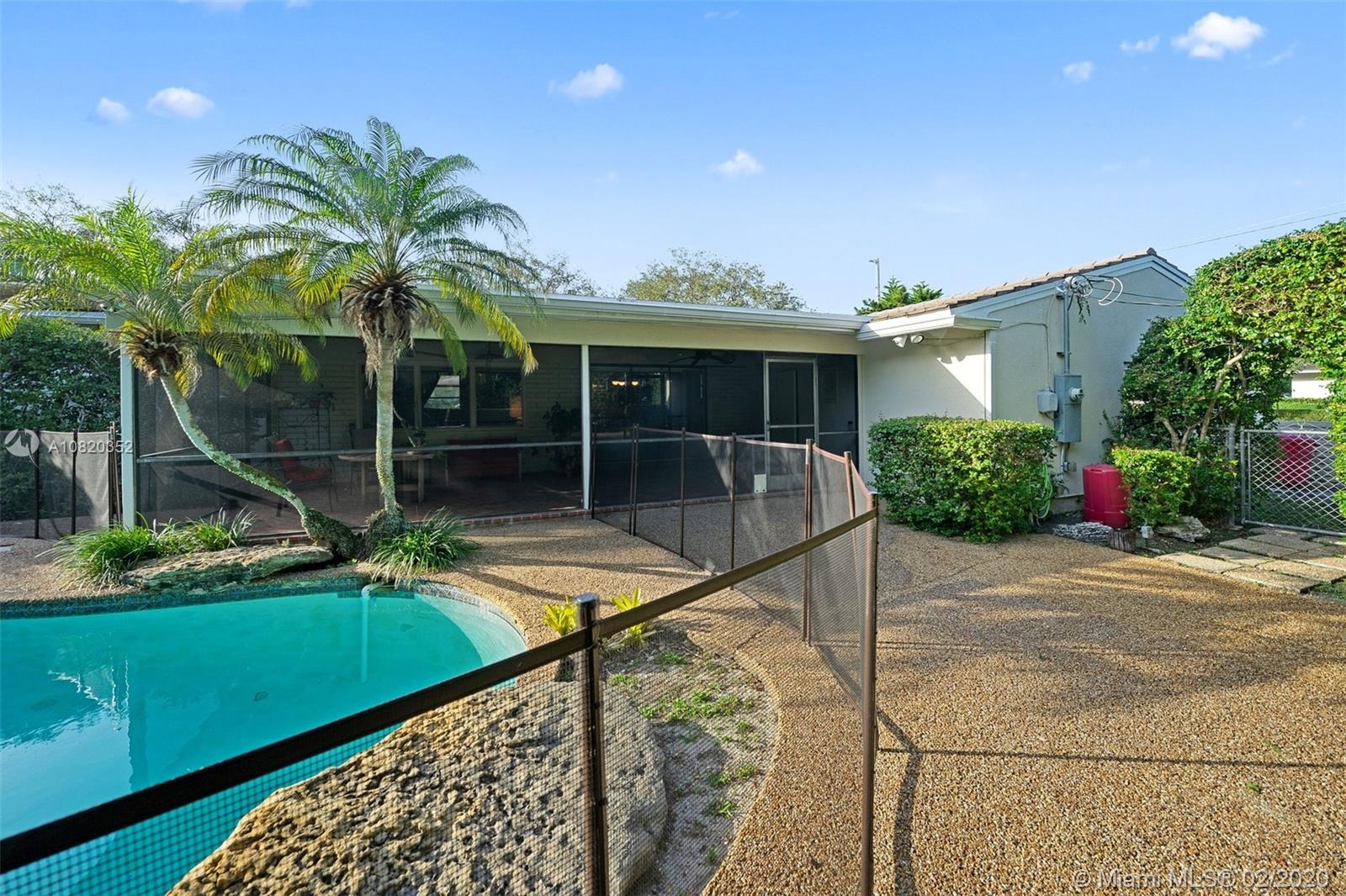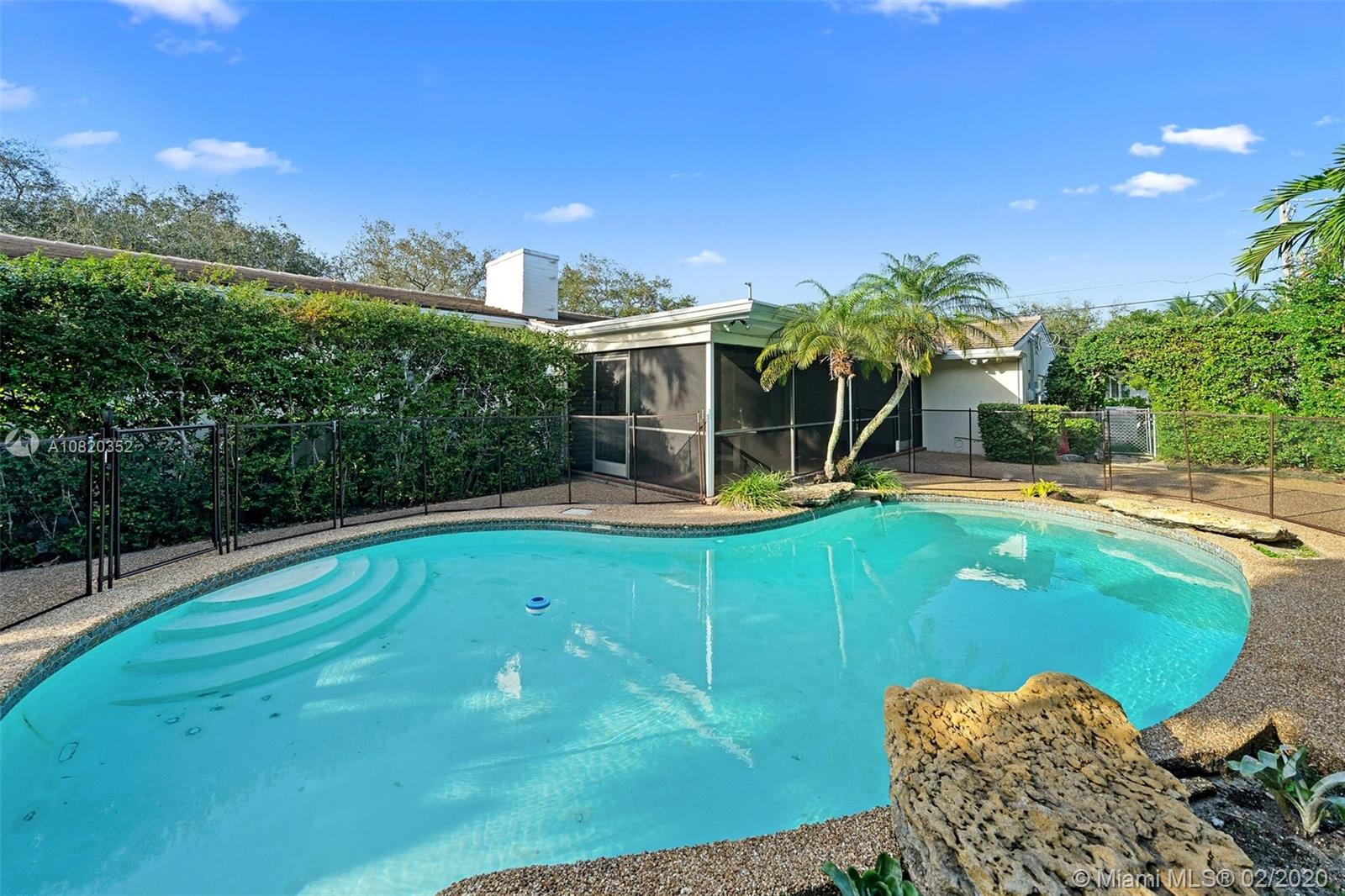 Beloved 4 bedroom/ 2-bathroom mid-century modern home in the City of Coral Gables. Formal living room. Large Florida room with vaulted, exposed wood beam ceiling, fireplace and brick detail is the perfect place for dining and casual gatherings. The kitchen is well maintained with great potential, plenty of cabinet space plus breakfast nook. Excellent, 12,000 square foot corner lot. Spacious screened porch overlooks freeform pool set amidst tropical plantings and private hedge. Fenced backyard. 2 ½ car side entry garage. A few blocks from the University of Miami.