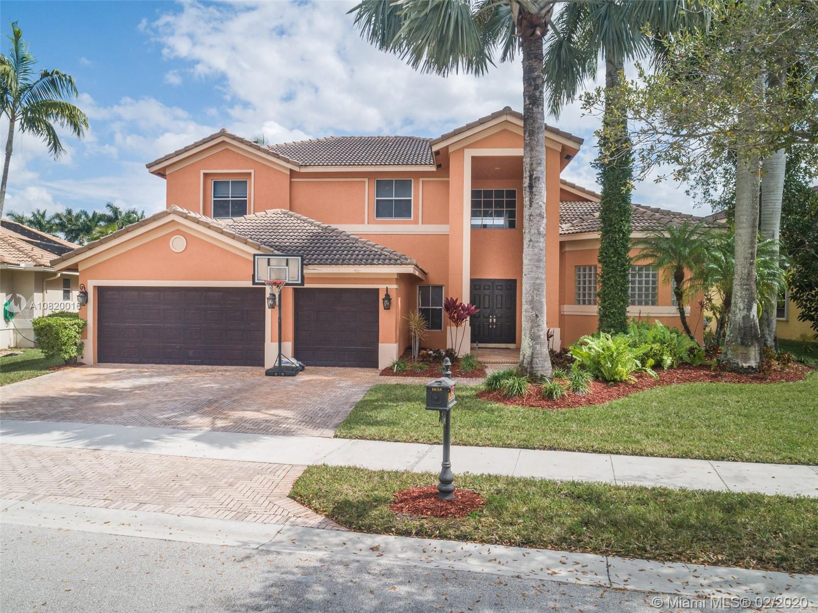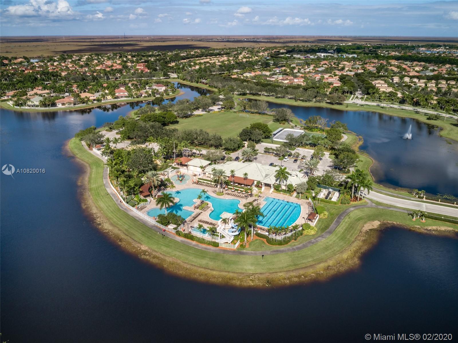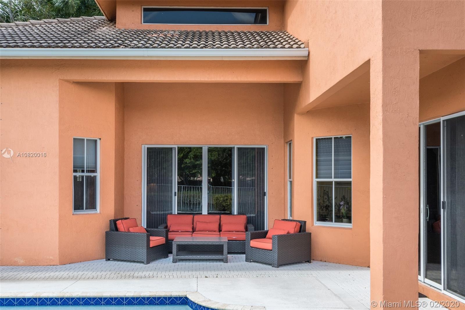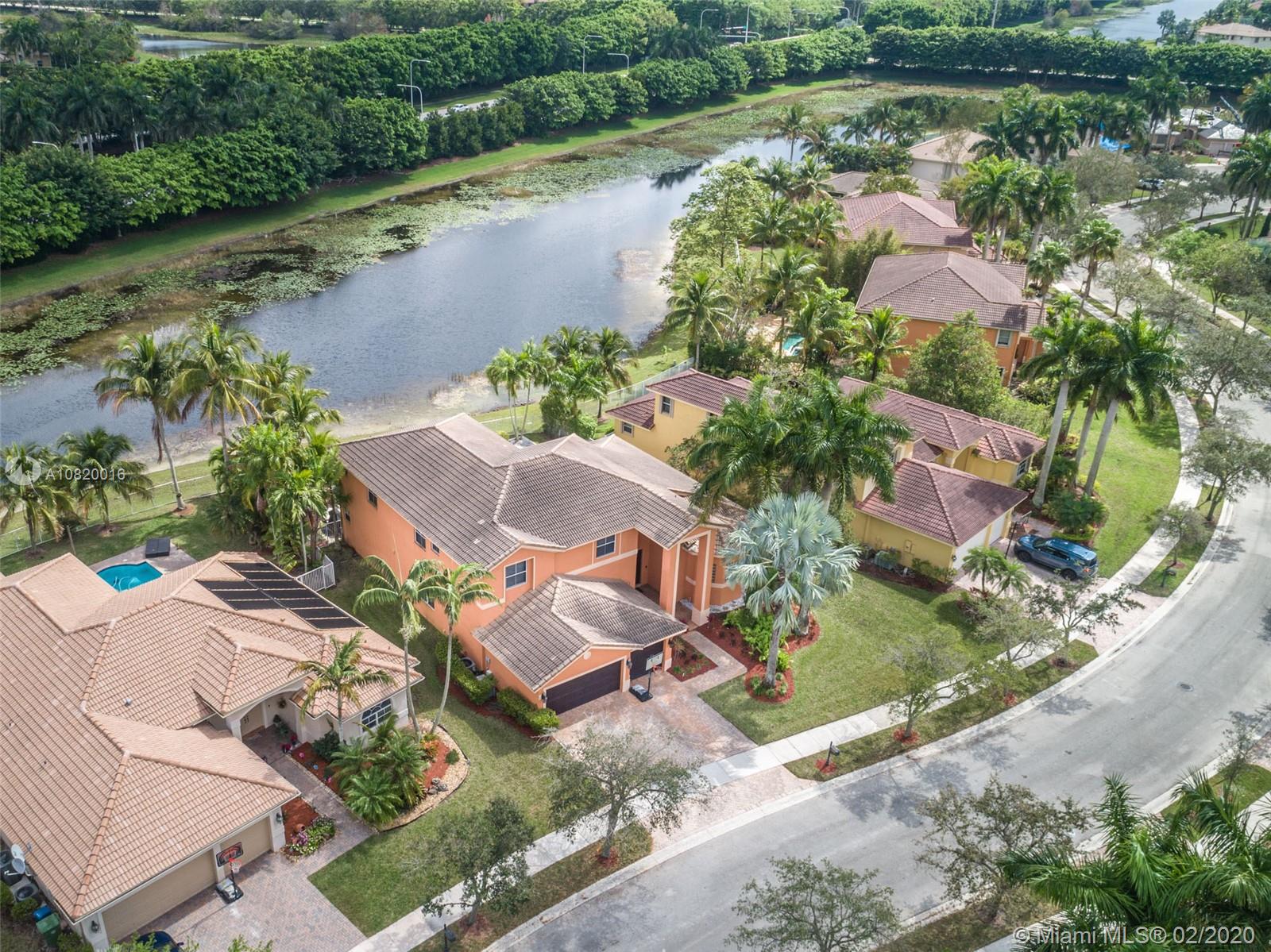 Need space. Popular Denton model sits on tranquil 11,670 sqft waterfront lot with oversized heated pool, fully fenced in the gated community of Savanna at Weston. Two story living room with windows on water. Office and Master bedroom on first level with grand master bath suite, roman tub and dual shower and sinks. New white contemporary kitchen with center island, granite countertops, Stainless steel appliances including double oven, wine refrigerator. Dual staircase leads to the second level with four additional spacious bedrooms plus a playroom. Wood laminate flooring in secondary bedrooms, renovations in all baths. Full accordion protection. Cabana bath and more.