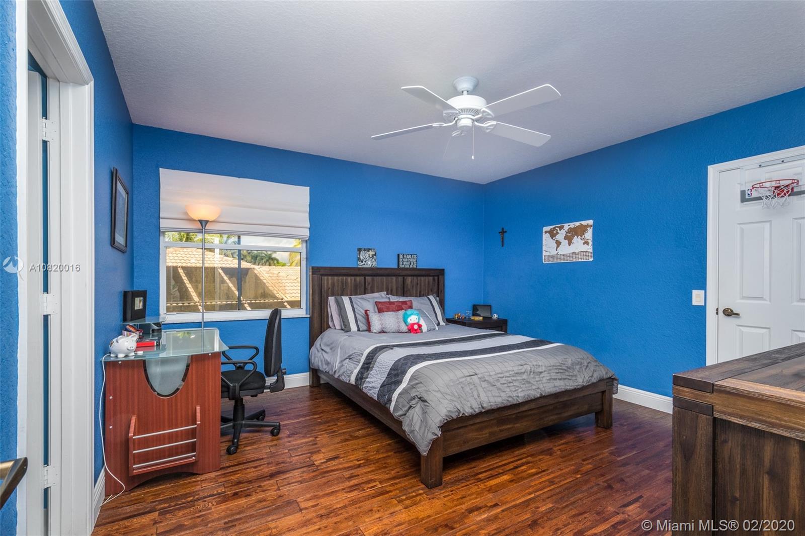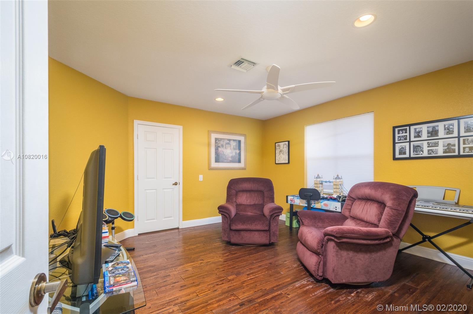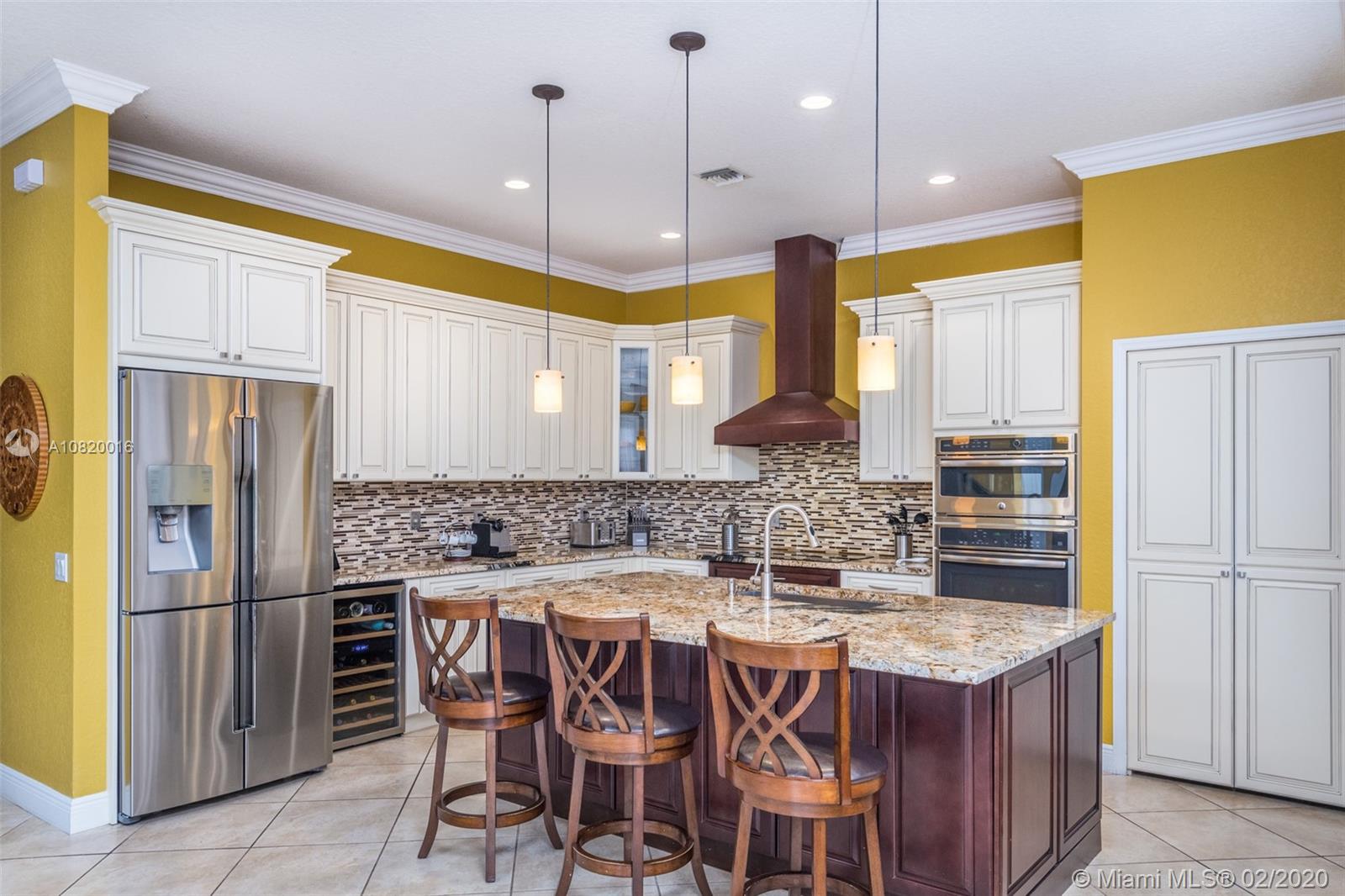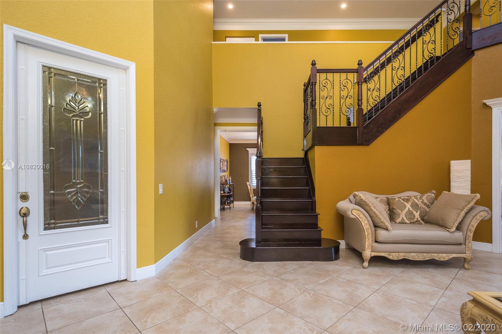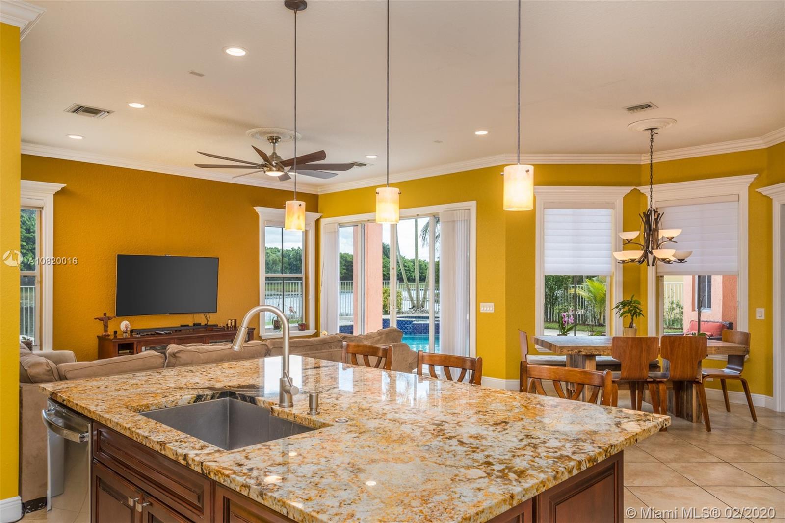 Need space. Popular Denton model sits on tranquil 11,670 sqft waterfront lot with oversized heated pool, fully fenced in the gated community of Savanna at Weston. Two story living room with windows on water. Office and Master bedroom on first level with grand master bath suite, roman tub and dual shower and sinks. New white contemporary kitchen with center island, granite countertops, Stainless steel appliances including double oven, wine refrigerator. Dual staircase leads to the second level with four additional spacious bedrooms plus a playroom. Wood laminate flooring in secondary bedrooms, renovations in all baths. Full accordion protection. Cabana bath and more.