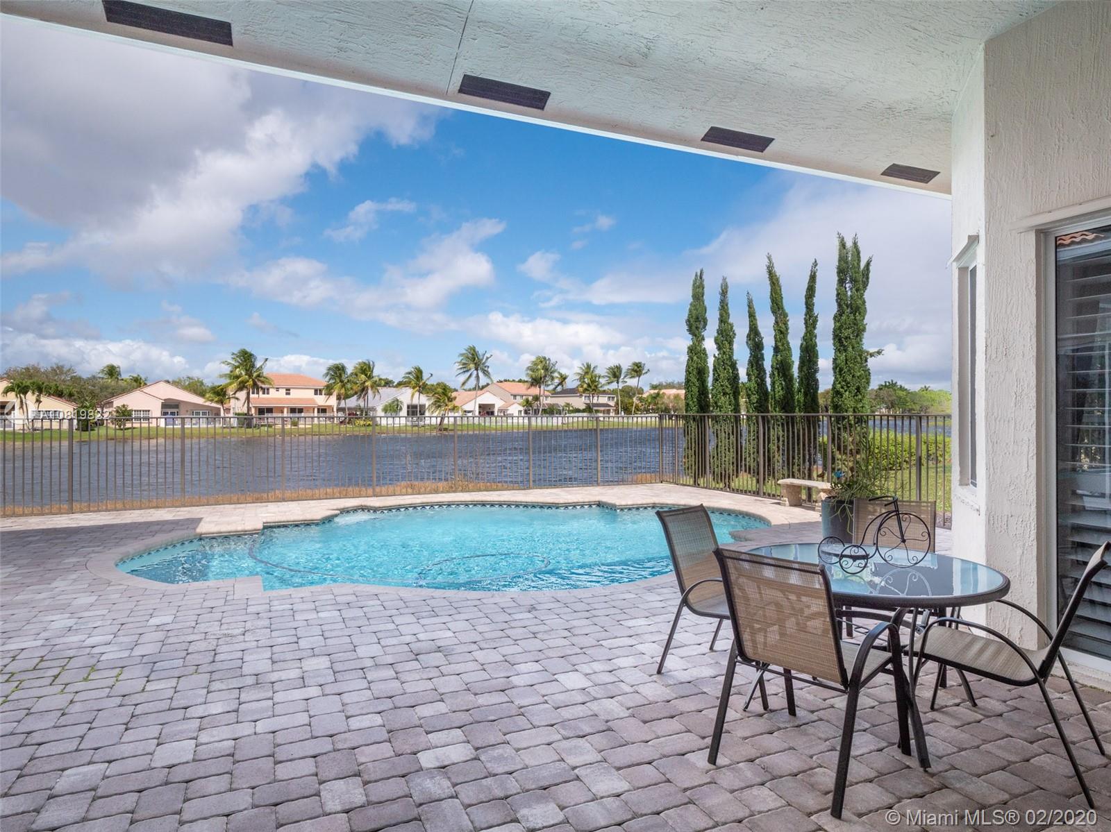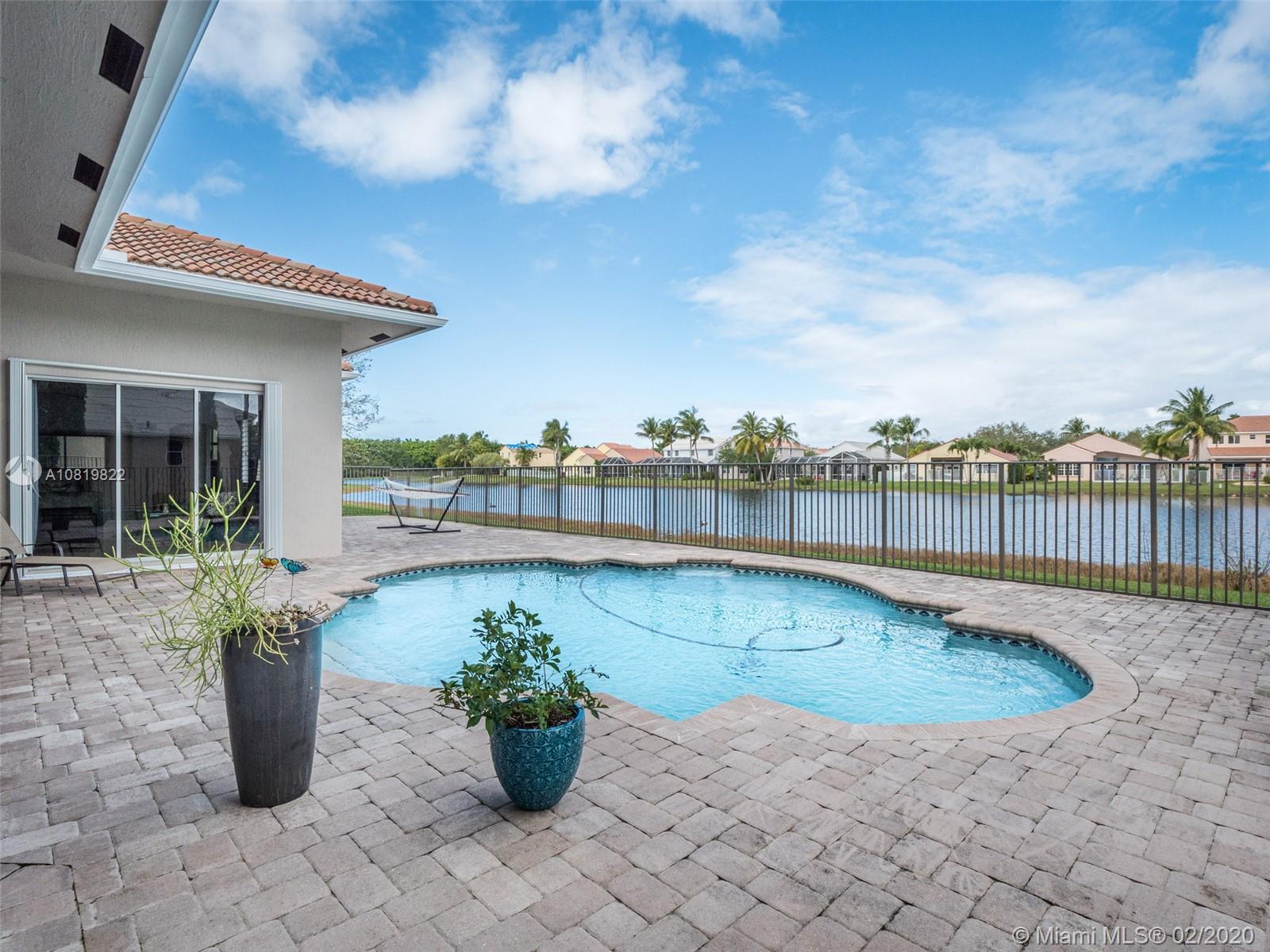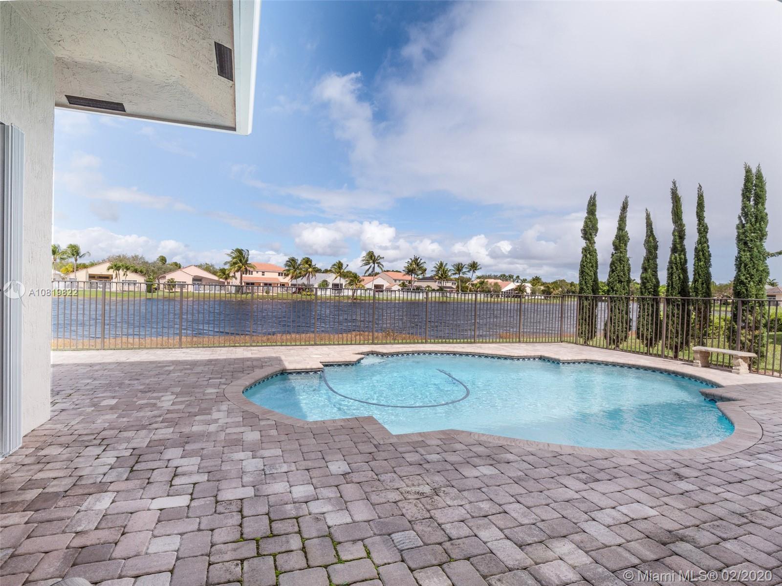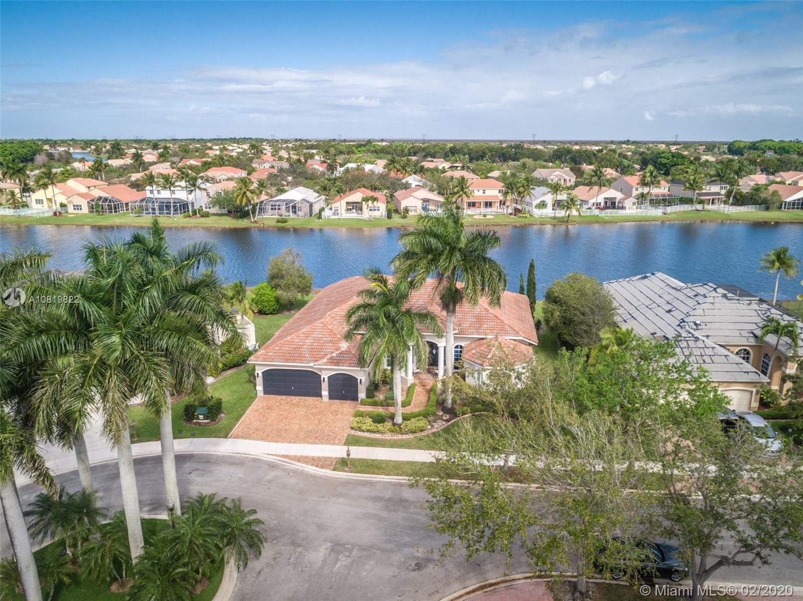 Check out our new 3D tour. Tucked on a quiet cul de sac street this custom built home features chicago brick driveway and walkway. This four bedroom plus office one story shows light and bright. Enjoy long lake views from expansive paver patio, remodeled pool with large overhang fully fenced yard. Neutral porcelain tile in living areas with soaring ceilings. Freshly painted interior. Enjoy contemporary white kitchen, granite countertops, center island and Stainless Steel appliances. Grand master bedroom with windows on water and pool. Master bath with roman tub, dual sinks and shower. Extensive crown molding. plantation shutters. Cabana bath and so much more.