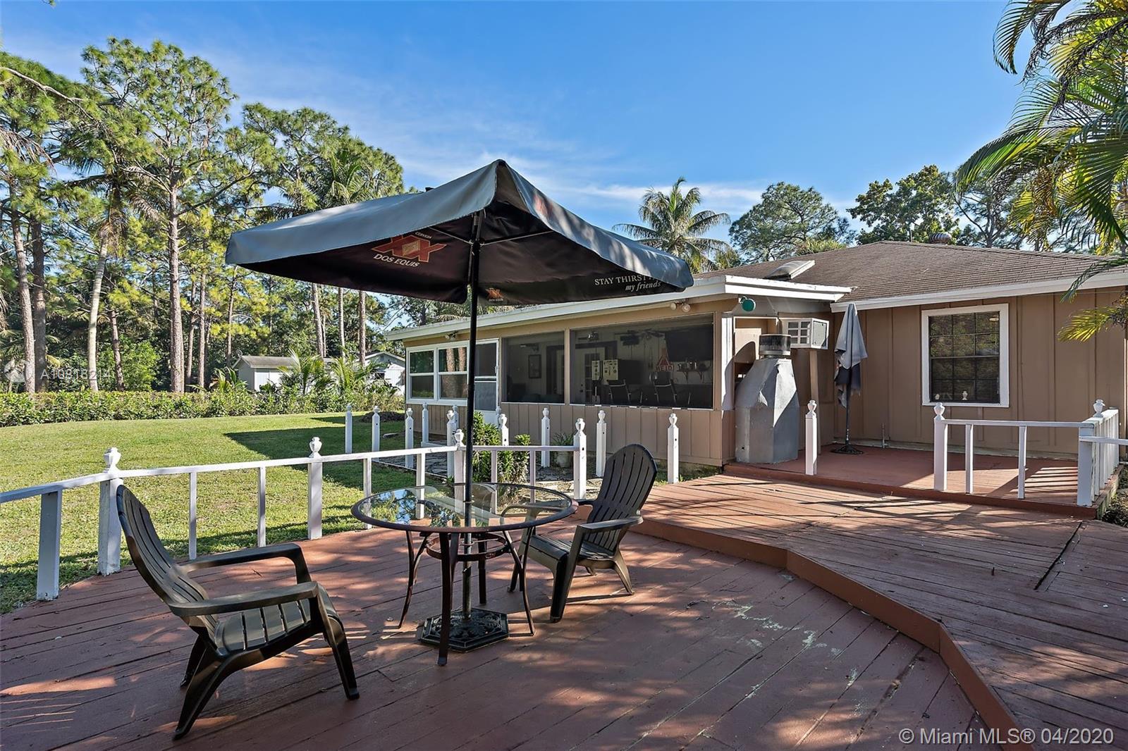 Check out this 4 bedroom, 2 bathroom home in The Acreage! A large screened-in front porch and double entry doors welcome you in. The main living area features a fireplace, tile floors and vaulted ceilings with skylights that fill the open concept living area with natural light. The kitchen has been upgraded with high-end ''smart'' appliances and is open to the dining room and livingroom. The Master Bedroom has a walk-in closet and French doors that make it light and bright. The 2nd bathroom will be sure to impress you as it has been completed upgraded in 2018 with the most modern features. Enjoy Florida weather on the 1.25 acres that is fully fenced with automatic gate, irrigation system, fruit trees, a large deck & gazebo. Roof 2005, AC 2019, tankless water heater- 2018, appliances -20