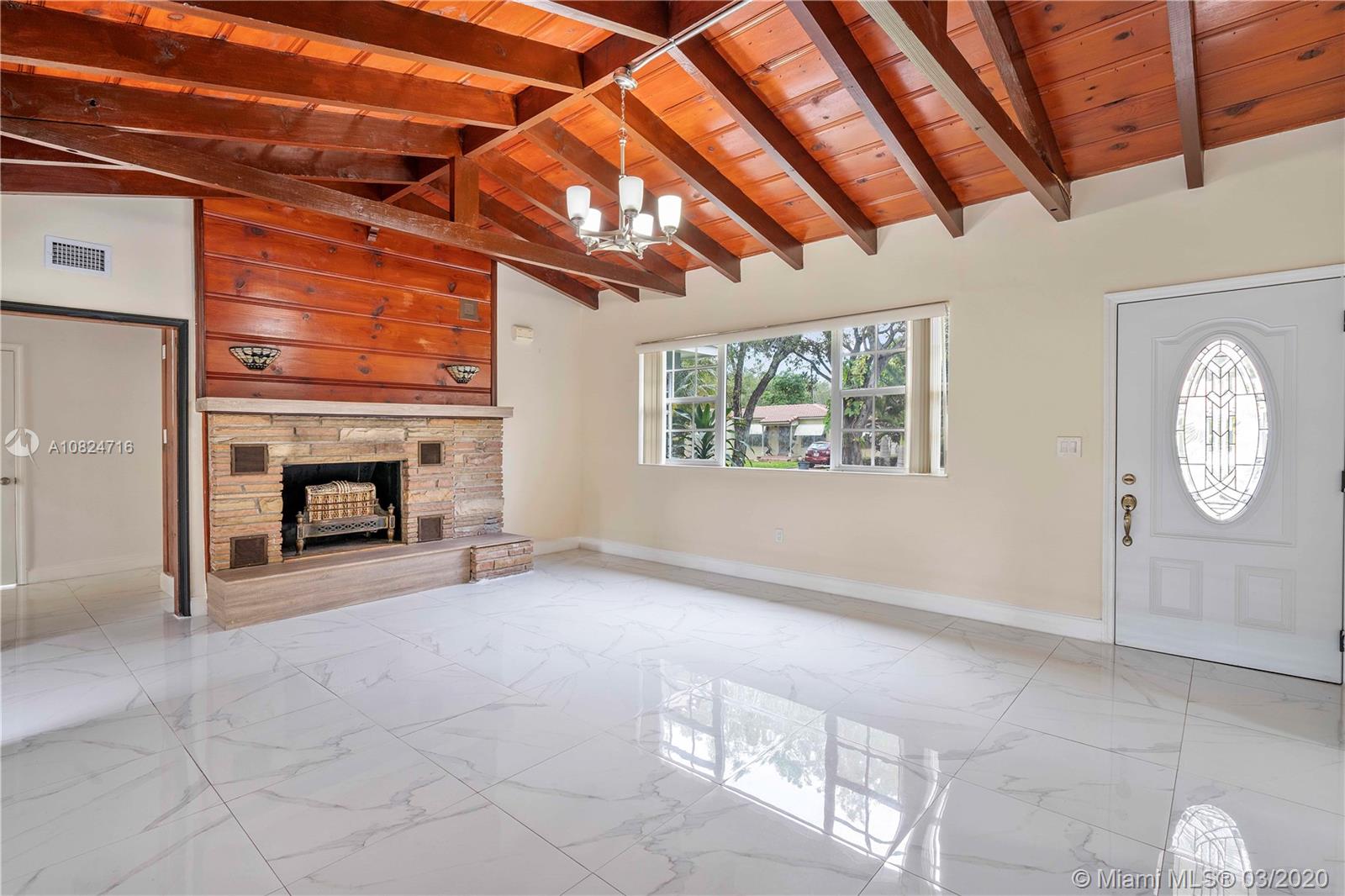 Classic style meets modern. Welcome to this beautiful starter home in Miami Shores. Come in to be amazed by the beautiful high vaulted ceilings in the spacious living area complemented by a classic fireplace. The home offers a three bedroom split plan with a master bedroom and ensuite bathroom. An updated modern kitchen with plenty of cabinet space and newer appliances. Two updated bathrooms with modern shower heads. The house measures 1,666 sf of living space under AC. A cozy utility room/laundry room is conveniently located by the kitchen area. New washer and dryer. Air conditioning unit is one year old. The lot measures 12,000 sf which gives you enough room for a pool in the backyard. Located in a quiet and safe Cul de sac, away from it all yet close to all Miami Shores has to offer.