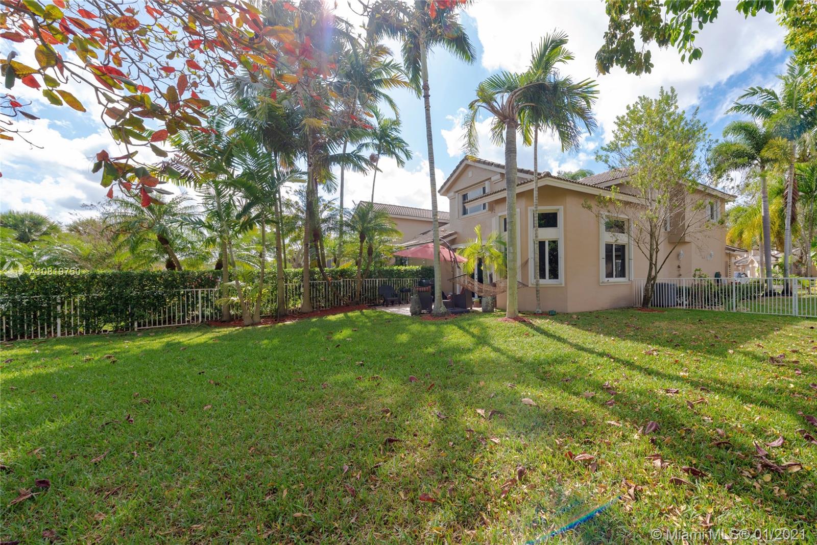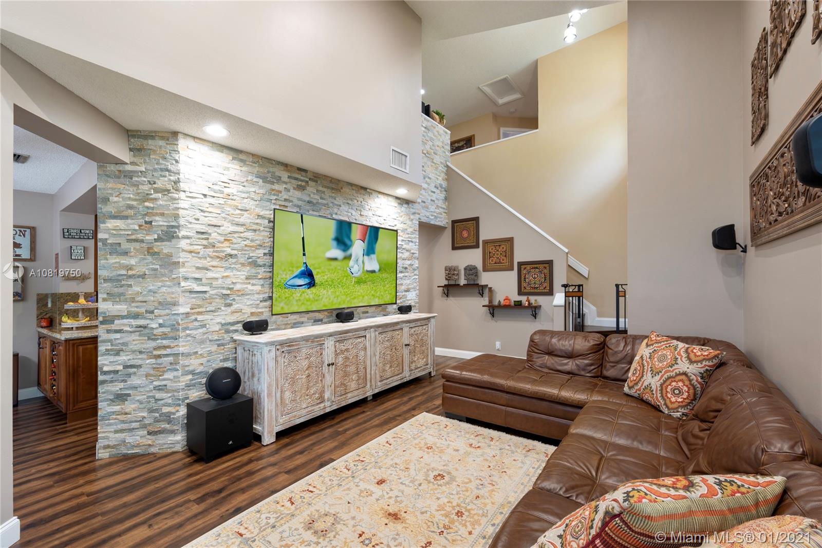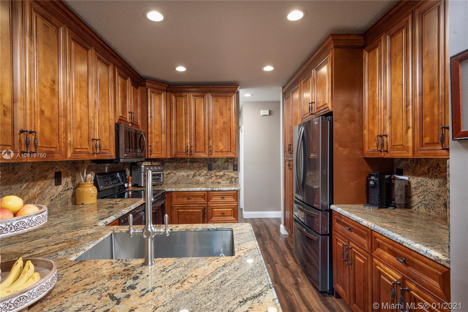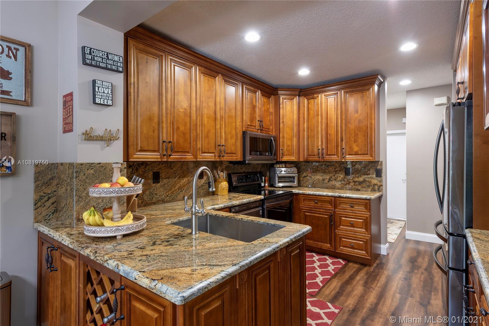 Fully renovated end-unit townhome resting on an oversized lot overlooking the golf course of Grand Palms. This exquisite home features volume ceilings, a gourmet kitchen with high-end counter-tops and stainless steel appliances. Wood floors throughout the home. French doors in the breakfast area lead to the tiled, outdoor patio area. Step outside and enjoy an expansive, fully fenced backyard. The home futures accordion shutters and a long driveway to accommodate parking for multiple guests. Community amenities include pool, child play area and more.