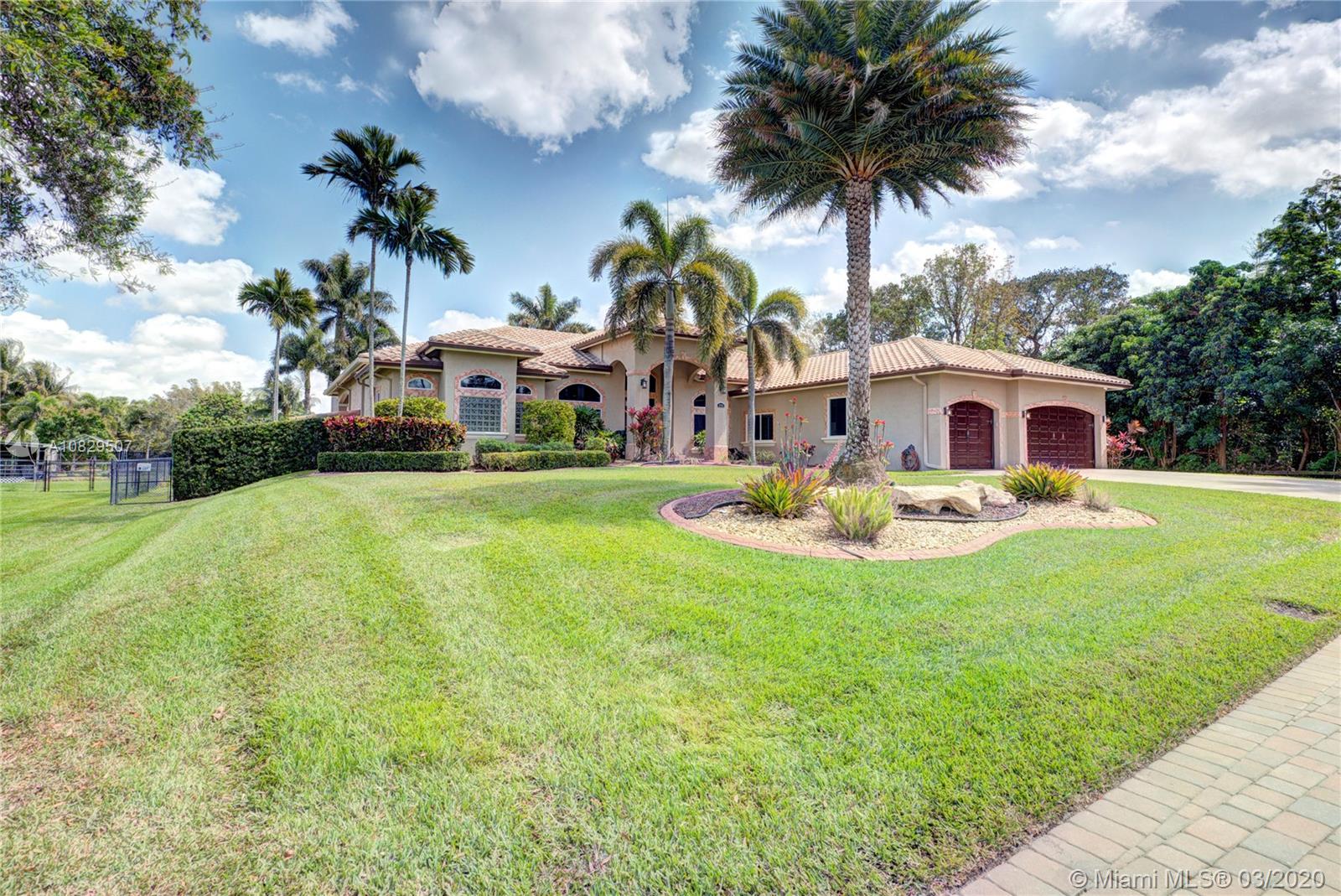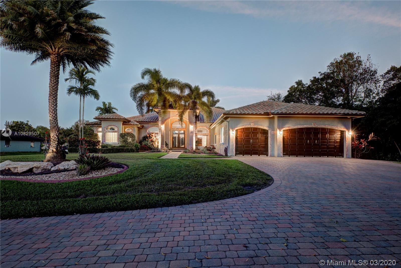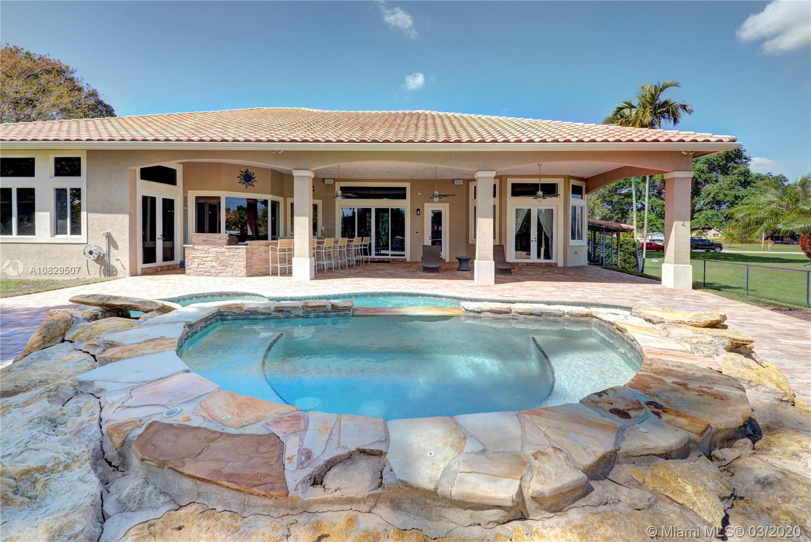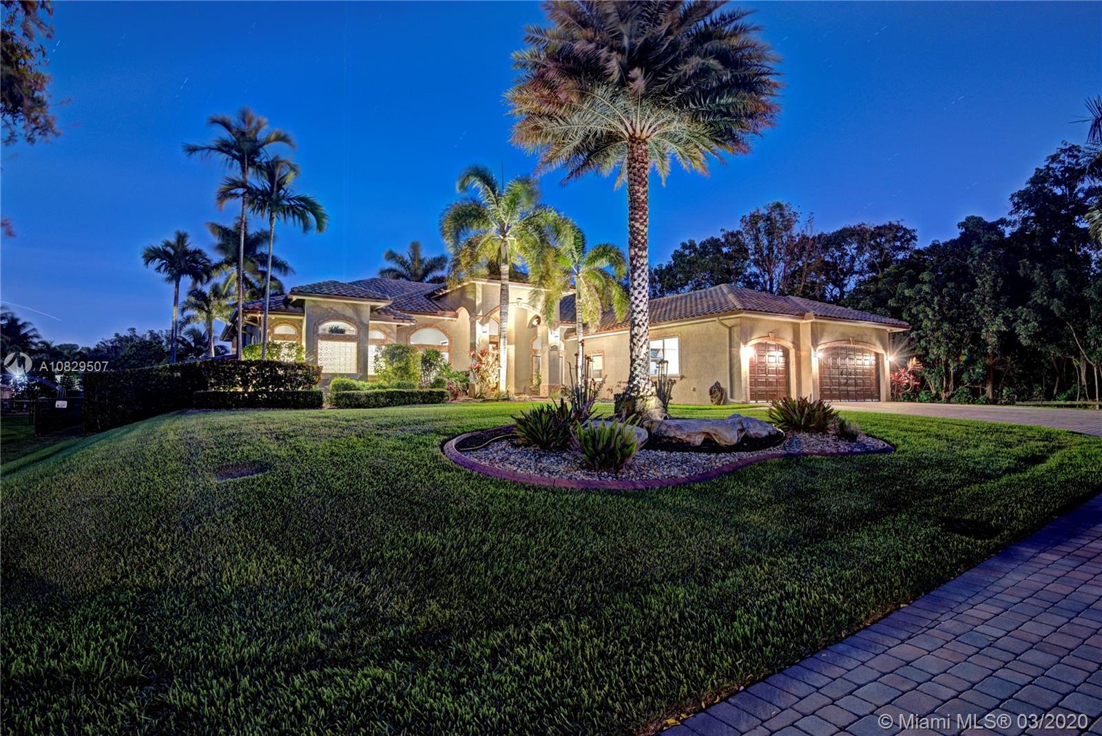 SPECTACULAR ESTATE 1 STORY RANCH STYLE 4 BEDROOM + OFFICE 3 BATH 3 CAR (EXTRA DEEP) GARAGE HOME LOCATED IN SOUGHT AFTER DAVIE, FLORIDA. BUILT ON OVER A BUILDER'S ACRE LOT, SITUATED ON END OF CUL-DE-SAC COMPLETELY UPGRADED WITH EVERYTHING MASSIVE... 14' CEILINGS, IMPACT WINDOWS/DOORS, HUGE KITCHEN, WALK IN PANTRY, ISLAND, CUSTOM CABINETRY, SS APPL, BAR, CROWN MOLDING, WAINSCOTING, OVER-SIZED BEDROOMS, 3 NEW A/C UNITS, NEW WATER HEATER, 9" INTERIOR PANEL DOORS, MASSIVE MASTER BEDROOM/BATHROOM, SPLIT SIDE SINK/COUNTERS, DUAL SHOWER HEADS, ALL CUSTOM CLOSETS. AMAZING RESORT STYLE BACKYARD, HUGE POOL AND SPA, HUGE SUMMER KITCHEN COMPLETE WITH FULL GRILLE, WET BAR, KEGERATOR, LED ROPE LIGHTING AND PLENTY OF GRASS AREA FOR ALL ATHLETICS, EVEN A 30' X 14' ULTRA STURDY STORAGE SHED AND SIDE KENNEL.