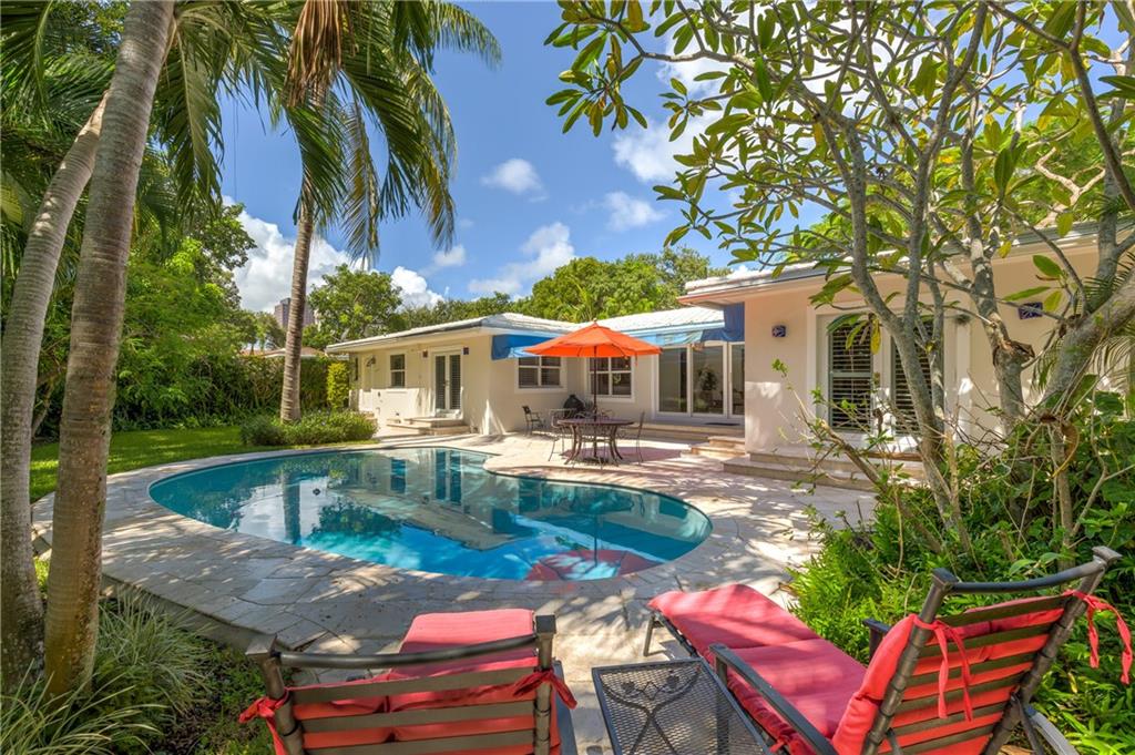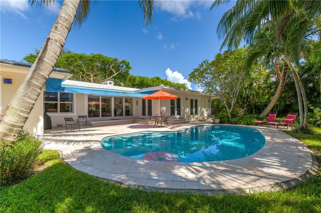 Charming Rio Vista 4 bedroom, 3 bath home on a rare, double lot (12,500 sq. ft.). Beautiful backyard with covered lanai, patio and free form pool. Lush, tropical landscaping surrounds the yard for privacy and ideal entertaining. Spacious interior includes formal living room with wood burning fireplace, formal dining, large family room with sliding glass doors that open to the patio and pool, and an office or den with sliding glass doors to the lanai. Remodeled kitchen has eat-in dining space, stainless steel appliances with wine cooler and gas cooking. Move-in ready with impact windows and doors and a newer roof (2017).