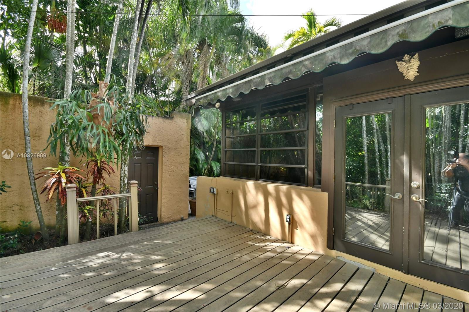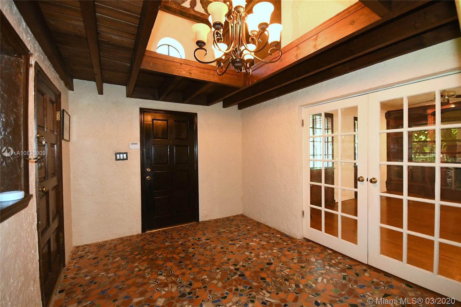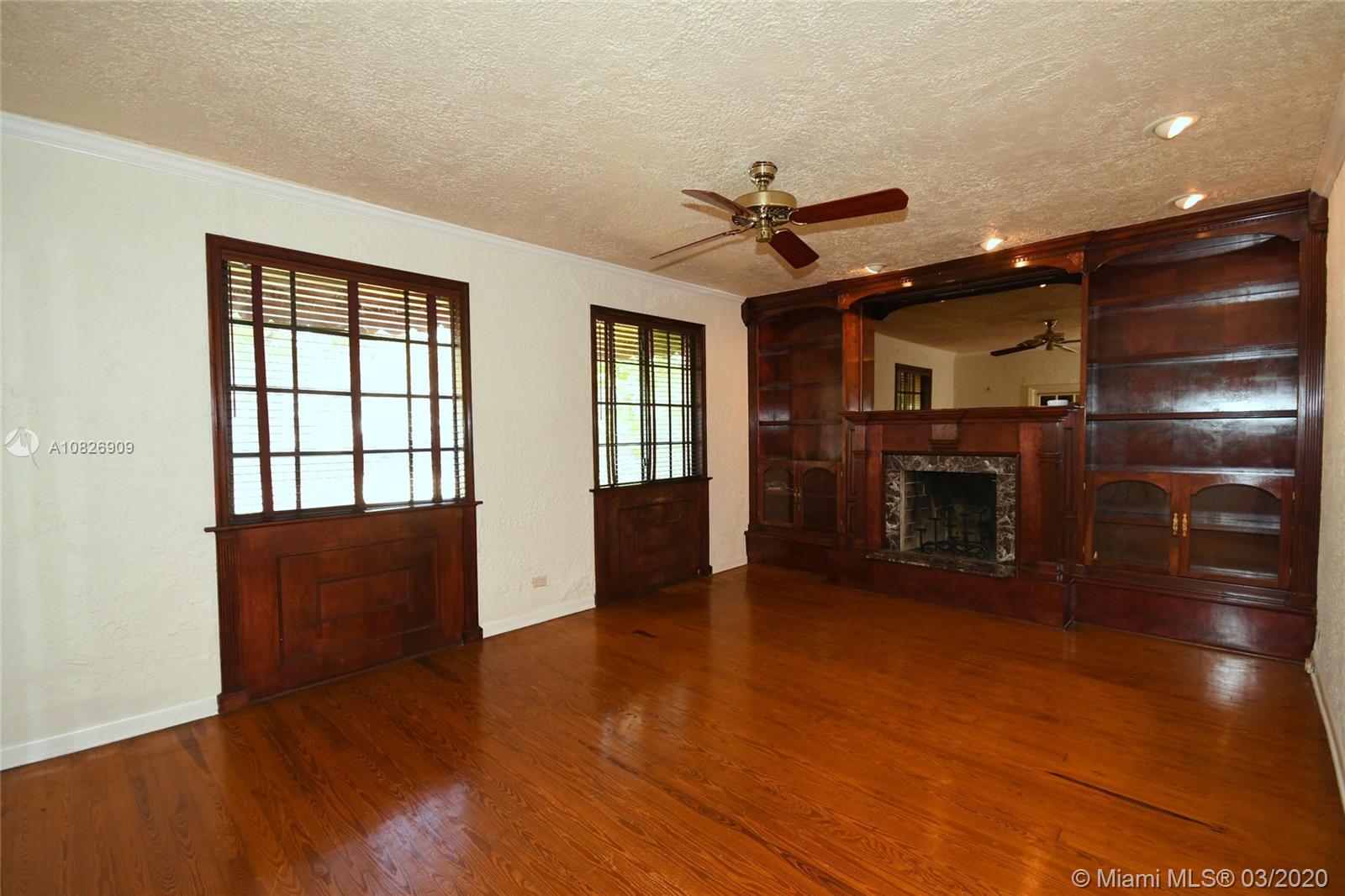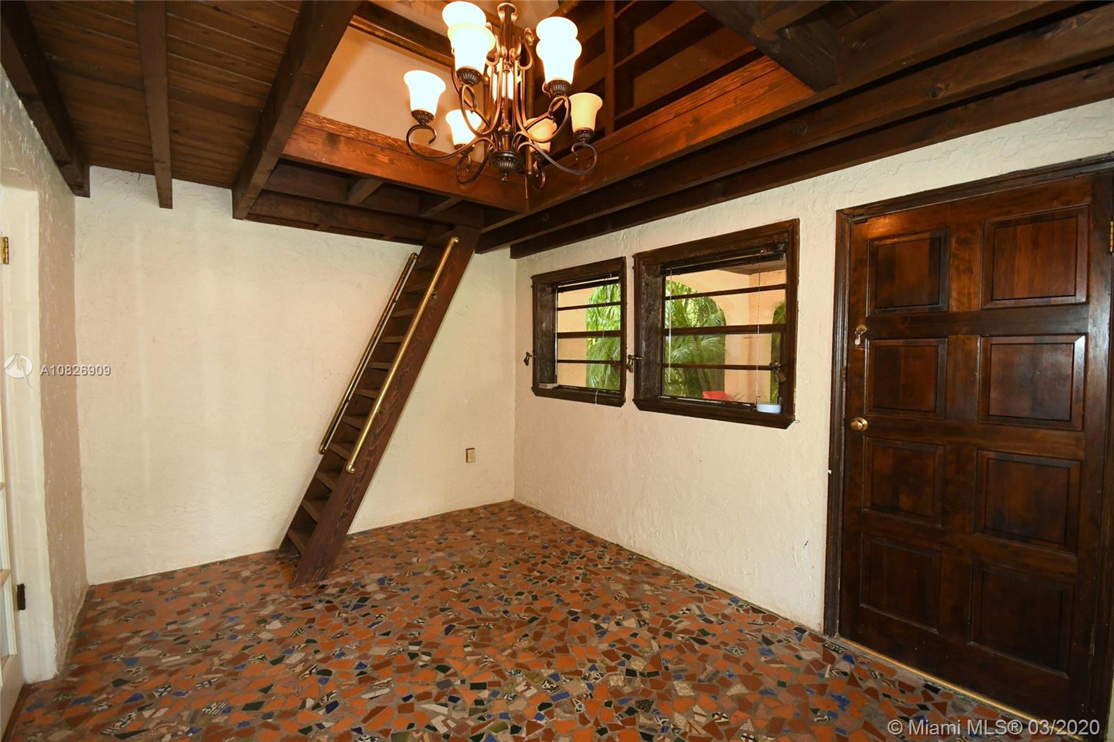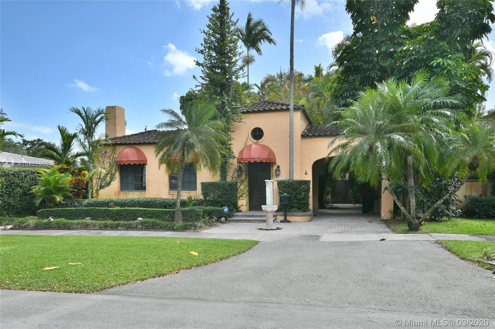 1930 Old Spanish style house full of old-world charm, elegance and ambiance. Located on a tranquil Coral Gables tree-lined street within walking distance to UM. This 2/2 (tax records indicate 3/2) has original tumble stoned floors in the foyer. Loft library with hand-painted mural, formal living room w/ hard wood floors, wood burning fireplace framed by custom made wood book shelves, formal dining room, updated kitchen with stainless steel appliances, large bright family room that leads to a deck and lush tropical garden perfect for entertaining. Covered carport and detached garage which can be turned into an office, art studio or play room. Just perfect if you are just starting off or looking to down-size. 1 Yr. Home warranty. Roof repaired Oct. 2019 w/ 5 yr. warranty.