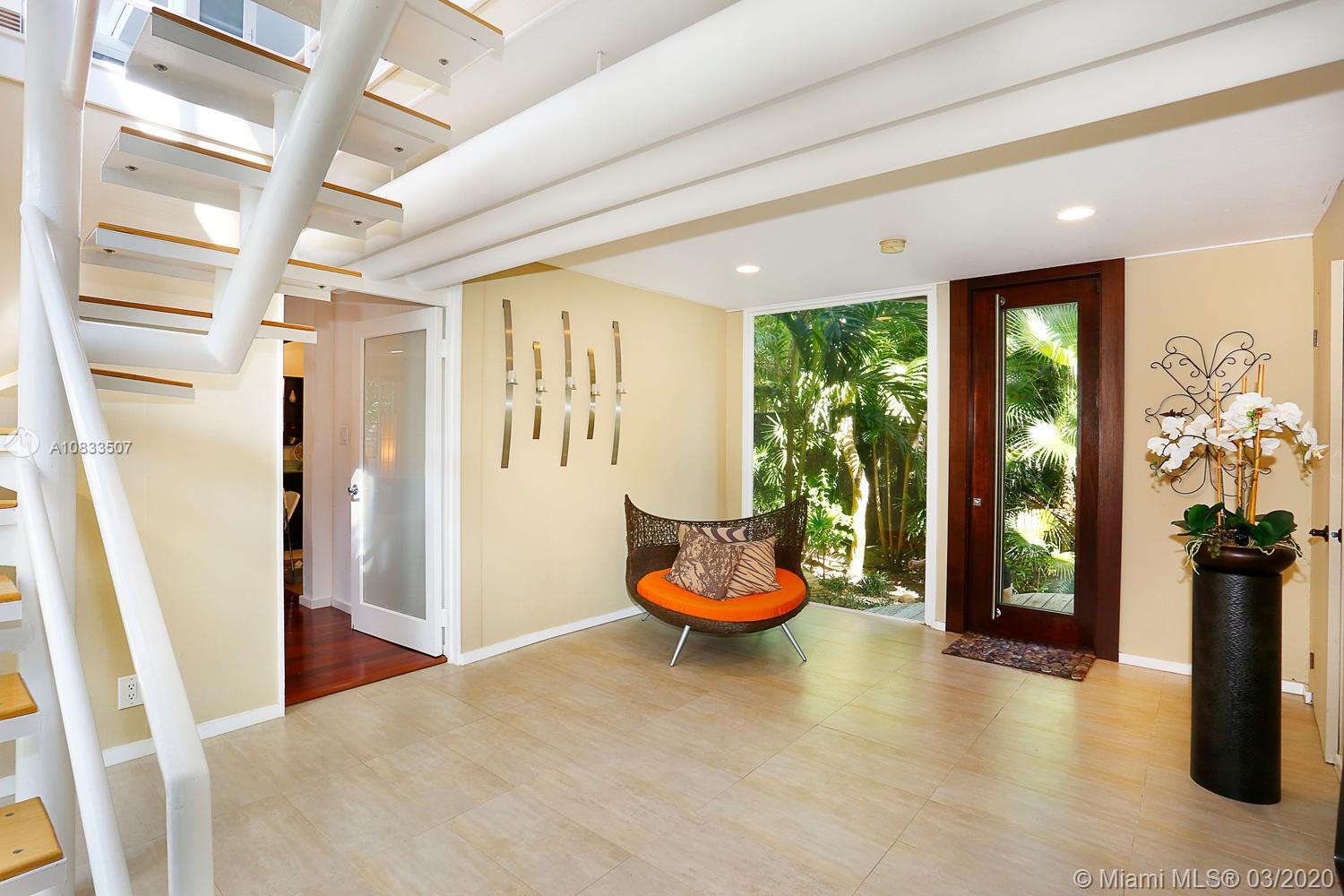 Unique, tri-level home on Utopia Court, a coveted South Grove cul-de-sac. Walls of glass throughout, overlook lush tropical greenery & majestic oaks. Light-filled living spaces with a soothing color palette, volume ceilings & wood flooring. Ground level master + two additional bedrooms. Second level: 4th BR/BA + main living area and stunning kitchen featuring white, European-style cabinetry, quartz countertops, gas range & bar w/seating. Bonus: third level office/den + loft area. Enjoy year-round outdoor living & entertaining on the tranquil screened porch and lovely gardens that surround the home. Walk to the Grove village center’s galleries, boutiques, cafes and bayfront parks & marinas. Minutes to downtown, MIA, Coral Gables, Key Biscayne and the Beaches.