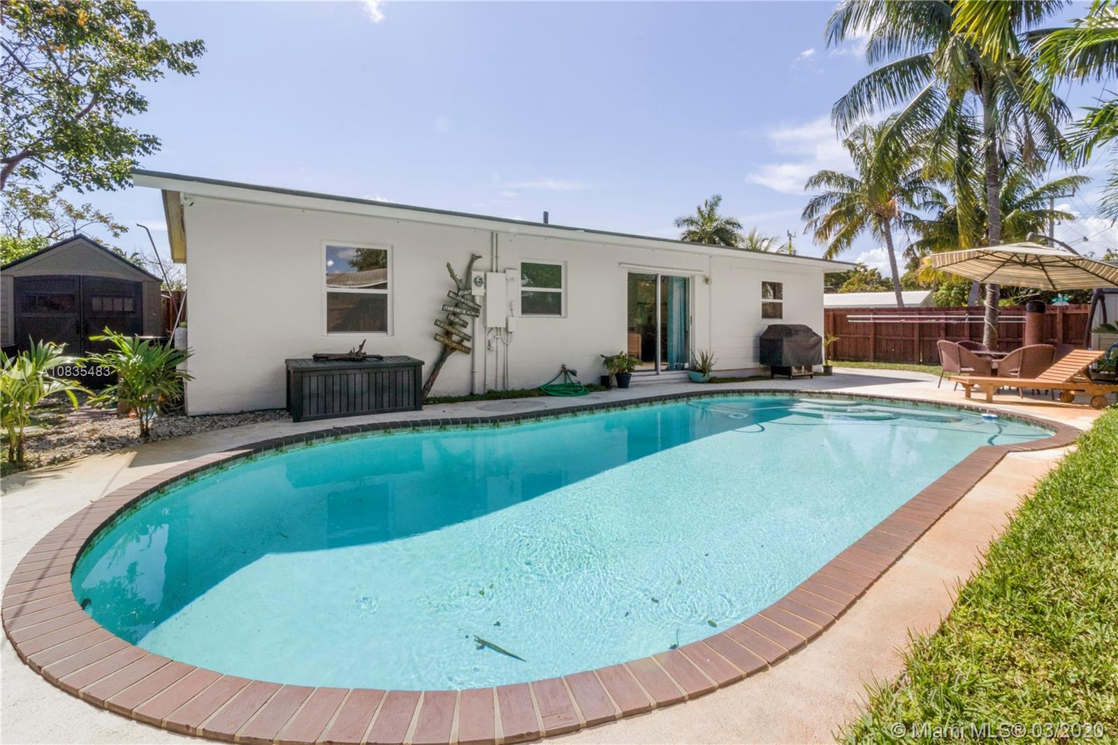 Priced below Appraised Value! Turnkey 2 bedrooms, 1 bathroom home featuring elegant wood laminate floors throughout the home, with ample and bright open spaces and plenty of natural light entering through the hurricane impact windows. The updated kitchen offers dark wood cabinetry with granite countertops, designer backsplash, and stainless steel appliances. Retreat to your bedroom and relax or choose to exit the sliding glass doors to your exclusive swimming pool and backyard hosting tropical plants, space to set up your gourmet outdoor grill plus have enough space to build your kids a swing set, park your boat or RV or simply have extra space to host your favorite celebrations. Carport with extra storage and one storage shed in the backyard plus a newer roof and plumbing on a corner lot.