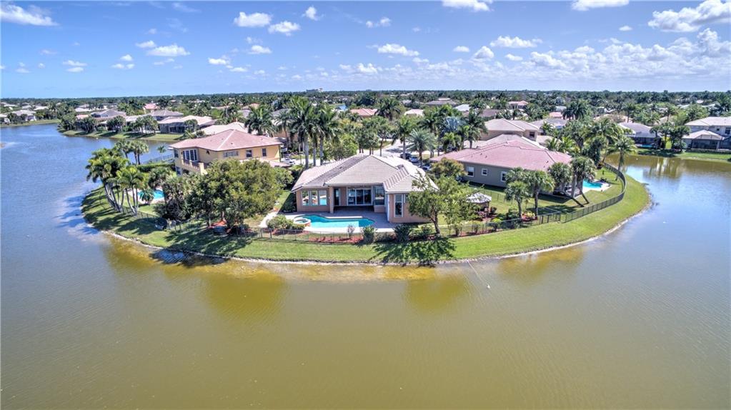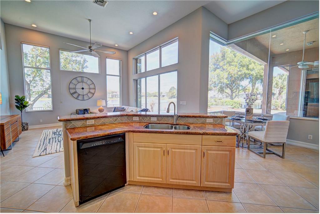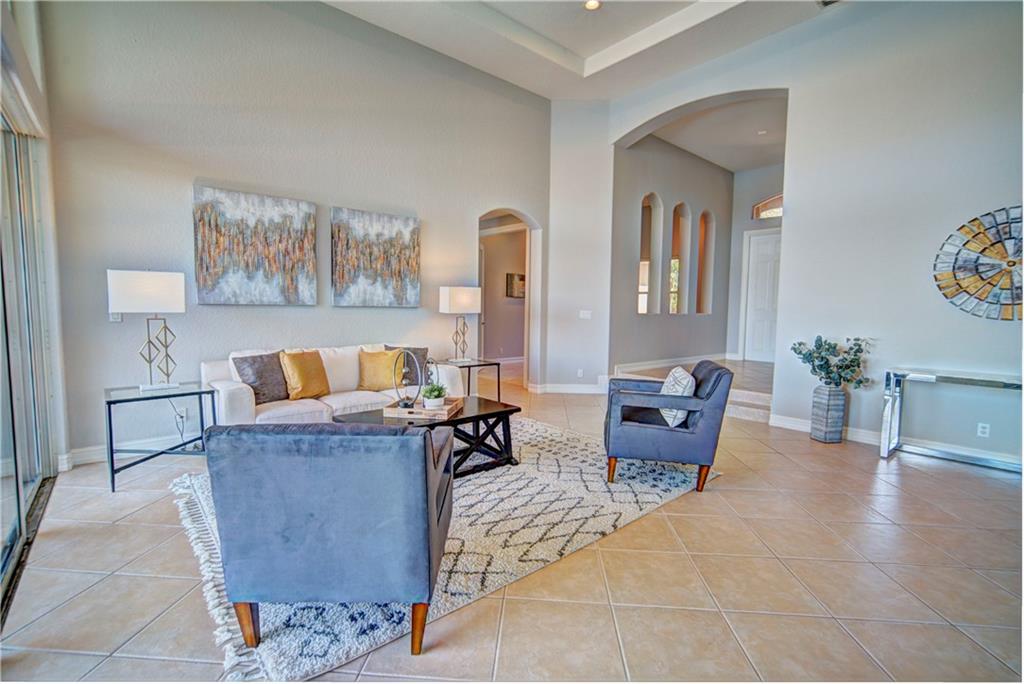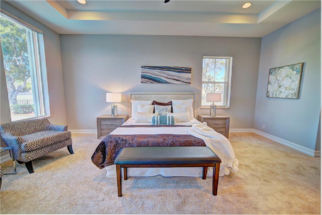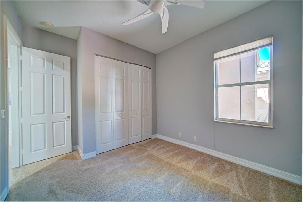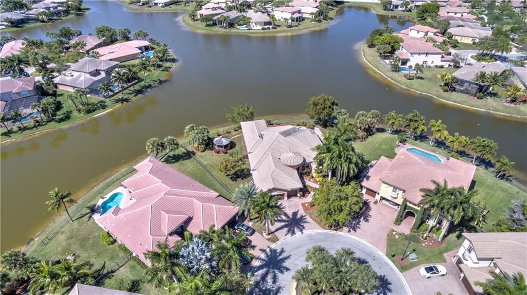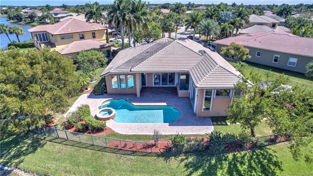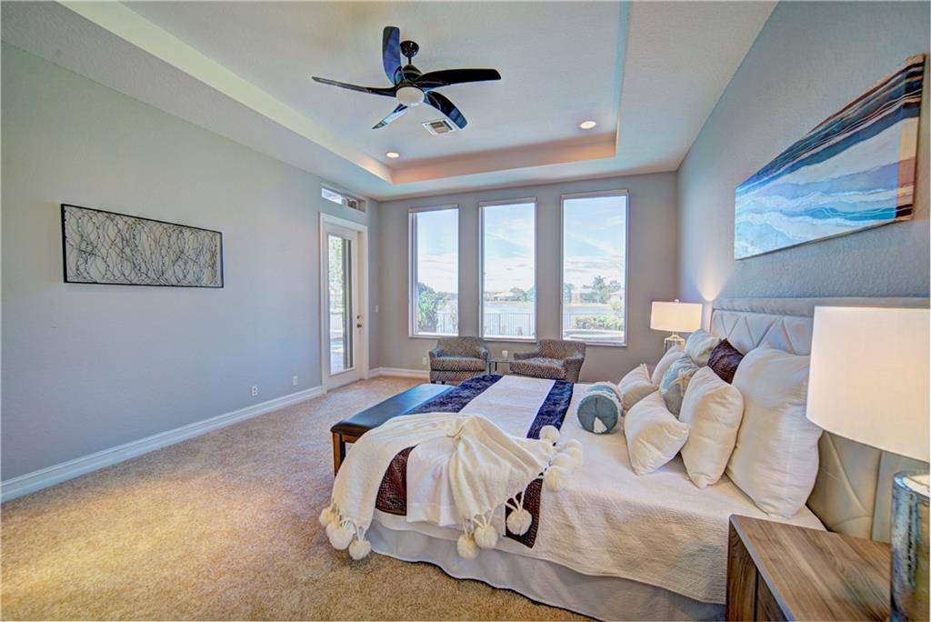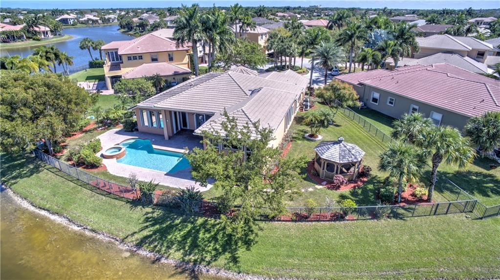 Enjoy sunrise to sunset views from your own backyard in this breathtaking, 175 foot wide waterfront cul-de-sac lot! Freshly painted 4 bedroom, 3 bathroom pool home with neutral tile floor, brand new carpeting in all bedrooms, and accordion shutters throughout. Master suite has amazing views of the pool and lake, in addition to his & hers built-in walk-in closets, bath with dual vanity sinks, glass shower, and whirlpool spa tub. Soaring 15 foot ceilings throughout main living areas. Open kitchen with granite countertops, wood cabinets, and island with bar stool seating. Bonus area perfect for office or game room. Large fenced-in yard for families and pets, screened-in Gazebo on side of house. Live in an exclusive guard gated community with resort style amenities and attend A rated schools!