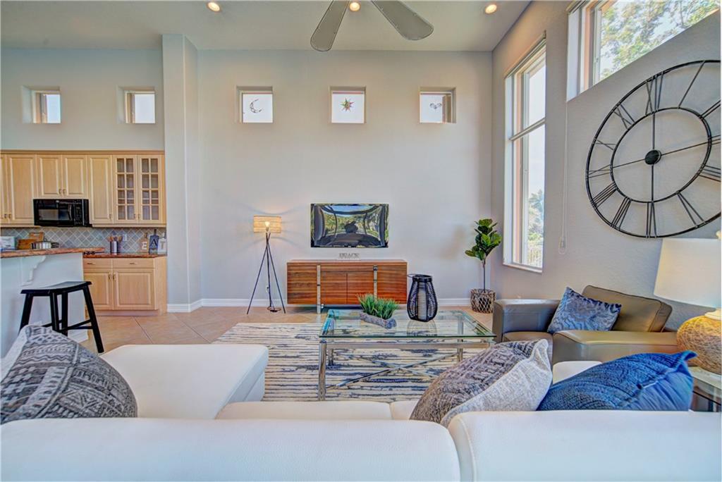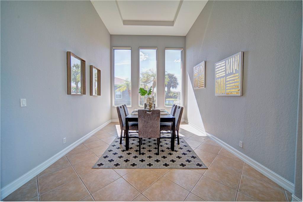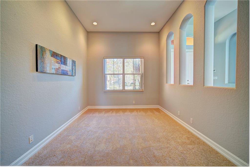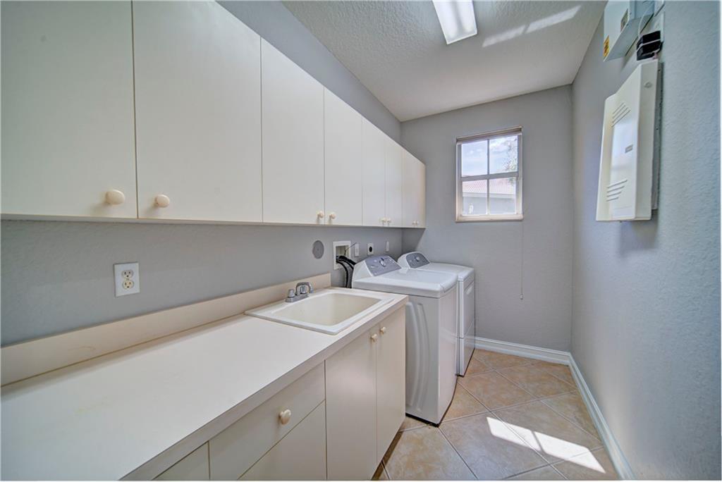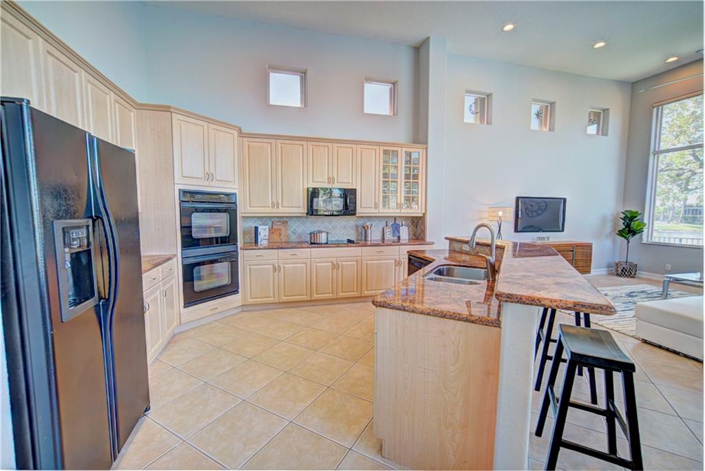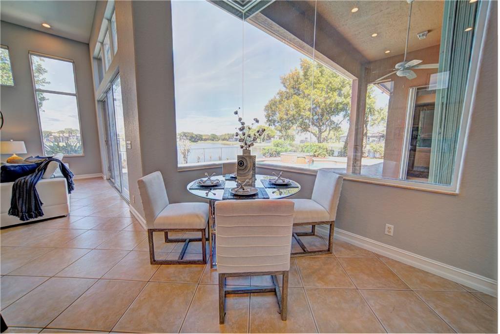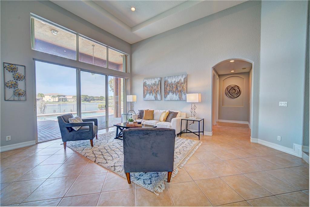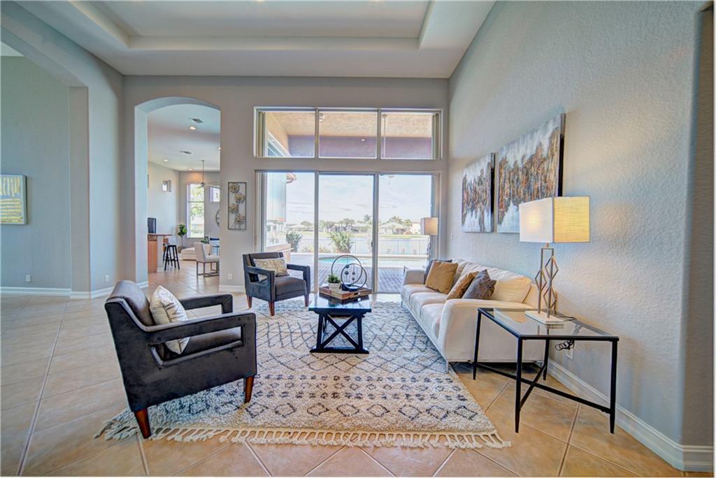 Enjoy sunrise to sunset views from your own backyard in this breathtaking, 175 foot wide waterfront cul-de-sac lot! Freshly painted 4 bedroom, 3 bathroom pool home with neutral tile floor, brand new carpeting in all bedrooms, and accordion shutters throughout. Master suite has amazing views of the pool and lake, in addition to his & hers built-in walk-in closets, bath with dual vanity sinks, glass shower, and whirlpool spa tub. Soaring 15 foot ceilings throughout main living areas. Open kitchen with granite countertops, wood cabinets, and island with bar stool seating. Bonus area perfect for office or game room. Large fenced-in yard for families and pets, screened-in Gazebo on side of house. Live in an exclusive guard gated community with resort style amenities and attend A rated schools!