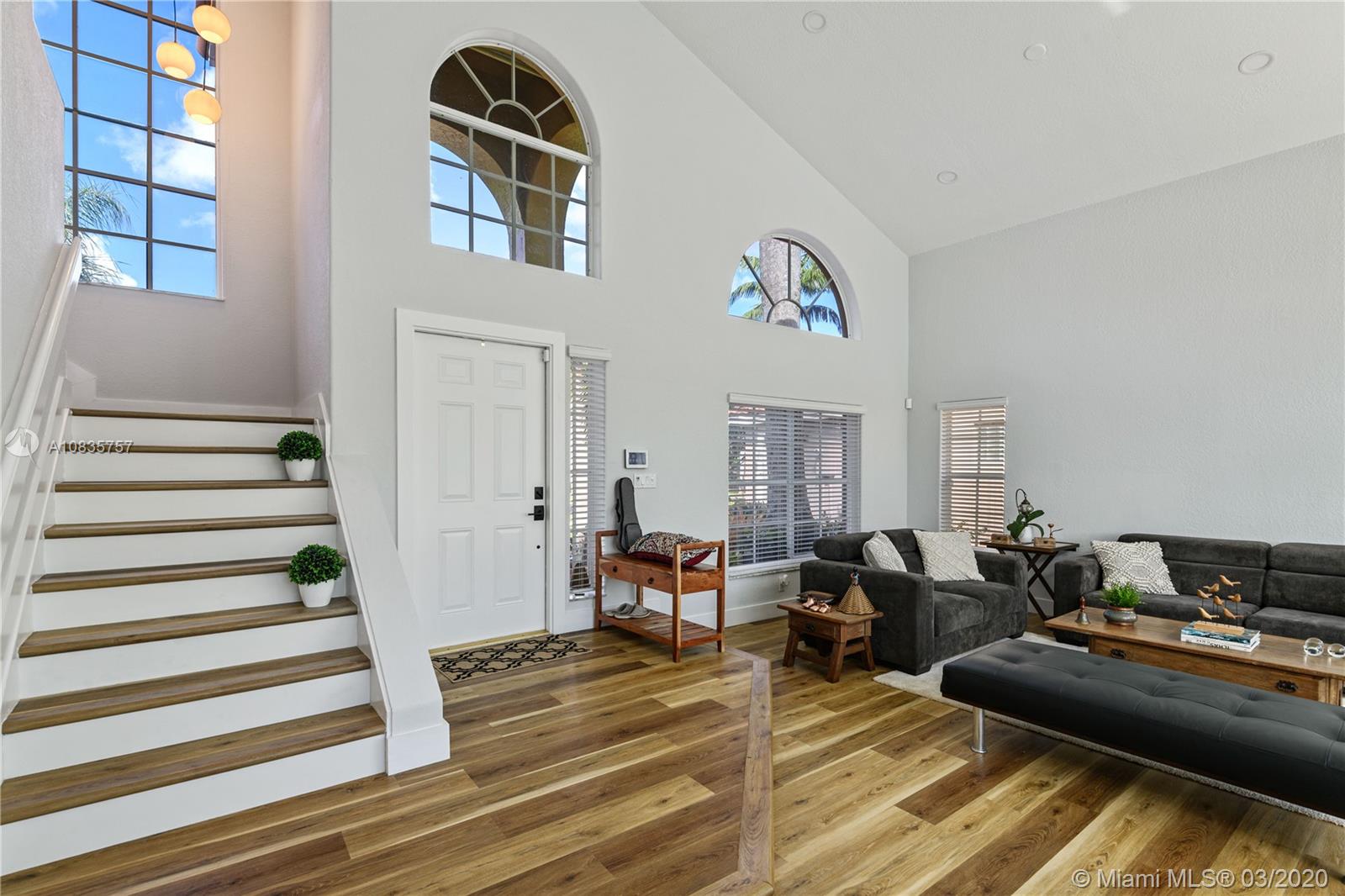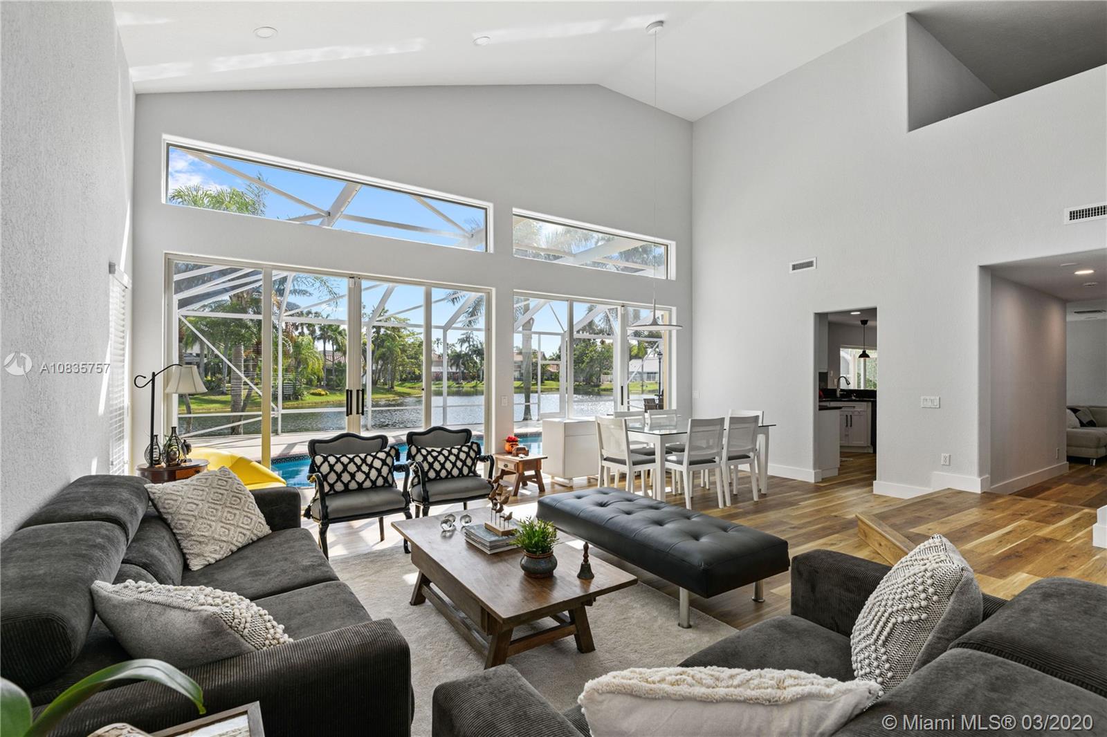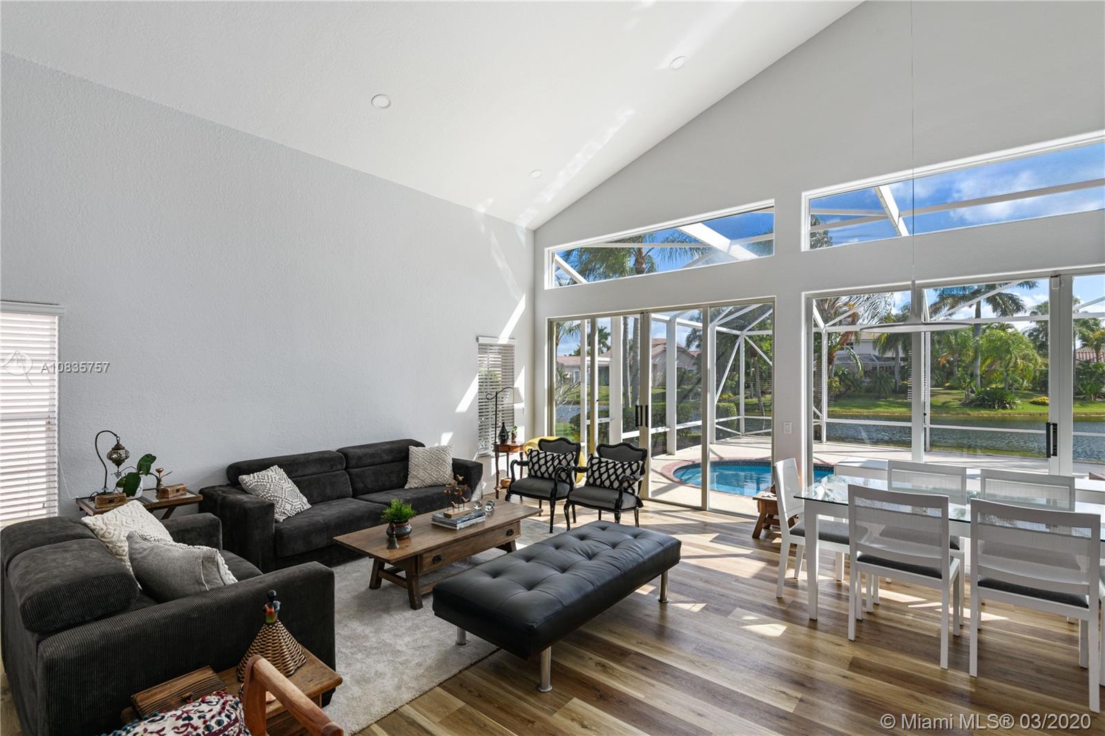Beautiful and bright two-story lakefront home located in prestigious gated community of Laguna Spring II. Completely upgraded and recently painted, this home features three bedrooms and two and a half baths. Kitchen with wood cabinets, stainless steel appliances, granite countertops. New floors, high ceilings and all the bathrooms are tastefully remodel. The garage has central A/C, Built-Ins, sink and sound system. Oversized screened patio with free form heated pool with top of the line Jacuzzi & oversized BBQ Grill. This pristine lake front home its gorgeous inside and outside with spaces designed for family living and entertaining.