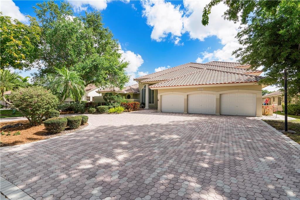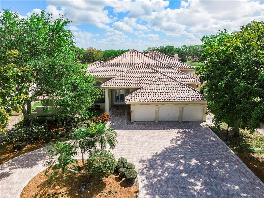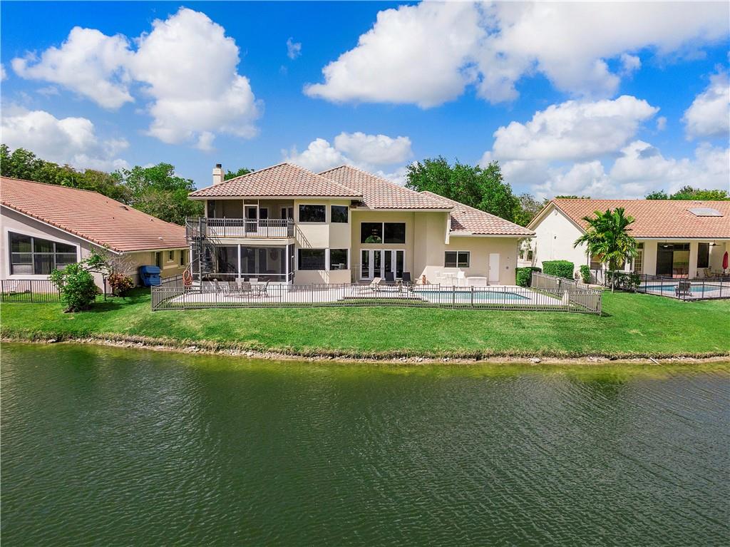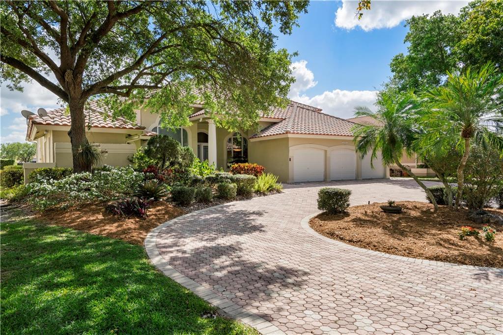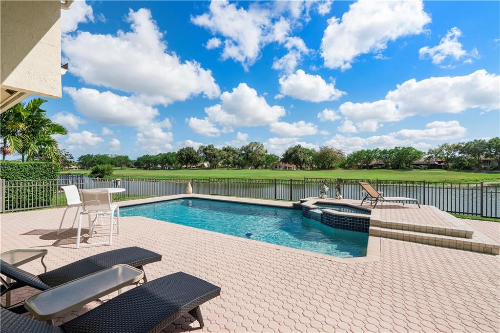 Spectacular 5 Bed 3 full and 2 half bath custom home on wide waterfront lot with panoramic golf course views. Rolling greens and flowing waterway provides million dollar views from living areas, pool, over sized patio and 2nd floor balcony. Chef's Kitchen has granite counters, stainless steel appliances including, 4 Burner Gas Cook-top, side by side refrigerator and more!! All Impact Windows and Doors! (Except 3 Windows in Front). Interior freshly painted. All bathrooms remodeled. Spacious family room with custom entertainment style wet-bar. Gorgeous bamboo wood and lucite staircase to 2nd Floor master suite & large sitting room. Built in closet systems. Neutral marble,bamboo wood and tile floors. Huge circular drive, 3-Car Garage,3-zone A/C. Security & central vac systems.