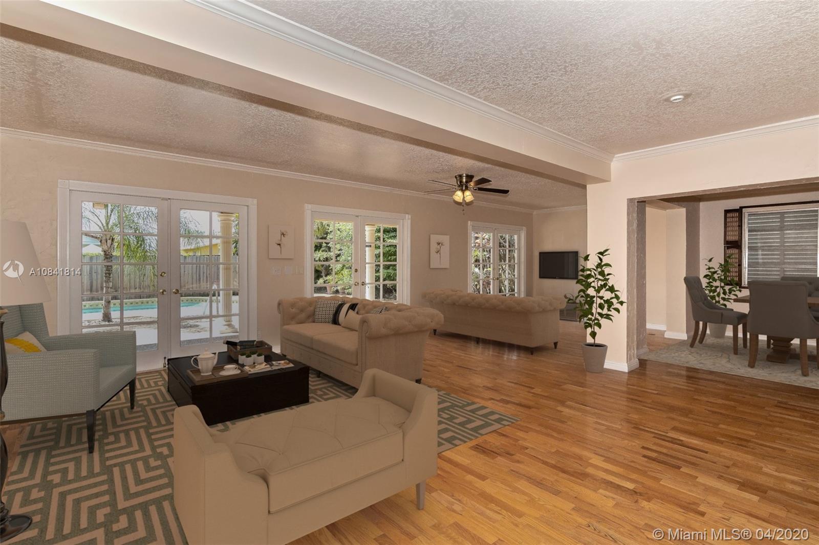Large & open floor plan with rooms so great one expects to see only in much larger homes. You will fall in love with this this charming 4 bedroom 2 bath home. Special features include hardwood floors throughout, updated kitchen with granite countertenors, stainless steel appliances & wood cabinets, newer bathrooms with modern mosaic tile patterns. Newly updated sprinkler system will ensure your lush tropical landscaping flourishes. Large pool and deck area ideal for entertaining. Stunning curb appeal by way of the charming columns & brick facade. Centrally located within the Hollywood Hills Subdivision (no HOA), walking distance to TY Park, less than a mile to I95, 7 min drive to the beach & 10 to FLL Airport. Corona ready and available for your private viewing, just call listing agent.