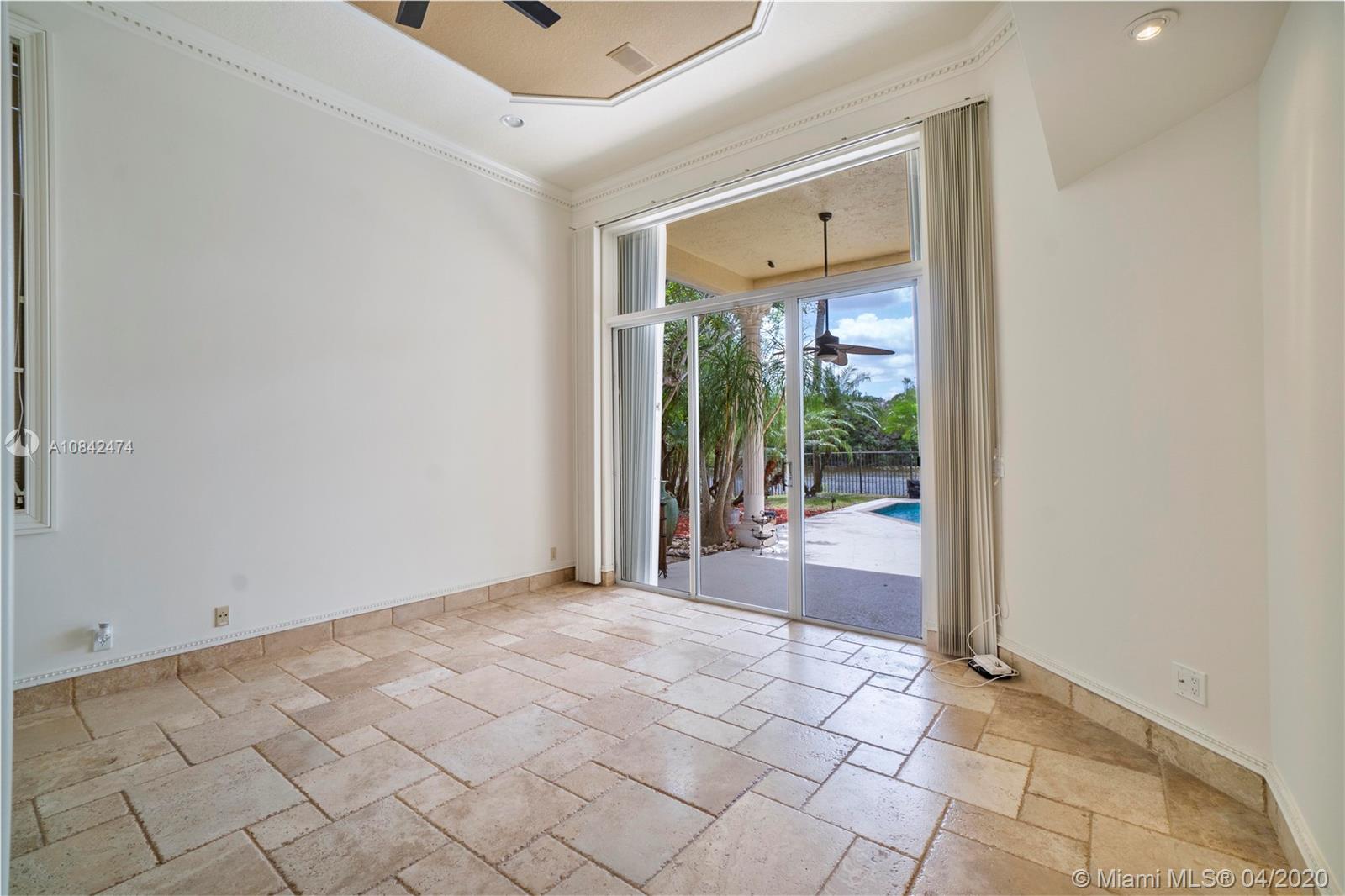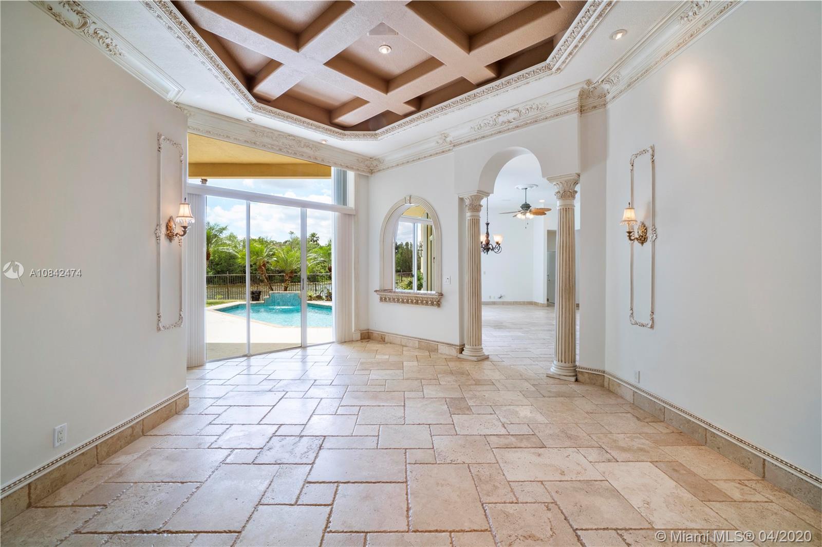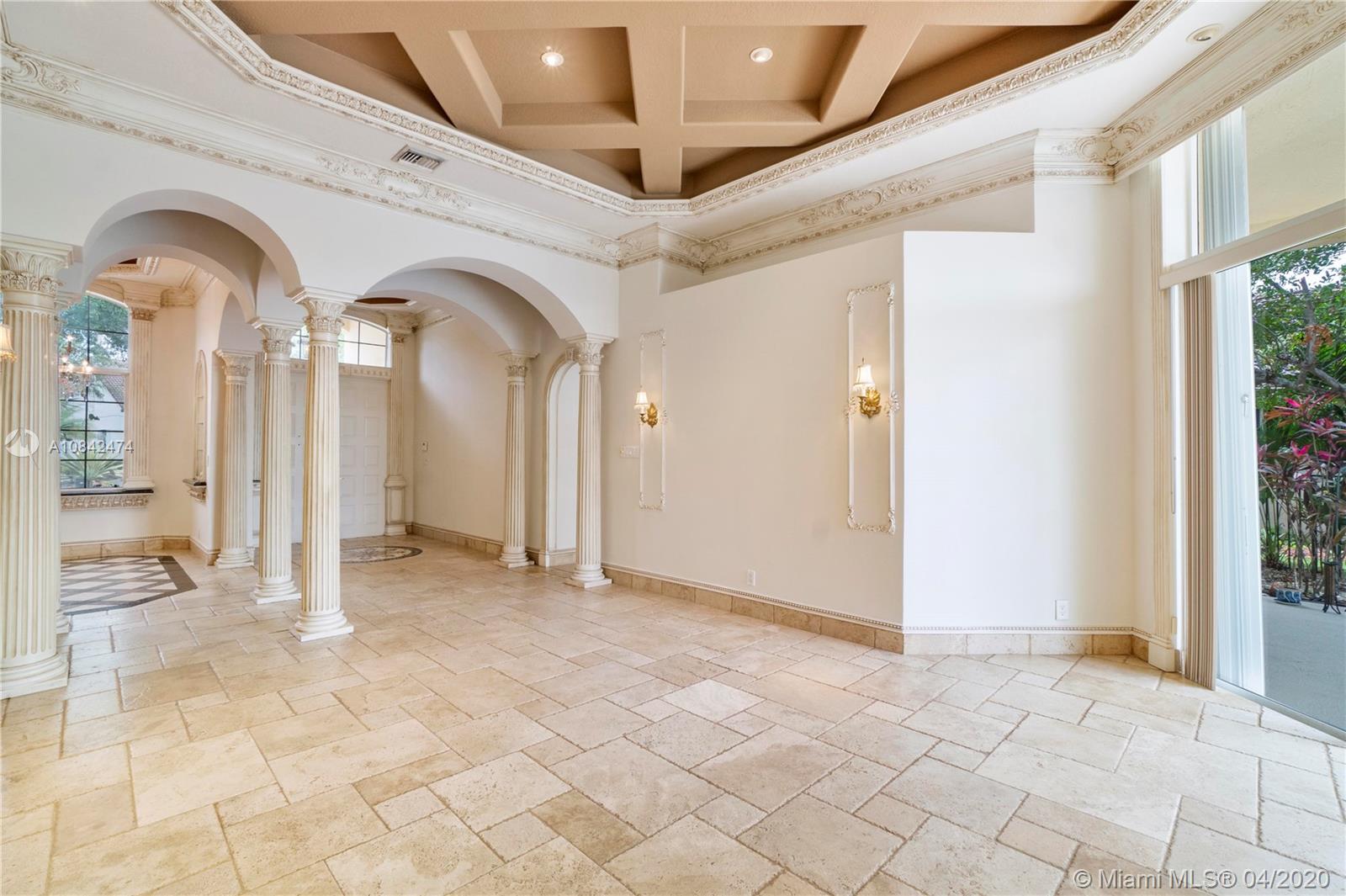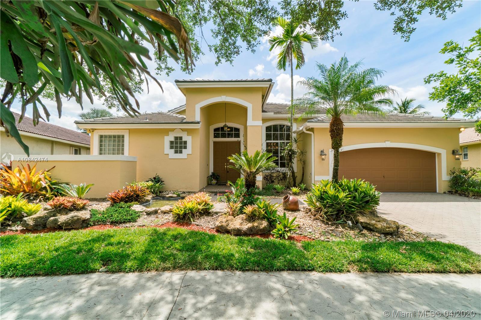Magnificent designer's home in Weston Hills CC - featuring: dramatic foyer with beautiful marble medallion - 12 ft ceilings in living areas - travertine floors - formal columns leads down grand cathedral style hallway - breathtaking decorative crown moldi ngs - SS KitchenAid appliances - granite counter tops -Freshly Paint- Roof Replace in 2015 in master bed/bath - rainfall shower jets & duel decorator sinks in master bath - private backyard with spectacular wide water views - accordion shutters - 3D Virtual Tour Available please contact for more info