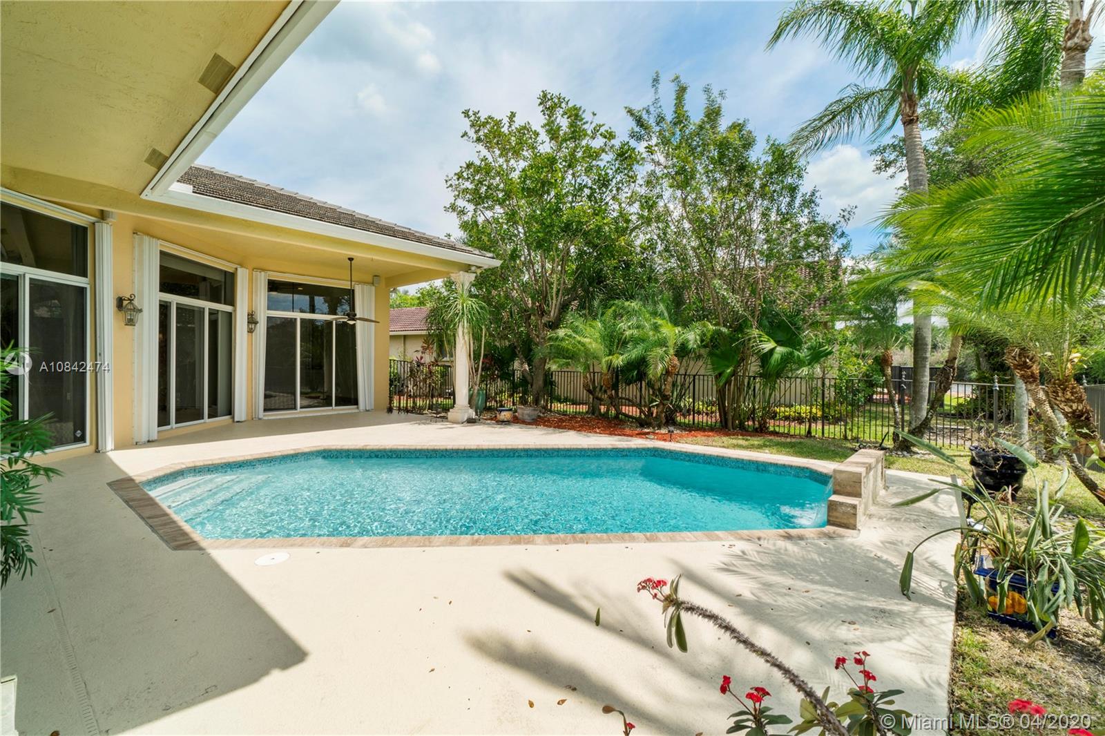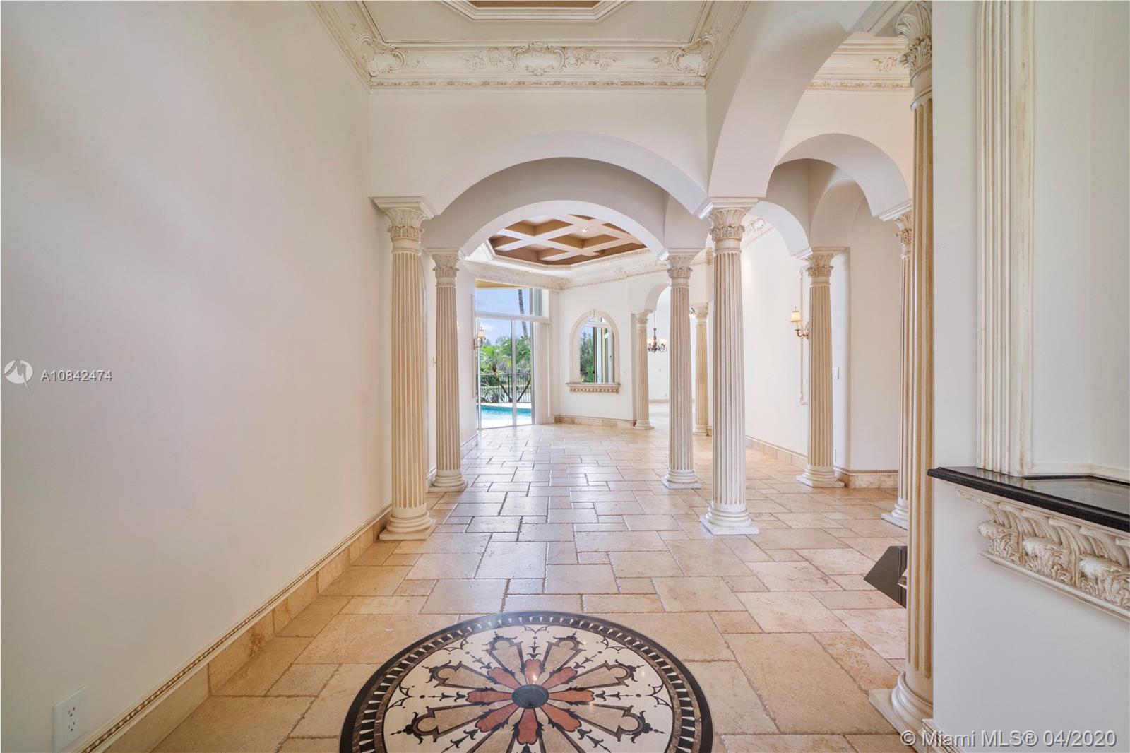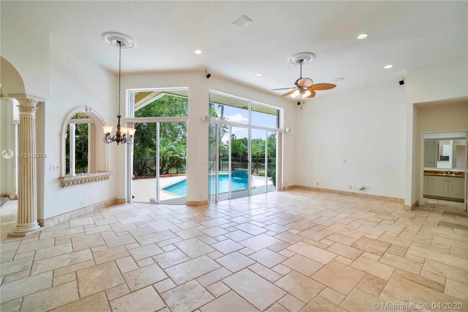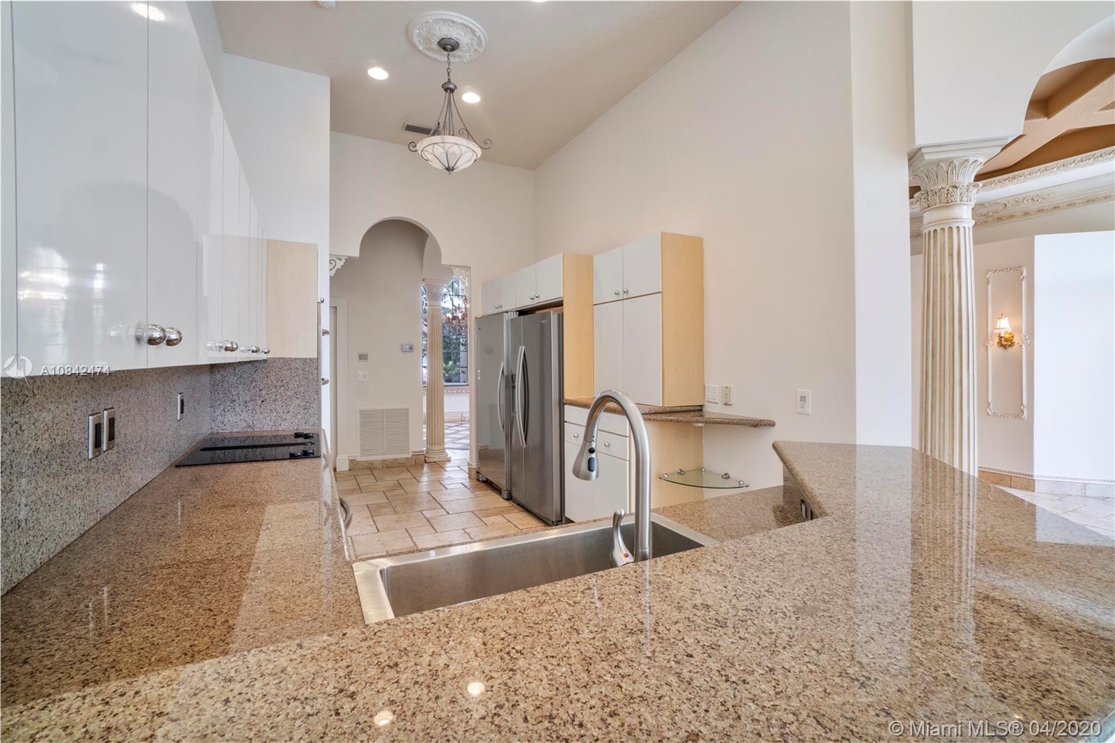 Magnificent designer's home in Weston Hills CC - featuring: dramatic foyer with beautiful marble medallion - 12 ft ceilings in living areas - travertine floors - formal columns leads down grand cathedral style hallway - breathtaking decorative crown moldi ngs - SS KitchenAid appliances - granite counter tops -Freshly Paint- Roof Replace in 2015 in master bed/bath - rainfall shower jets & duel decorator sinks in master bath - private backyard with spectacular wide water views - accordion shutters - 3D Virtual Tour Available please contact for more info