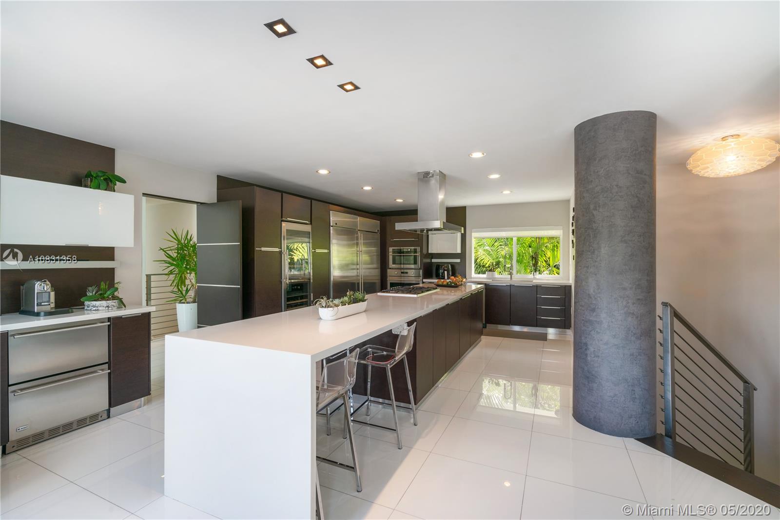 Modern 4,539 SF, 6 Bedroom/4.5 Bath exquisitely remodeled home on gated 25,663 SF corner lot in Coral Gable’s prestigious Platinum triangle. 12’ ceilings, crystal white floors, contemporary lighting, stainless steel railings and impact windows with powered window shades highlight a bright, open multi-level floor plan. Features contemporary Italian kitchen, top of the line Sub-Zero/Monogram appliances, designer bathrooms with skylight and large shower in MBR,custom walk-in closets and built-in cabinetry. Installed security/video surveillance and surround system. Large downstairs entertaining area with bar/kitchenette. Spacious 3-car garage and huge driveway. In this ideal family home, covered terraces open to a unique pool and incredible backyard where large trees provide natural privacy.