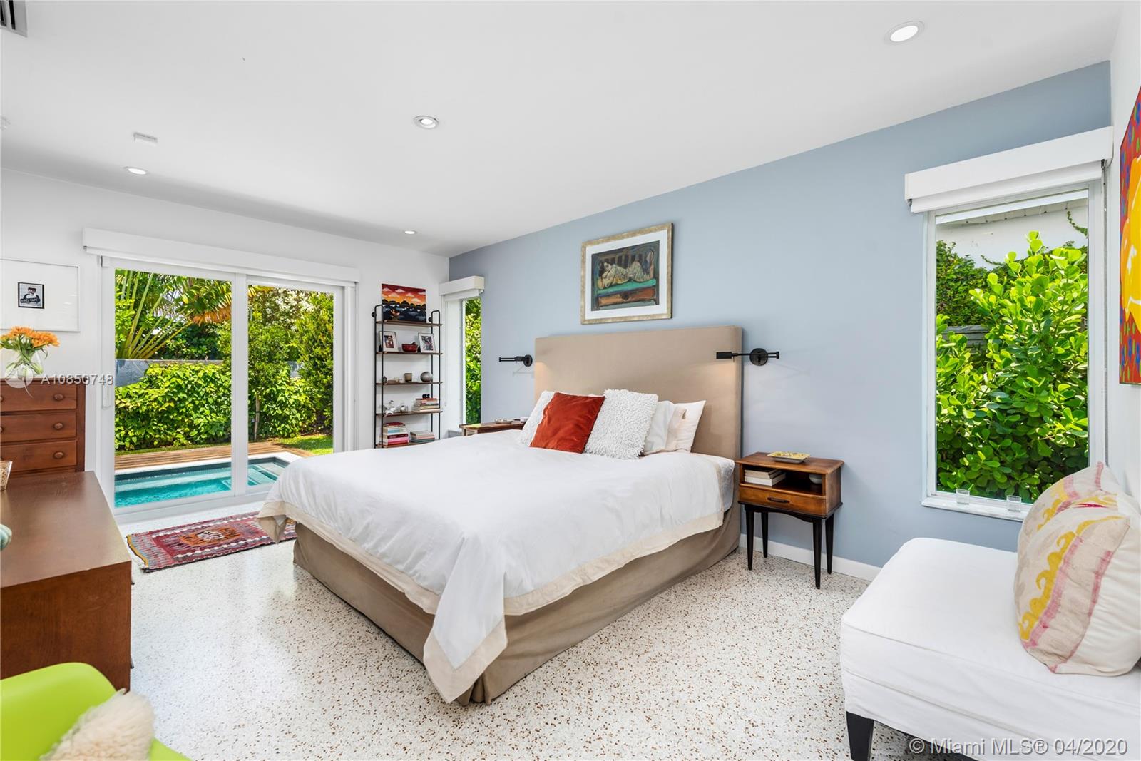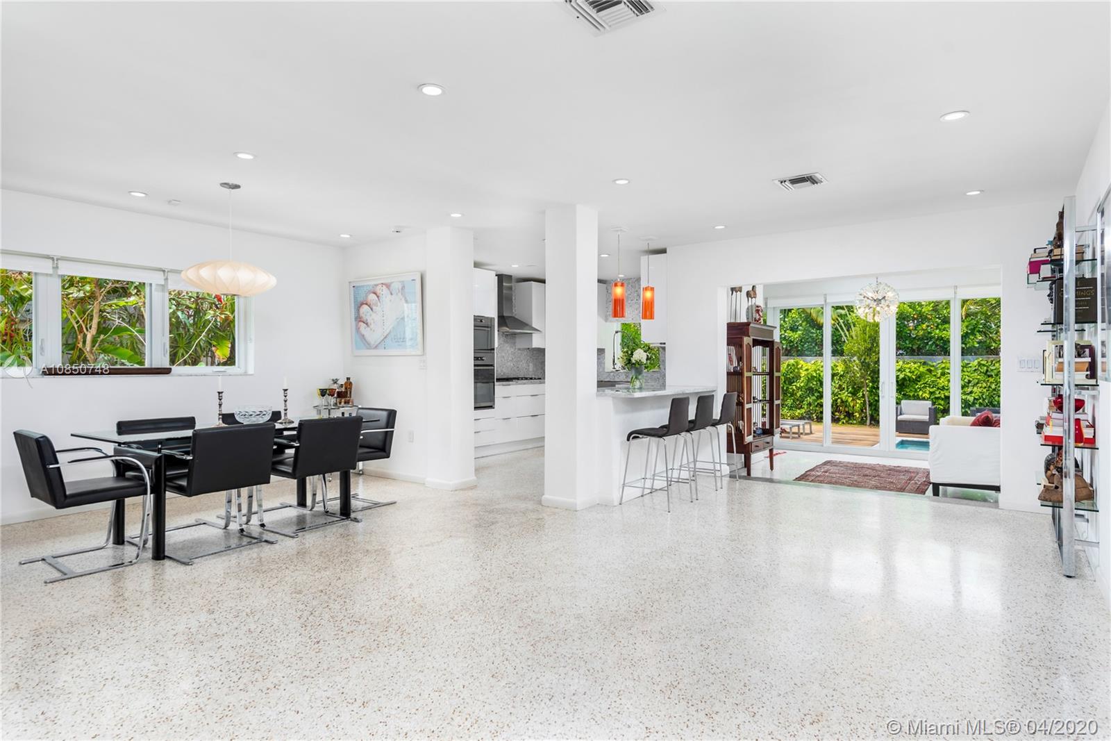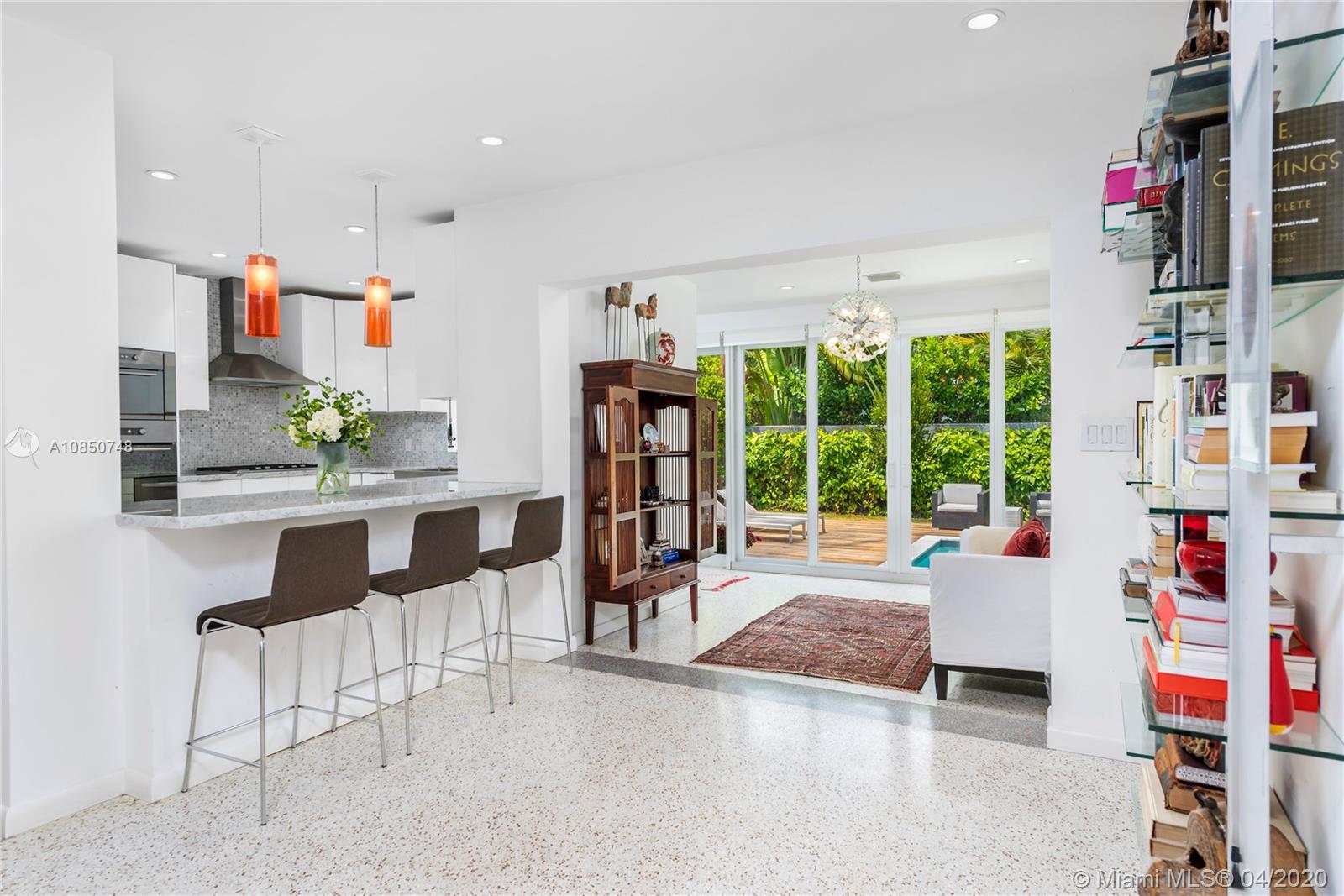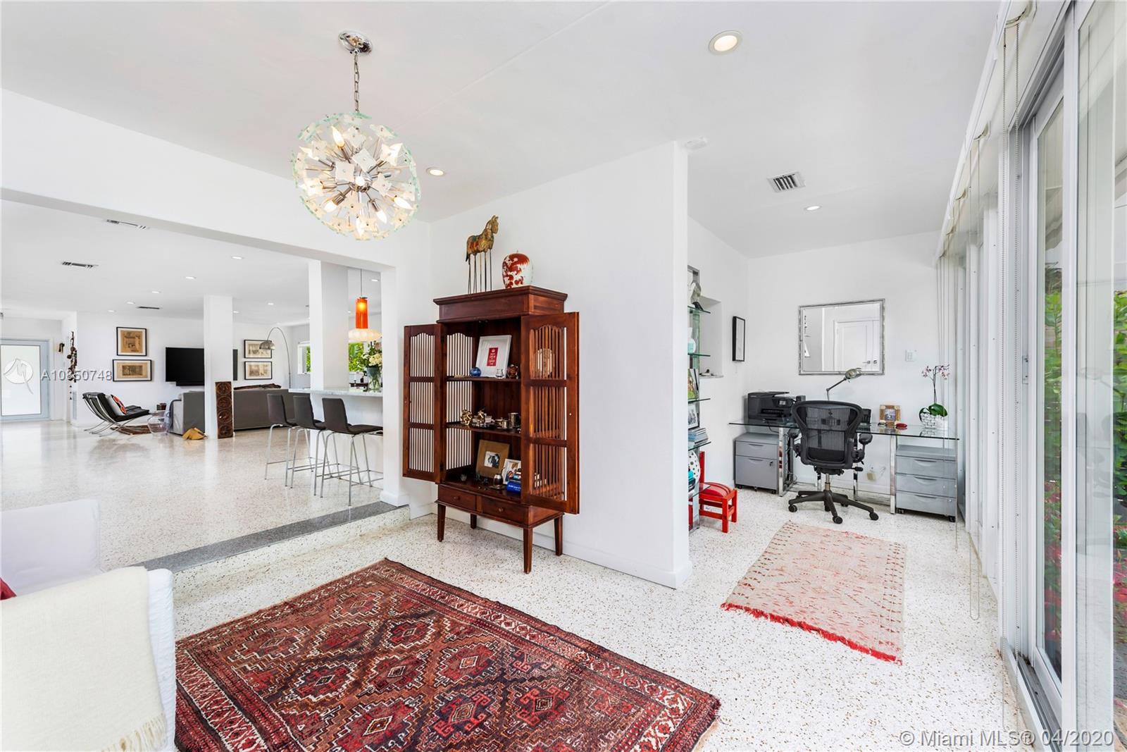 Contemporary Mid-Century pool home features light filled open-concept living with a museum-like aesthetic that resonates throughout. Flowing grand living spaces showcase the ultimate curated gallery wall. Brilliant terrazzo floors throughout contribute to the airy ambience. Modern eat-in kitchen offers Carrera marble counters & S.S. appliances w/ gas stove & custom cabinetry. Tropical landscaping hedges a private & tranquil backyard oasis w/ pinewood deck & white Thassos Marble Pool. Family friendly split floor plan + separate office/den. 1 car garage offers built in storage & laundry. Other features include, new roof, high impact glass windows & doors. Located on the best street in coveted Lakeview neighborhood.