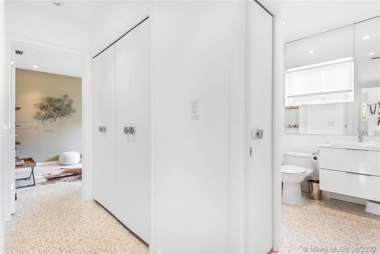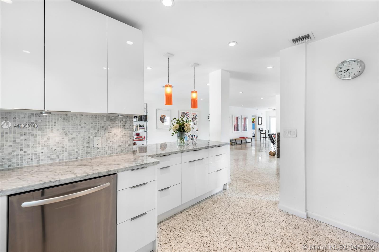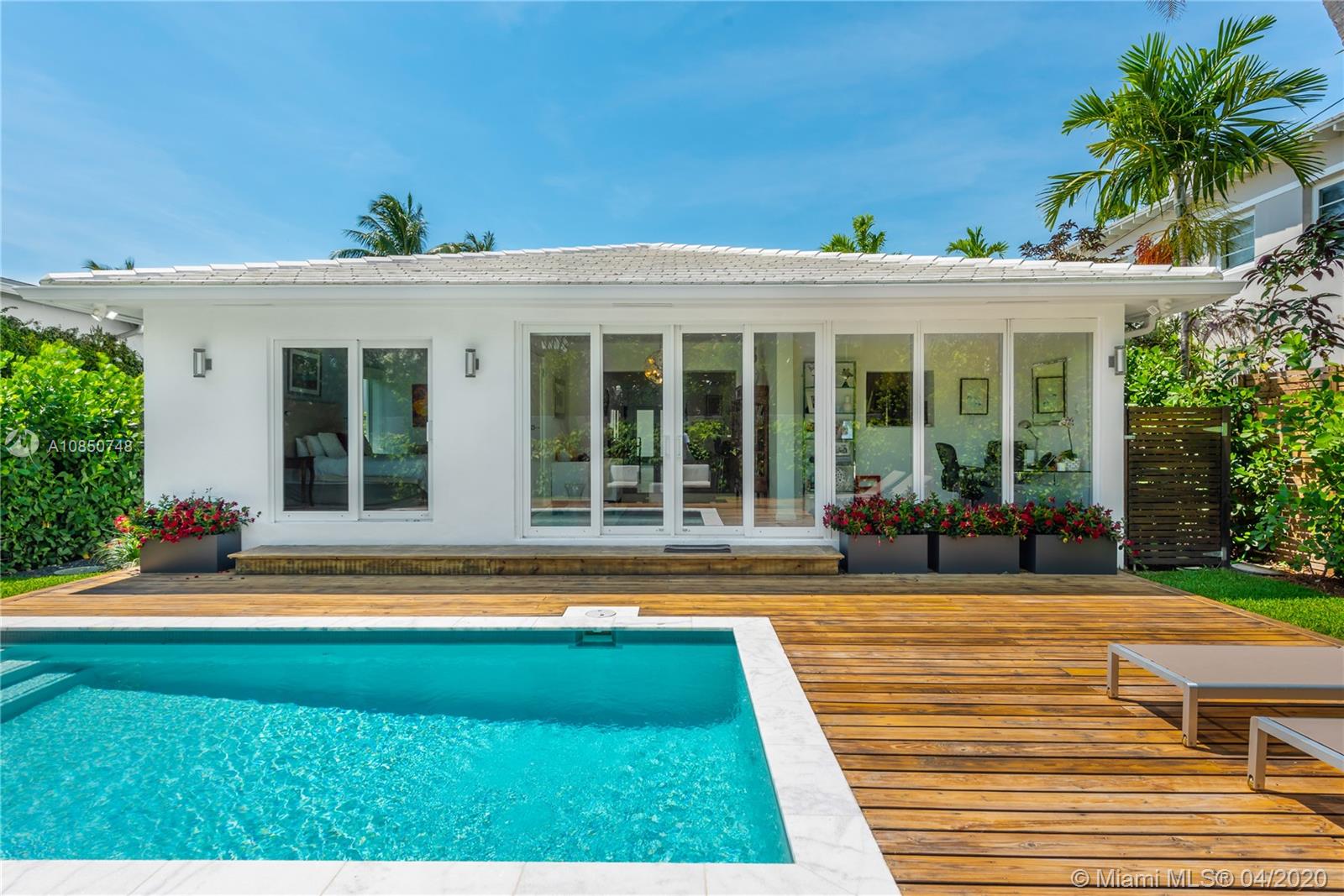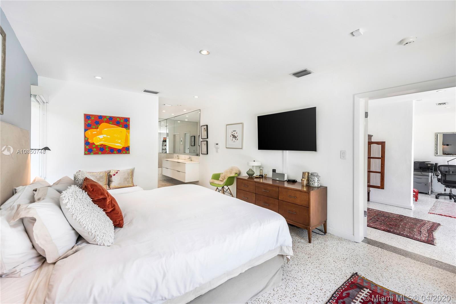 Contemporary Mid-Century pool home features light filled open-concept living with a museum-like aesthetic that resonates throughout. Flowing grand living spaces showcase the ultimate curated gallery wall. Brilliant terrazzo floors throughout contribute to the airy ambience. Modern eat-in kitchen offers Carrera marble counters & S.S. appliances w/ gas stove & custom cabinetry. Tropical landscaping hedges a private & tranquil backyard oasis w/ pinewood deck & white Thassos Marble Pool. Family friendly split floor plan + separate office/den. 1 car garage offers built in storage & laundry. Other features include, new roof, high impact glass windows & doors. Located on the best street in coveted Lakeview neighborhood.