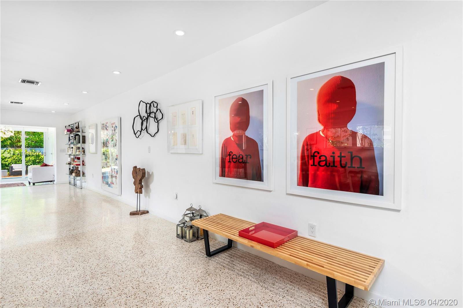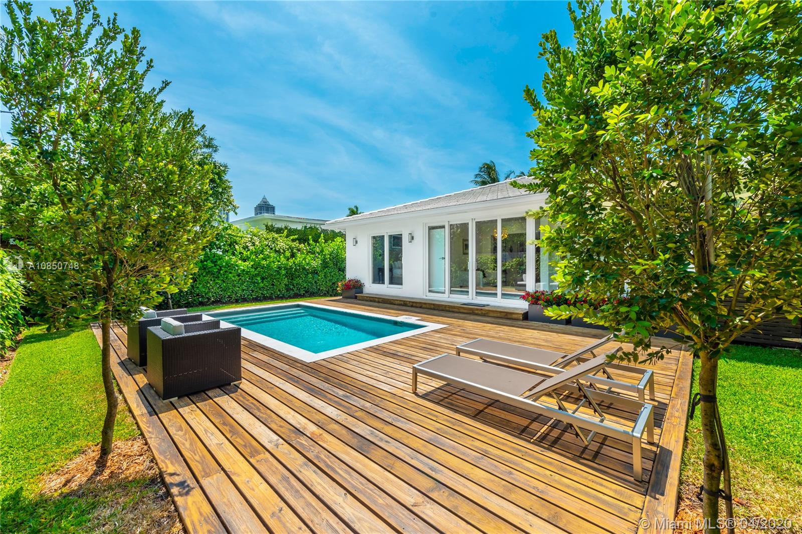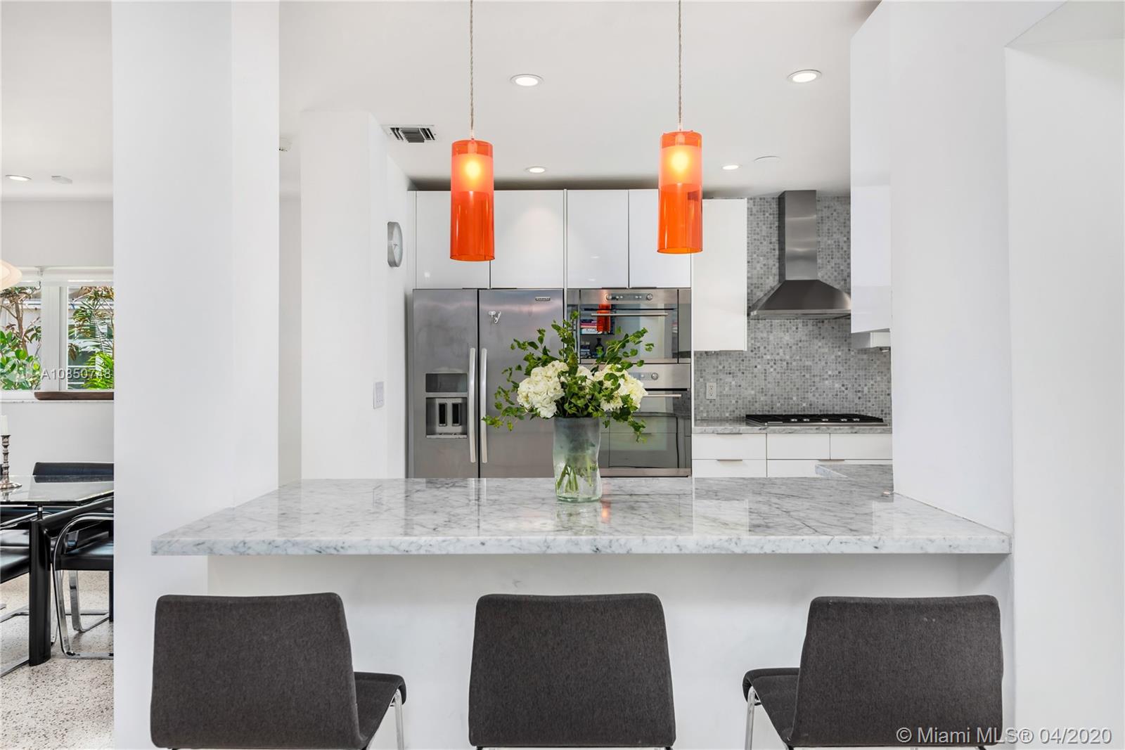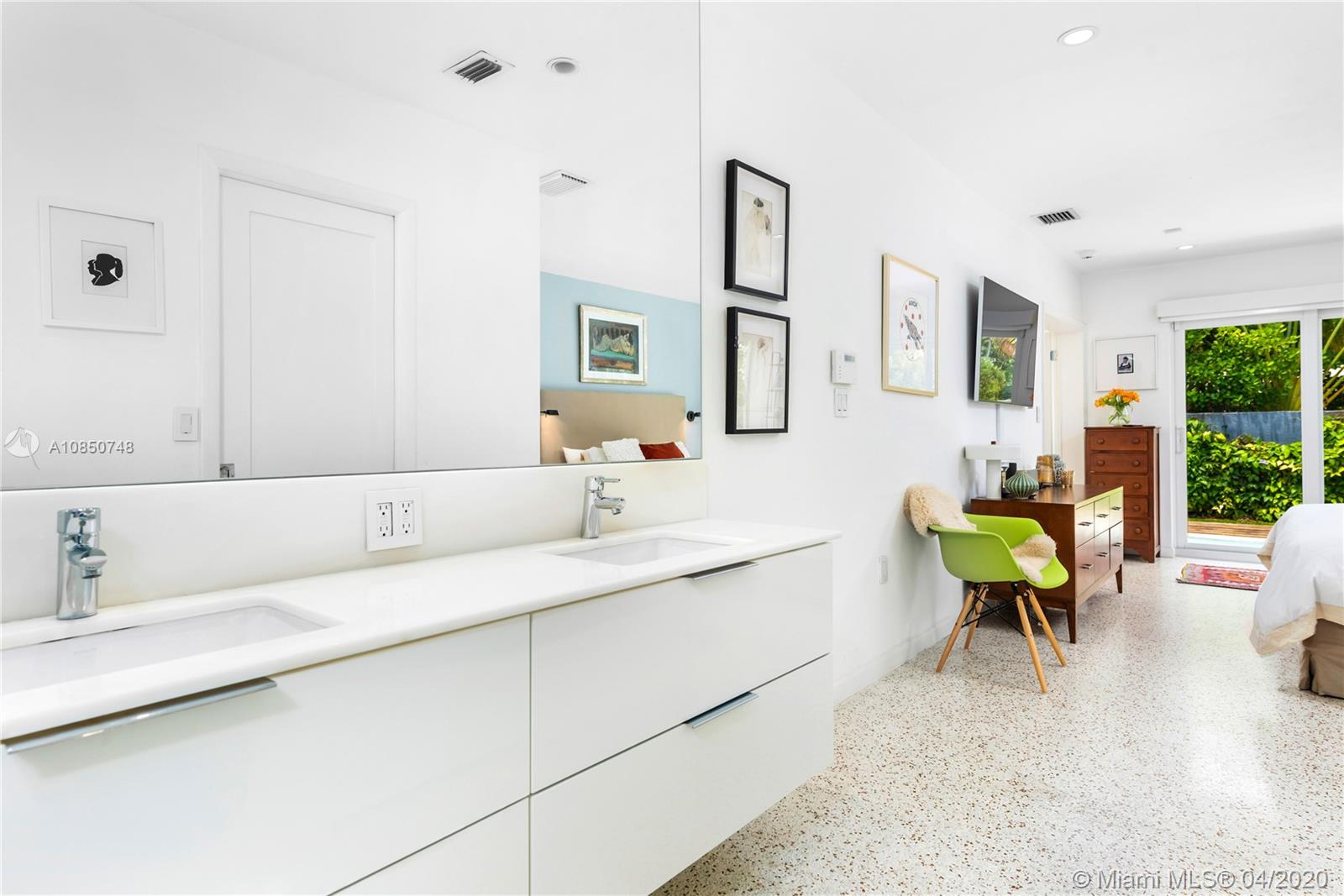 Contemporary Mid-Century pool home features light filled open-concept living with a museum-like aesthetic that resonates throughout. Flowing grand living spaces showcase the ultimate curated gallery wall. Brilliant terrazzo floors throughout contribute to the airy ambience. Modern eat-in kitchen offers Carrera marble counters & S.S. appliances w/ gas stove & custom cabinetry. Tropical landscaping hedges a private & tranquil backyard oasis w/ pinewood deck & white Thassos Marble Pool. Family friendly split floor plan + separate office/den. 1 car garage offers built in storage & laundry. Other features include, new roof, high impact glass windows & doors. Located on the best street in coveted Lakeview neighborhood.